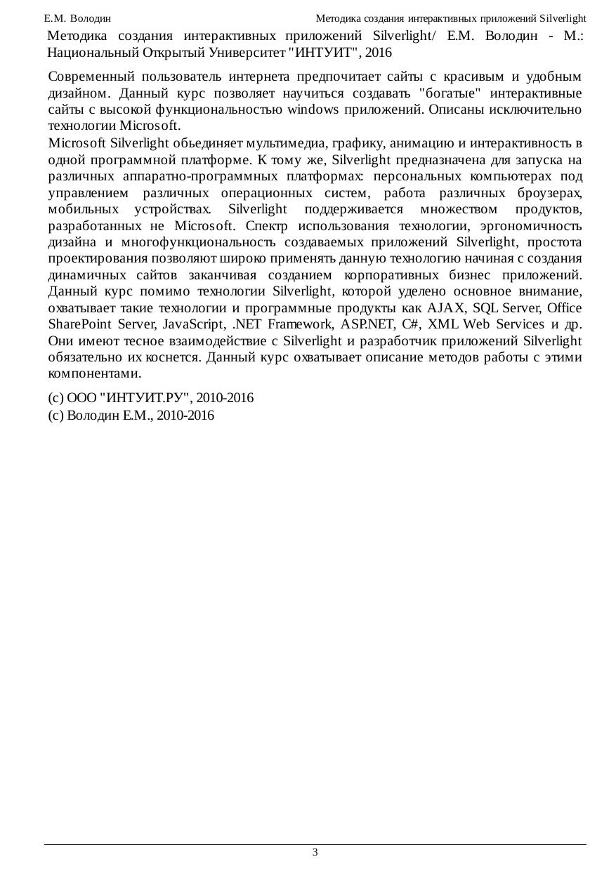 мобильных устройствах. Silverlight поддерживается множеством продуктов, разработанных не Microsoft. Спектр использования технологии, эргономичность дизайна и многофункциональность создаваемых приложений Silverlight, простота проектирования позволяют широко применять данную технологию начиная с создания динамичных сайтов заканчивая созданием корпоративных бизнес приложений. Данный курс помимо технологии Silverlight, которой уделено основное внимание, охватывает такие технологии и программные продукты как AJAX, SQL Server, Office