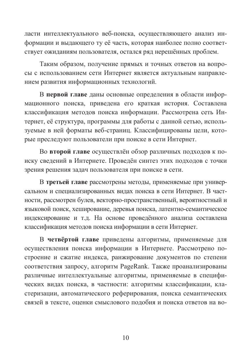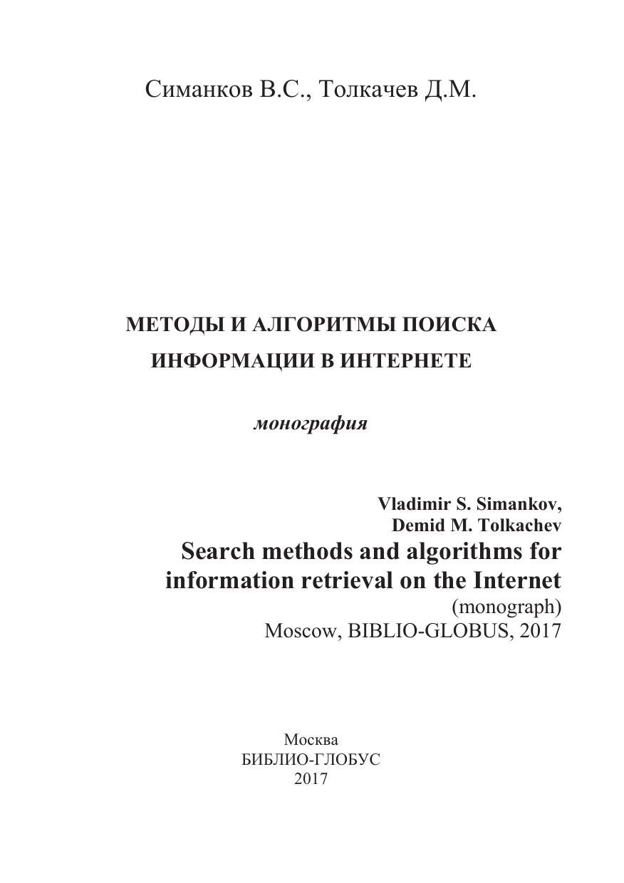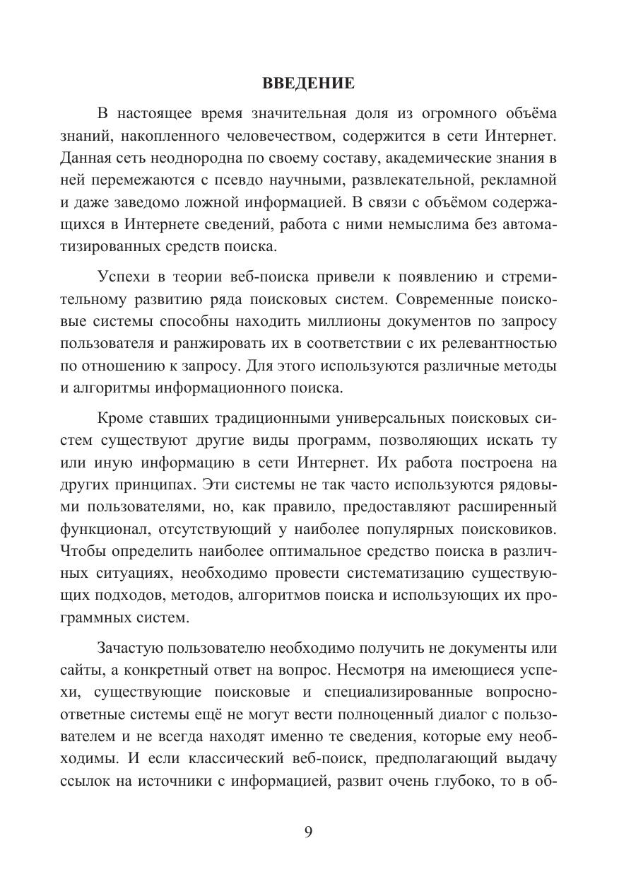 В монографии рассмотрены вопросы поиска информации в сети Интернет. Проведён анализ существующих подходов к решению этих вопросов, применяемых при этом методов и алгоритмов. Приведены универсальные и специализированные программные средства и системы, осуществляющие поиск информации в глобальной сети, указаны их достоинства и недостатки. Классифицированы подходы, методы, алгоритмы и использующие их системы поиска информации в сети, а также предложен оригинальный подход к поиску ответов на вопросы в Интернете. Монография предназначена для научных сотрудников и специалистов в области информационного поиска. Ключевые слова: алгоритмы поиска, поиск информации, поисковые системы, сеть Интернет, концептуальные подходы и методы поиска, вопросноответные системы.