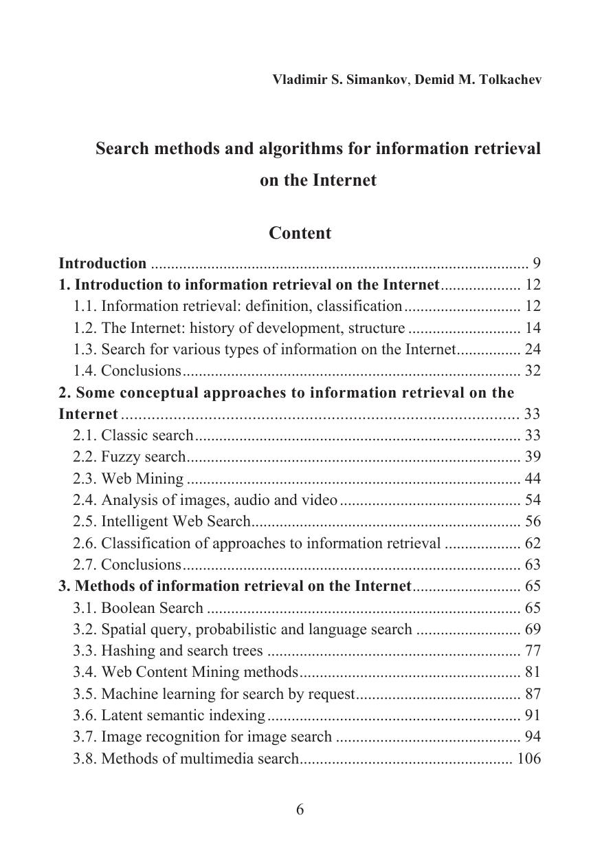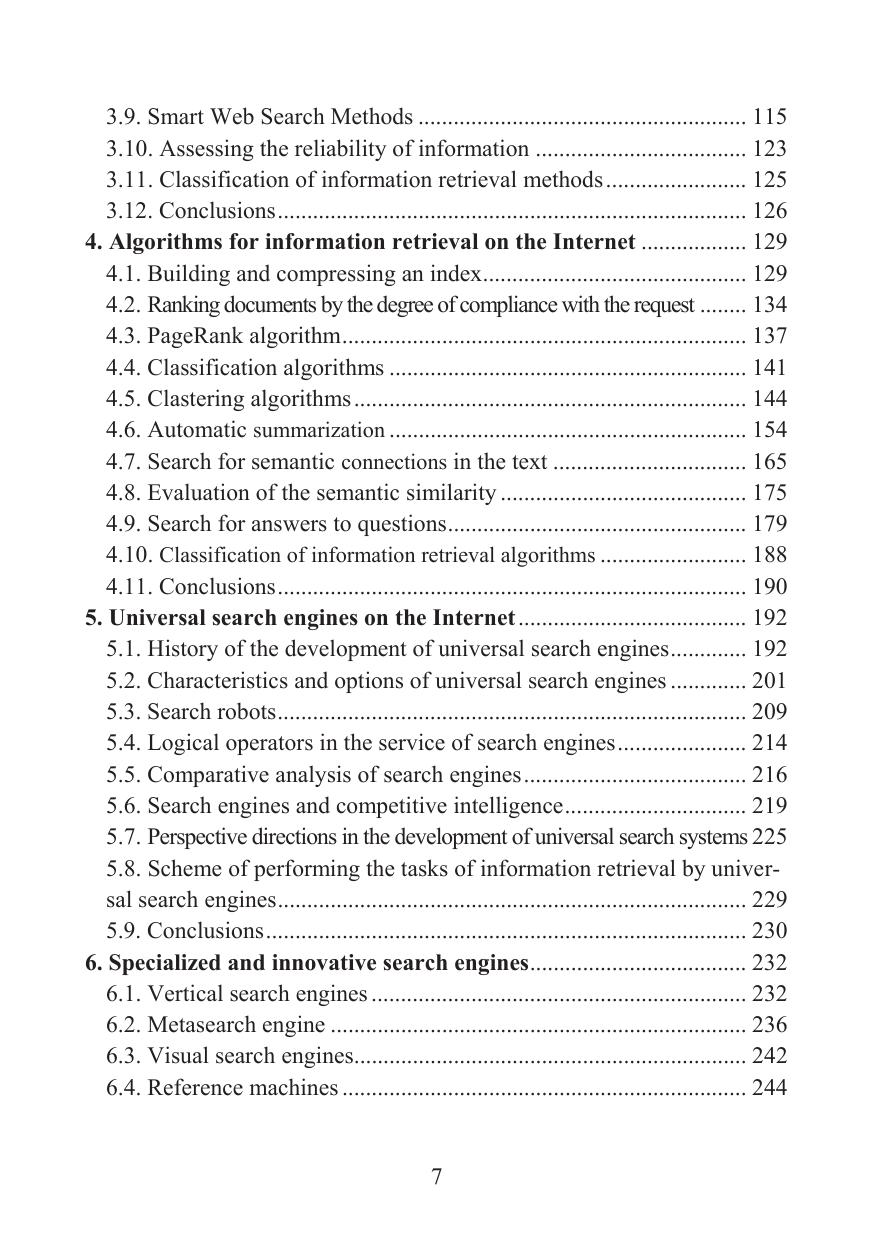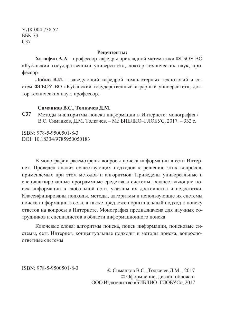 В монографии рассмотрены вопросы поиска информации в сети Интернет. Проведён анализ существующих подходов к решению этих вопросов, применяемых при этом методов и алгоритмов. Приведены универсальные и специализированные программные средства и системы, осуществляющие поиск информации в глобальной сети, указаны их достоинства и недостатки. Классифицированы подходы, методы, алгоритмы и использующие их системы поиска информации в сети, а также предложен оригинальный подход к поиску ответов на вопросы в Интернете. Монография предназначена для научных сотрудников и специалистов в области информационного поиска. Ключевые слова: алгоритмы поиска, поиск информации, поисковые системы, сеть Интернет, концептуальные подходы и методы поиска, вопросноответные системы.