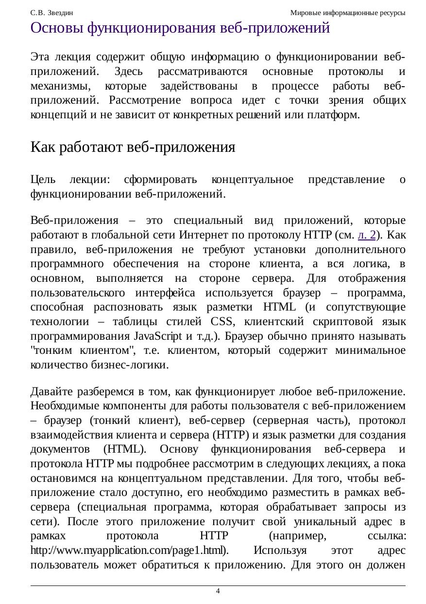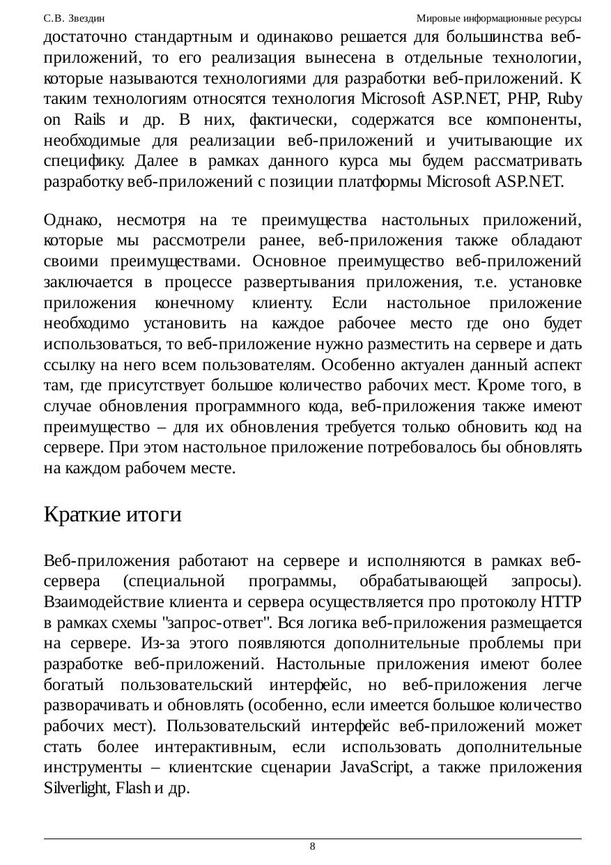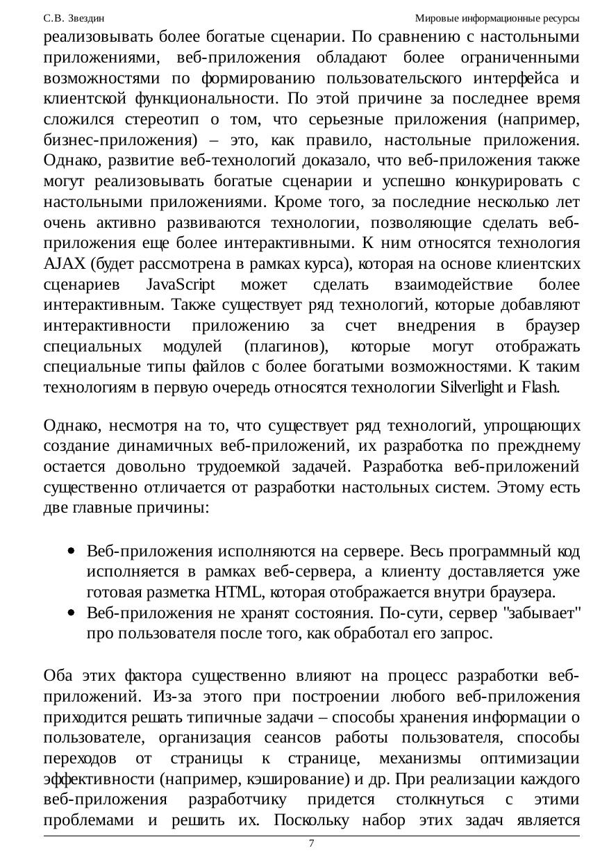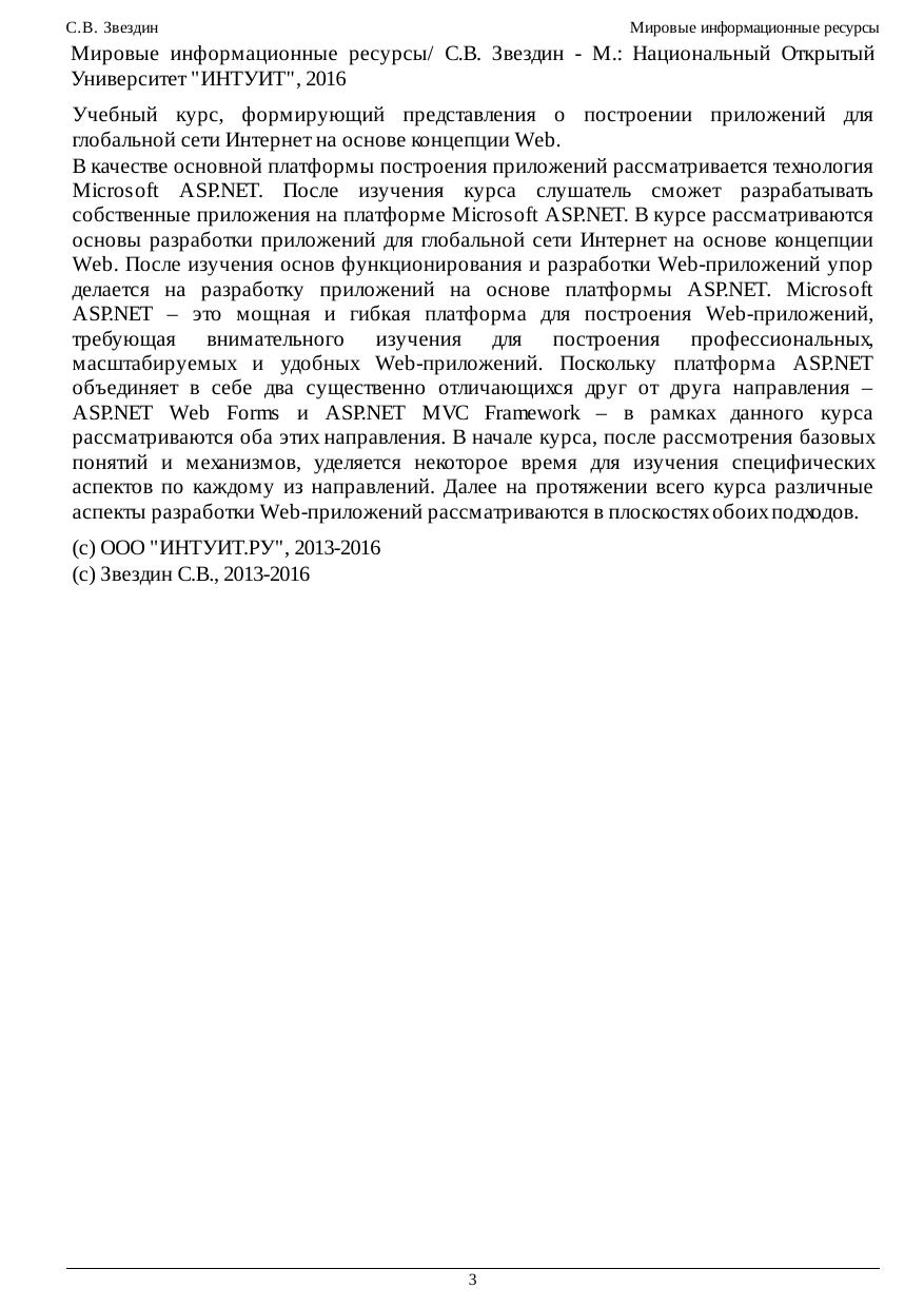 основы разработки приложений для глобальной сети Интернет на основе концепции Web. После изучения основ функционирования и разработки Web-приложений упор делается на разработку приложений на основе платформы ASP.NET. Microsoft ASP.NET – это мощная и гибкая платформа для построения Web-приложений, требующая внимательного изучения для построения профессиональных, масштабируемых и удобных Web-приложений. Поскольку платформа ASP.NET объединяет в себе два существенно отличающихся друг от друга направления – ASP.NET Web Forms и ASP.NET MVC Framework – в рамках данного курса рассматриваются оба этих направления. В начале курса, после рассмотрения базовых понятий и механизмов, уделяется некоторое время для изучения специфических аспектов по каждому из направлений. Далее на протяжении всего курса различные аспекты разработки Web-приложений рассматриваются в плоскостях обоих подходов.