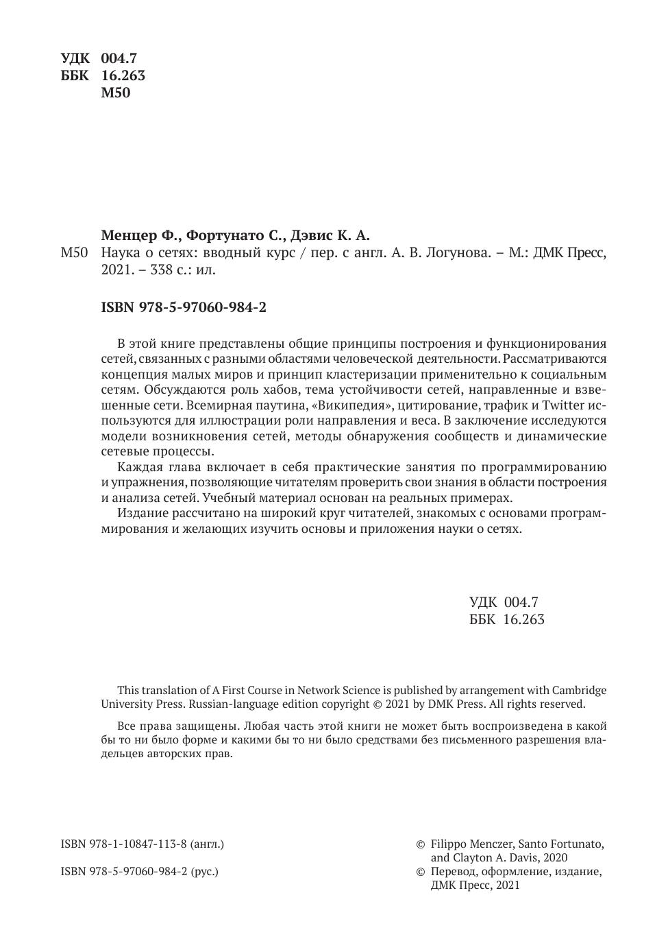 Каждая глава включает в себя практические занятия по программированию и упражнения, позволяющие читателям проверить свои знания в области построения и анализа сетей. Учебный материал основан на реальных примерах.