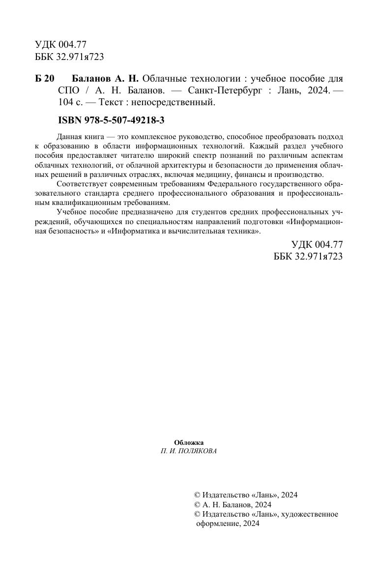 Данная книга — это комплексное руководство, способное преобразовать подход к образованию в области информационных технологий. Каждый раздел учебного пособия предоставляет читателю широкий спектр познаний по различным аспектам облачных технологий, от облачной архитектуры и безопасности до применения облачных решений в различных отраслях, включая медицину, финансы и производство. Соответствует современным требованиям Федерального государственного образовательного стандарта среднего профессионального образования и профессиональным квалификационным требованиям. Учебное пособие предназначено для студентов средних профессиональных учреждений, обучающихся по специальностям направлений подготовки «Информационная безопасность» и «Информатика и вычислительная техника».