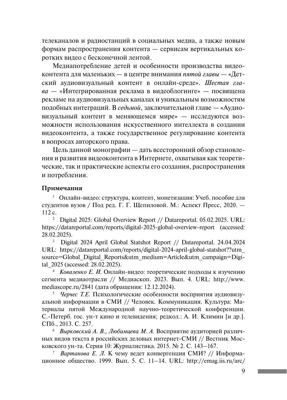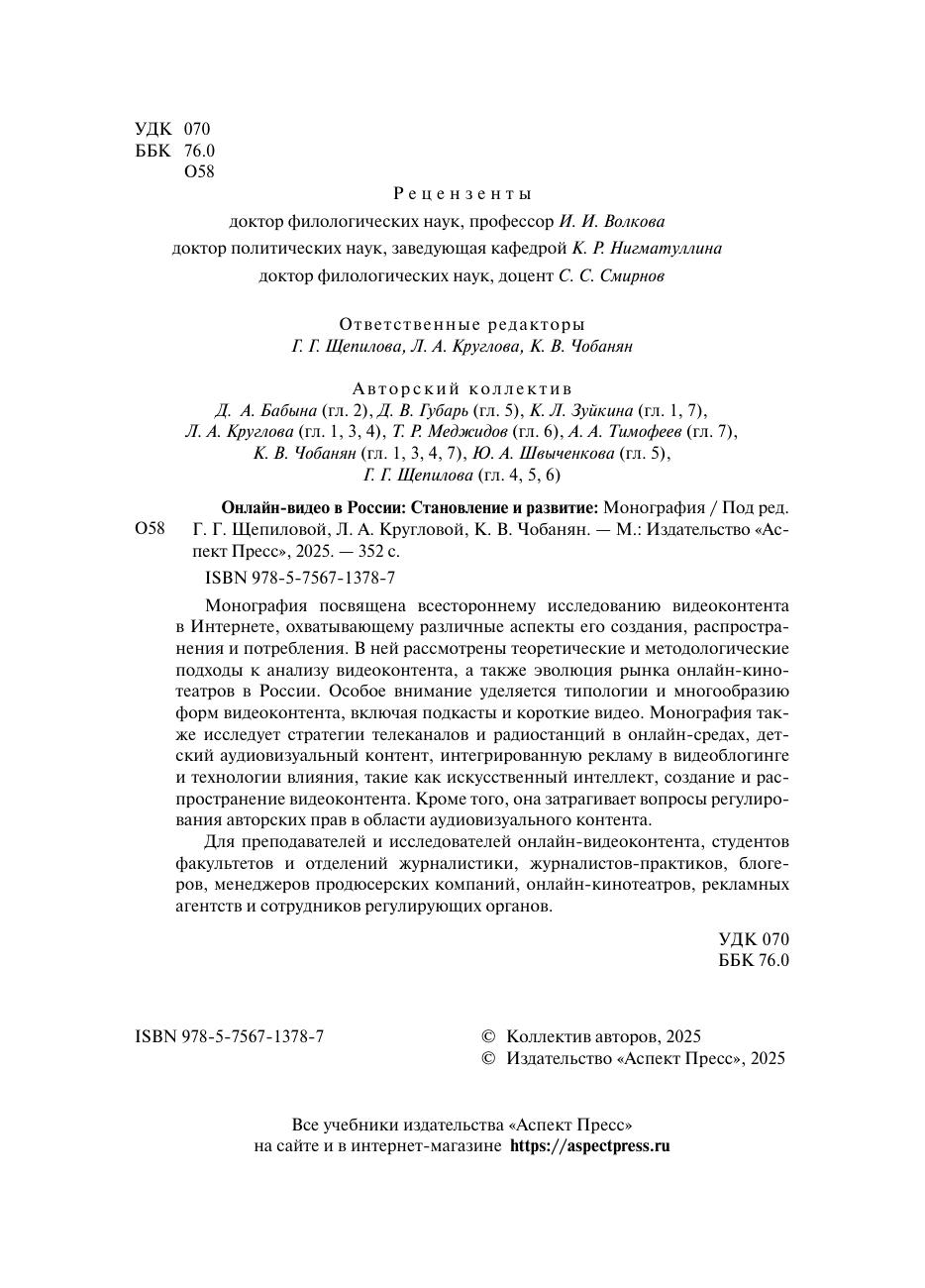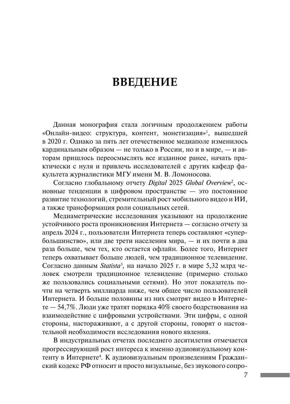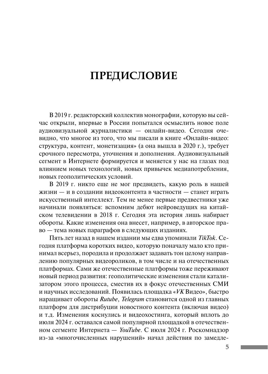 Монография посвящена всестороннему исследованию видеоконтента в Интернете, охватывающему различные аспекты его создания, распространения и потребления. В ней рассмотрены теоретические и методологические подходы к анализу видеоконтента, а также эволюция рынка онлайн-кинотеатров в России. Особое внимание уделяется типологии и многообразию форм видеоконтента, включая подкасты и короткие видео. Монография также исследует стратегии телеканалов и радиостанций в онлайн-средах, детский аудиовизуальный контент, интегрированную рекламу в видеоблогинге и технологии влияния, такие как искусственный интеллект, создание и распространение видеоконтента. Кроме того, она затрагивает вопросы регулирования авторских прав в области аудиовизуального контента. Для преподавателей и исследователей онлайн-видеоконтента, студентов факультетов и отделений журналистики, журналистов-практиков, блогеров, менеджеров продюсерских компаний, онлайн-кинотеатров, рекламных агентств и сотрудников регулирующих органов.