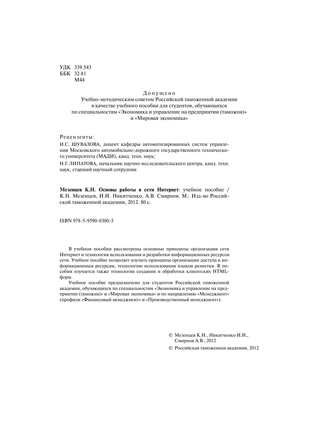В учебном пособии рассмотрены основные принципы организации сети Интернет и технология использования и разработки информационных ресурсов сети. Учебное пособие позволяет изучить принципы организации доступа к информационным ресурсам, технологию использования языков разметки. В пособии изучается также технология создания и обработки клиентских НТМХ-форм. Учебное пособие предназначено для студентов Российской таможенной академии, обучающихся по специальностям «Экономика и управление на предприятии (таможня)» и «Мировая экономика» и по направлению «Менеджмент» (профили «Финансовый менеджмент» и «Производственный менеджмент»).