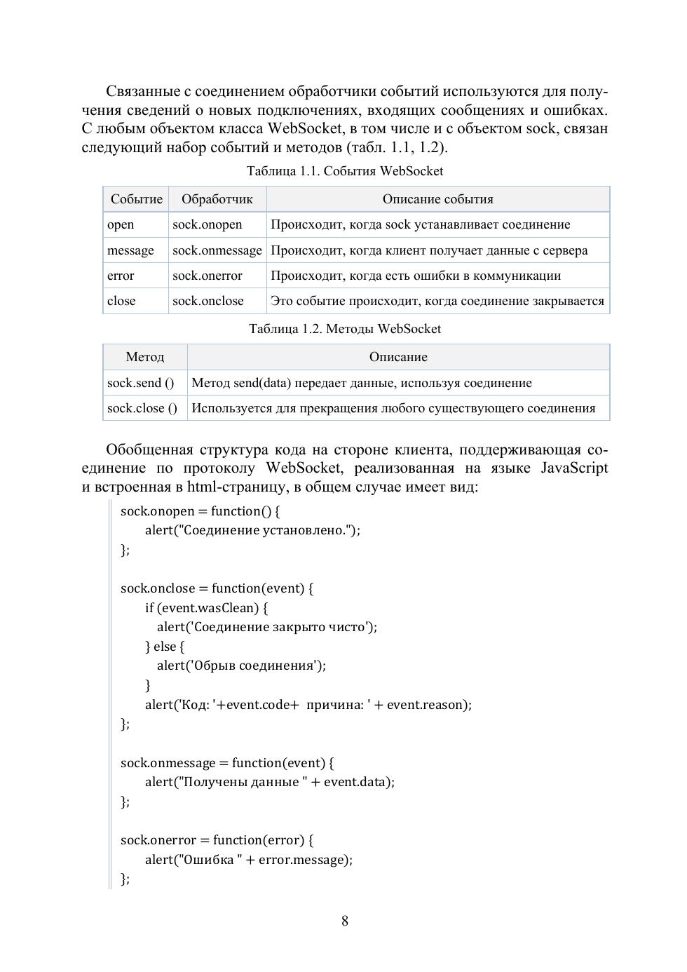 Пособие дает представление о проектировании клиент-серверных систем, использующих технологию WebSocket — двунаправленной асинхронной симметричной связи между браузером и сервером, самого революционного расширения протокола HTTP с момента его появления. Протокол WebSocket поддерживается практически всеми современными браузерами, в нем клиент и сервер являются равноправными участниками обмена данными, в отличие от HTTP протокола, построенного по модели «запрос — ответ». В учебном пособии даны методические указания к лабораторным работам, назначение которых — освоить методы построени WebSocket клиент серверных приложений, в которых сервер реализуется в операционных системах MS Windows и Linux Ubuntu на основных совре менных языках: JScript, VBScript, Python, Perl, PHP bash, есть примеры использования C#, Java, С. В примерах и лабораторных работах показаны разработки наиболее востребованных и распространенных случаев клиент-серверного обмена данными: эхо сервер, файловый обмен, секундомер, социальный чат, при этом используется технология доступа по протоколу ssh к серверу, находящемуся на виртуальной машине, а сам WebSocket сервер реализован как с использованием утилиты WebSocketD, так и средствами каждого конкретного языка. В конце каждого раздела пособия есть кон трольные вопросы для закрепления материала. Соответствует современным требованиям Федерального государственного образовательного стандарта среднего профессионального образования и профессиональным квалификационным требованиям. Предназначено для студентов средних профессиональных учреждений, обучающихся по специальностям направлений подготовки «Информационная безопасность» и «Информатика и вычислительная техника».