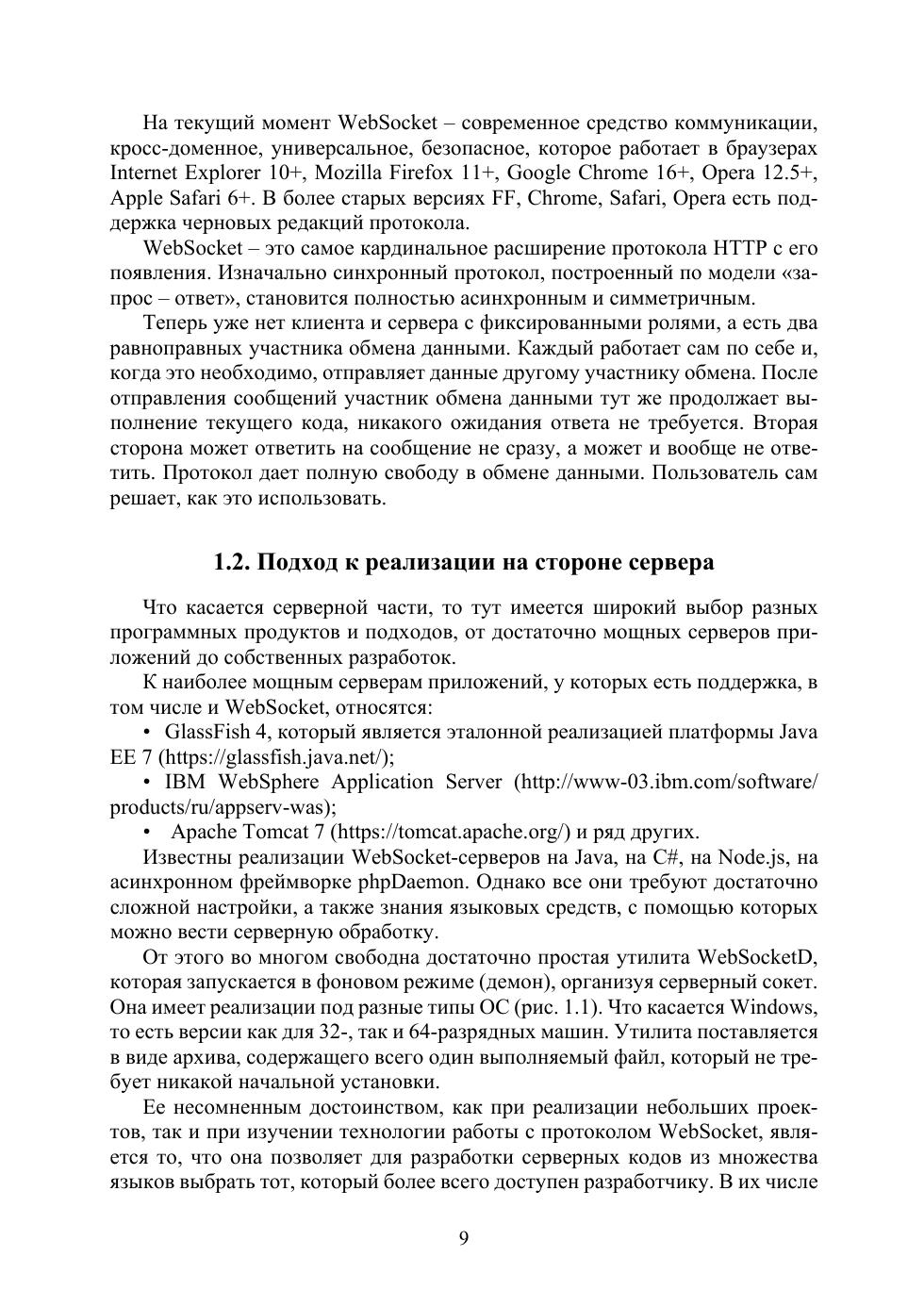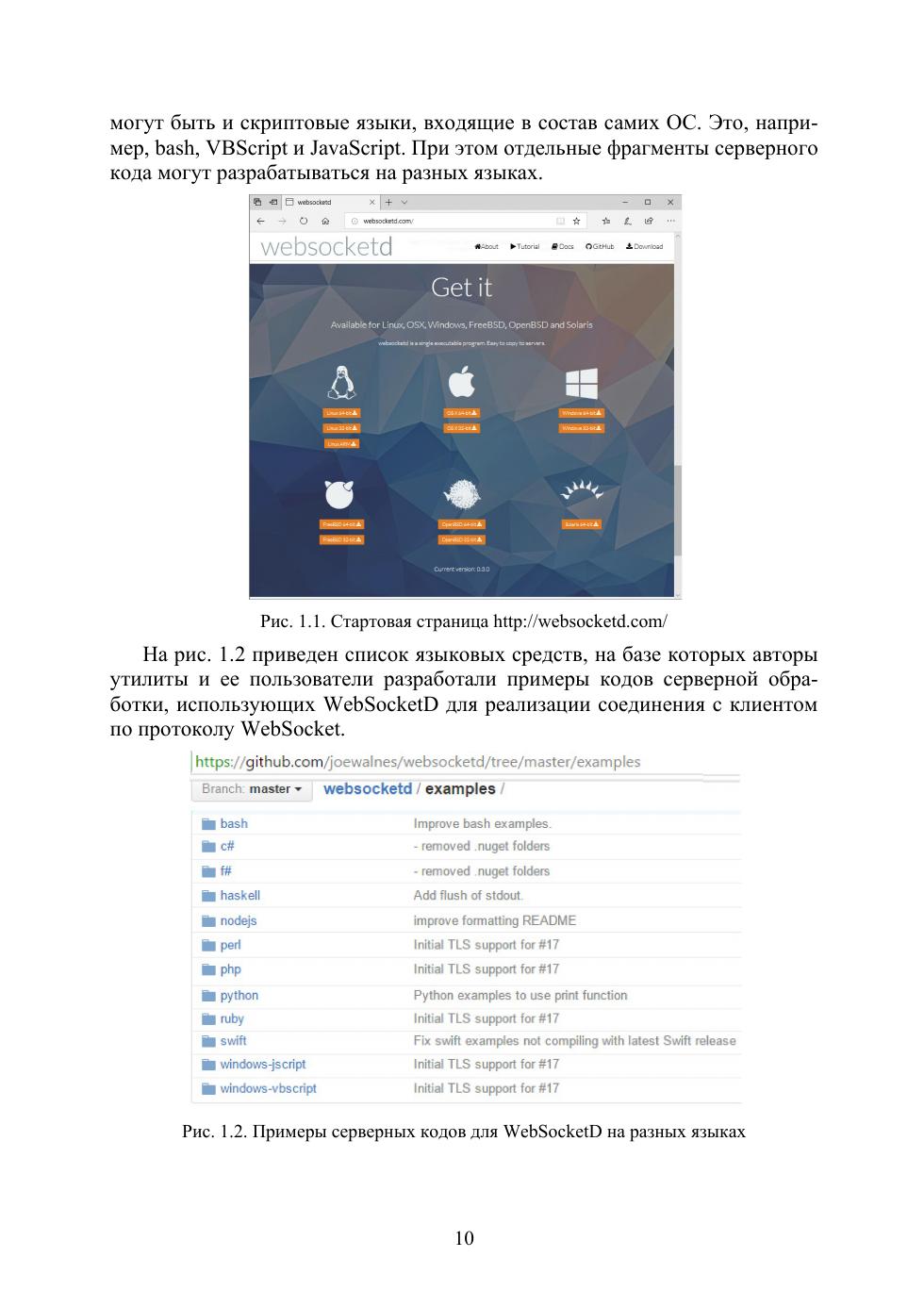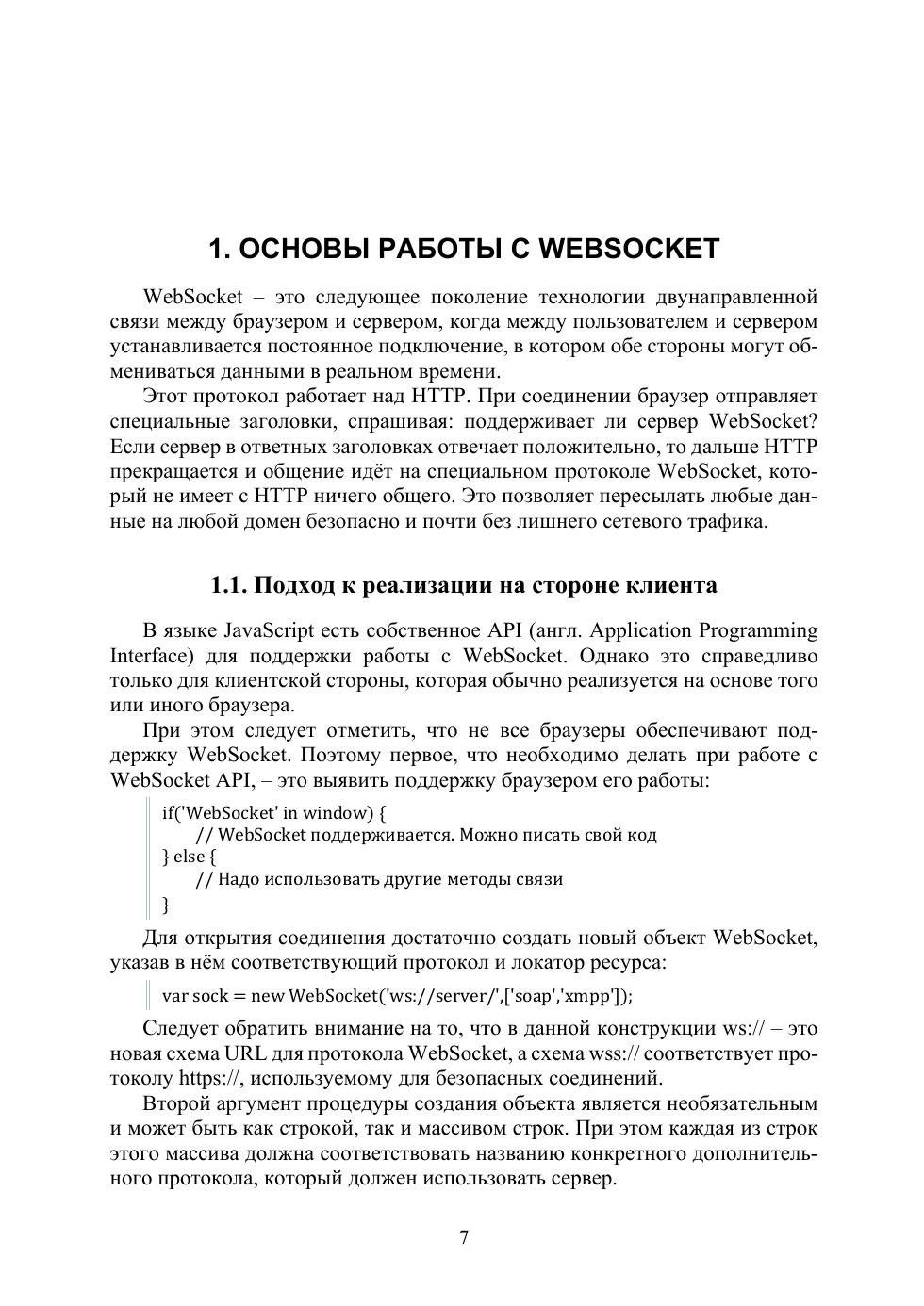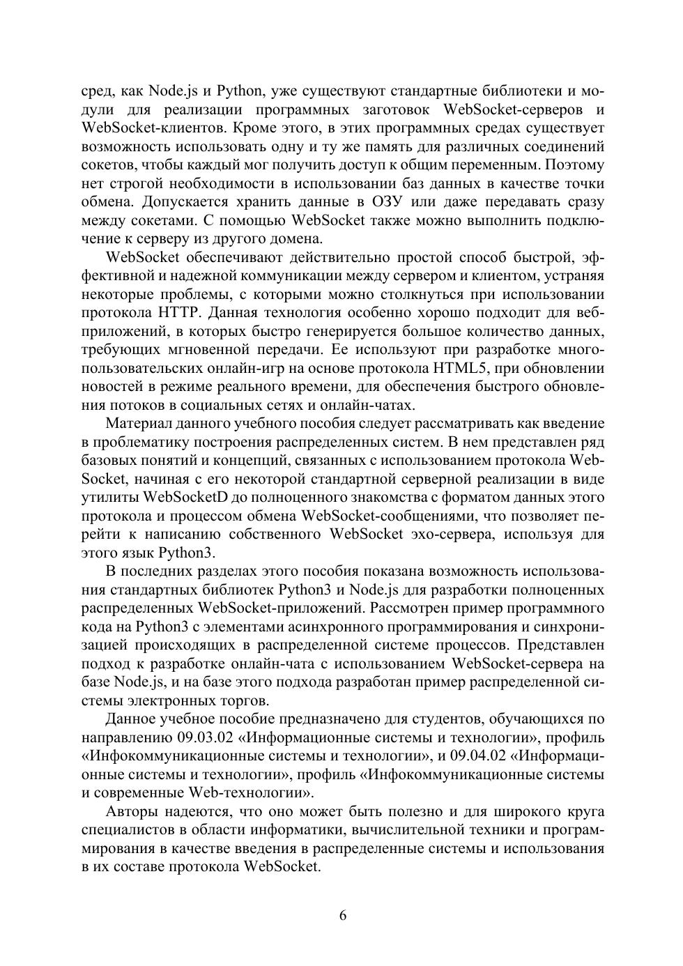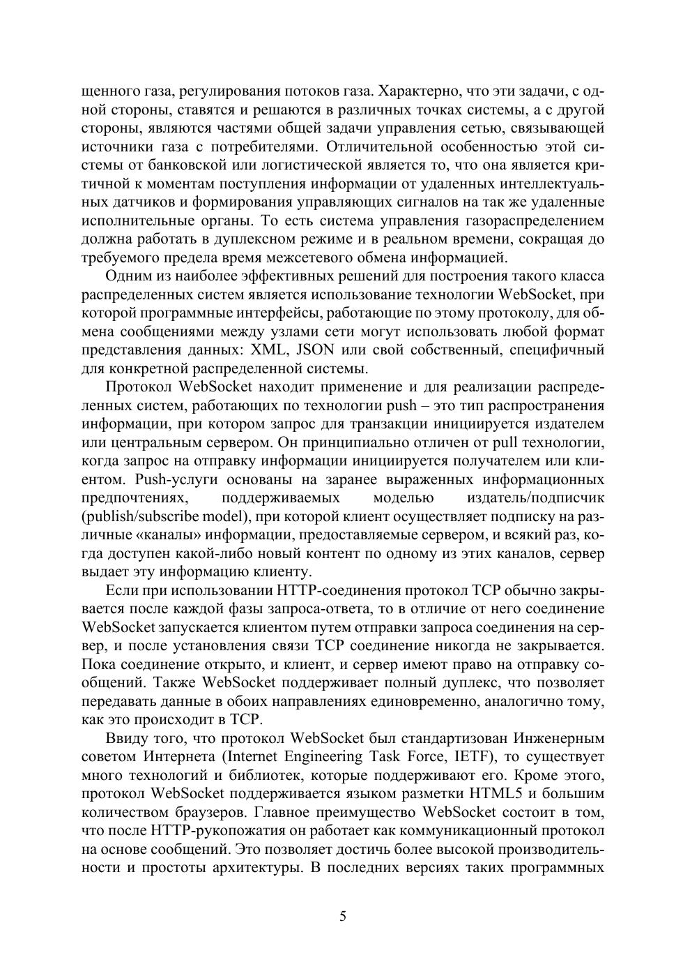 Пособие дает представление о проектировании клиент-серверных систем, использующих технологию WebSocket — двунаправленной асинхронной симметричной связи между браузером и сервером, самого революционного расширения протокола HTTP с момента его появления. Протокол WebSocket поддерживается практически всеми современными браузерами, в нем клиент и сервер являются равноправными участниками обмена данными, в отличие от HTTP-протокола, построенного по модели «запрос — ответ». В учебном пособии даны методические указания к лабораторным работам, назначение которых — освоить методы построения WebSocket клиент-серверных приложений, в которых сервер реализуется в операционных системах MS Windows и Linux Ubuntu на основных современных языках: JScript, VBScript, Python, Perl, PHP bash, есть примеры использования C#, Java, С. В примерах и лабораторных работах показаны разработки наиболее востребованных и распространенных случаев клиент-серверного обмена данными: эхо-сервер, файловый обмен, секундомер, социальный чат, при этом используется технология доступа по протоколу ssh к серверу, находящемуся на виртуальной машине, а сам WebSocket сервер реализован как с использованием утилиты WebSocketD, так и средствами каждого конкретного языка. В конце каждого раздела пособия есть контрольные вопросы для закрепления материала. Предназначено для магистров направления 09.04.02 и студентов других специальностей, связанных с прикладной математикой и информатикой, а также программистам-разработчикам и всем заинтересованным в области веб-серверной разработки лицам.