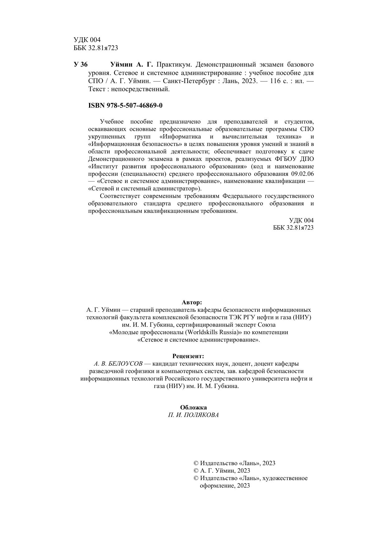 Учебное пособие предназначено для преподавателей и студентов, осваивающих основные профессиональные образовательные программы СПО укрупненных групп «Информатика и вычислительная техника» и «Информационная безопасность» в целях повышения уровня умений и знаний в области профессиональной деятельности, обеспечивает подготовку к сдаче Демонстрационного экзамена в рамках проектов, реализуемых ФГБОУ ДПО «Институт развития профессионального образования» (код и наименование профессии (специальности) среднего профессионального образования 09.02.06 — «Сетевое и системное администрирование», наименование квалификации — «Сетевой и системный администратор»). Соответствует современным требованиям Федерального государственного образовательного стандарта среднего профессионального образования и профессиональным квалификационным требованиям.