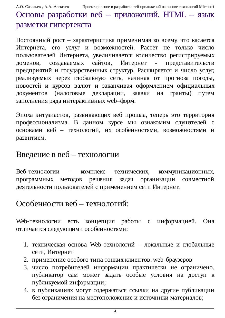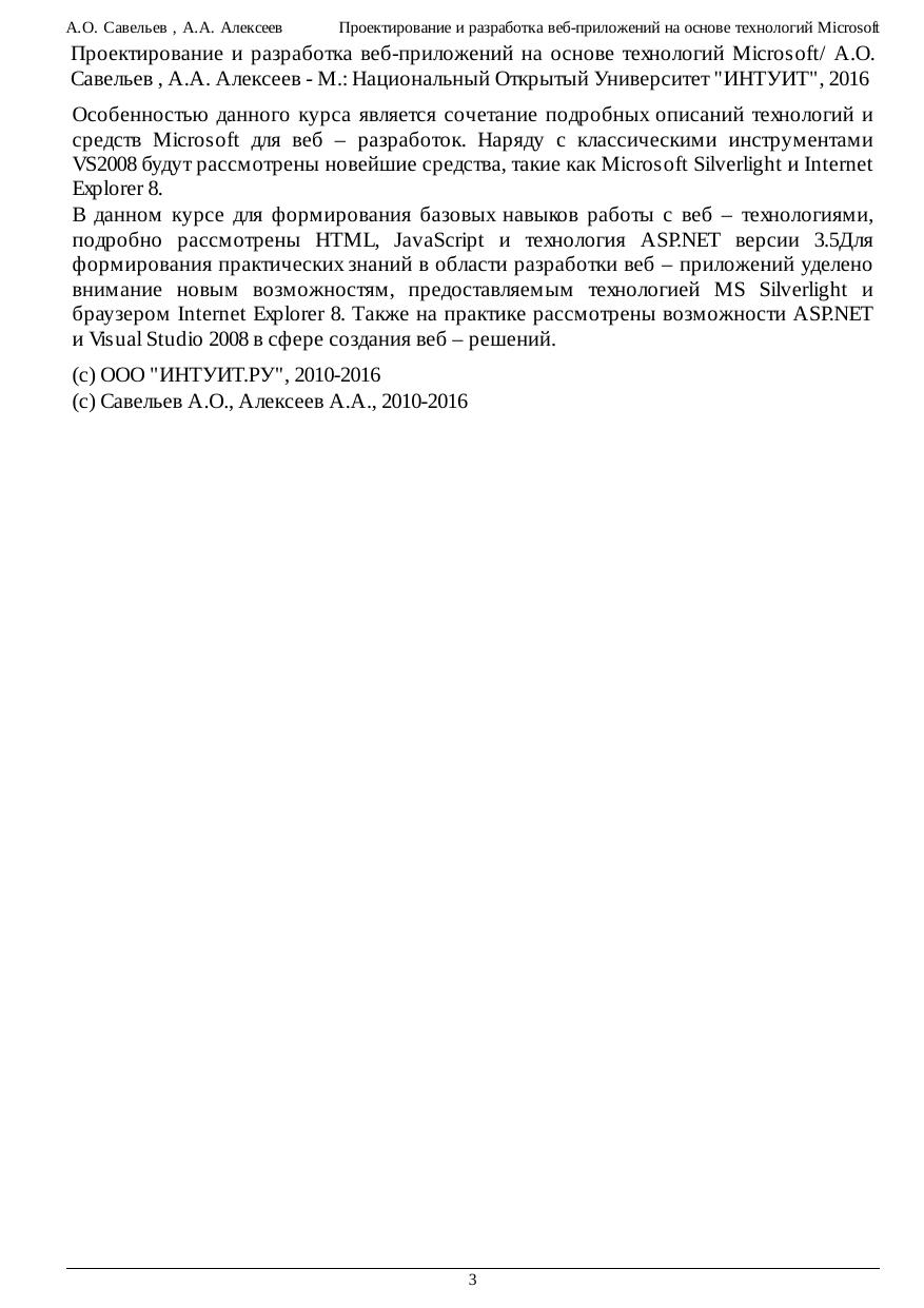 Особенностью данного курса является сочетание подробных описаний технологий и средств Microsoft для веб – разработок. Наряду с классическими инструментами VS2008 будут рассмотрены новейшие средства, такие как Microsoft Silverlight и Internet