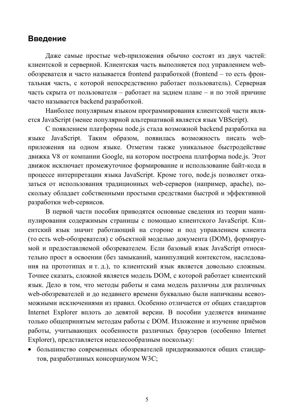 Изложены основы работы с объектной моделью документа, положенной в основу динамического формирования и изменения содержимого HTML страниц, с помощью языка программирования JavaScript и библиотеки jQuery. Рассматриваются основы backend разработки web-приложений программирования на стороне сервера на платформе node.js. Для закрепления и более глубокого изучения теоретического материала рассмотрен пример разработки приложения для выполнения простейших расчетов на серверной стороне и динамического формирования содержимого HTML-страниц с результатами этих расчетов в табличном и графическом виде на стороне клиента. Предполагается, что читатель владеет основами языков HTML, CSS и базового языка JavaScript.