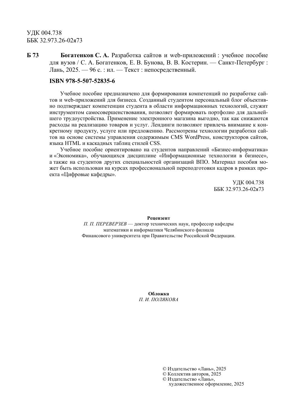 Учебное пособие предназначено для формирования компетенций по разработке сайтов и web-приложений для бизнеса. Созданный студентом персональный блог объективно подтверждает компетенции студента в области информационных технологий, служит инструментом самосовершенствования, позволяет формировать портфолио для дальнейшего трудоустройства. Применение электронного магазина выгодно, так как снижаются расходы на реализацию товаров и услуг. Лендинги позволяют привлечь внимание к конкретному продукту, услуге или предложению. Рассмотрены технологии разработки сайтов на основе системы управления содержимым CMS WordPress, конструкторов сайтов, языка HTML и каскадных таблиц стилей CSS. Учебное пособие ориентировано на студентов направлений «Бизнес-информатика» и «Экономика», обучающихся дисциплине «Информационные технологии в бизнесе», а также на студентов других специальностей организаций ВПО. Материал пособия может быть использован на курсах профессиональной переподготовки кадров в рамках проекта «Цифровые кафедры».