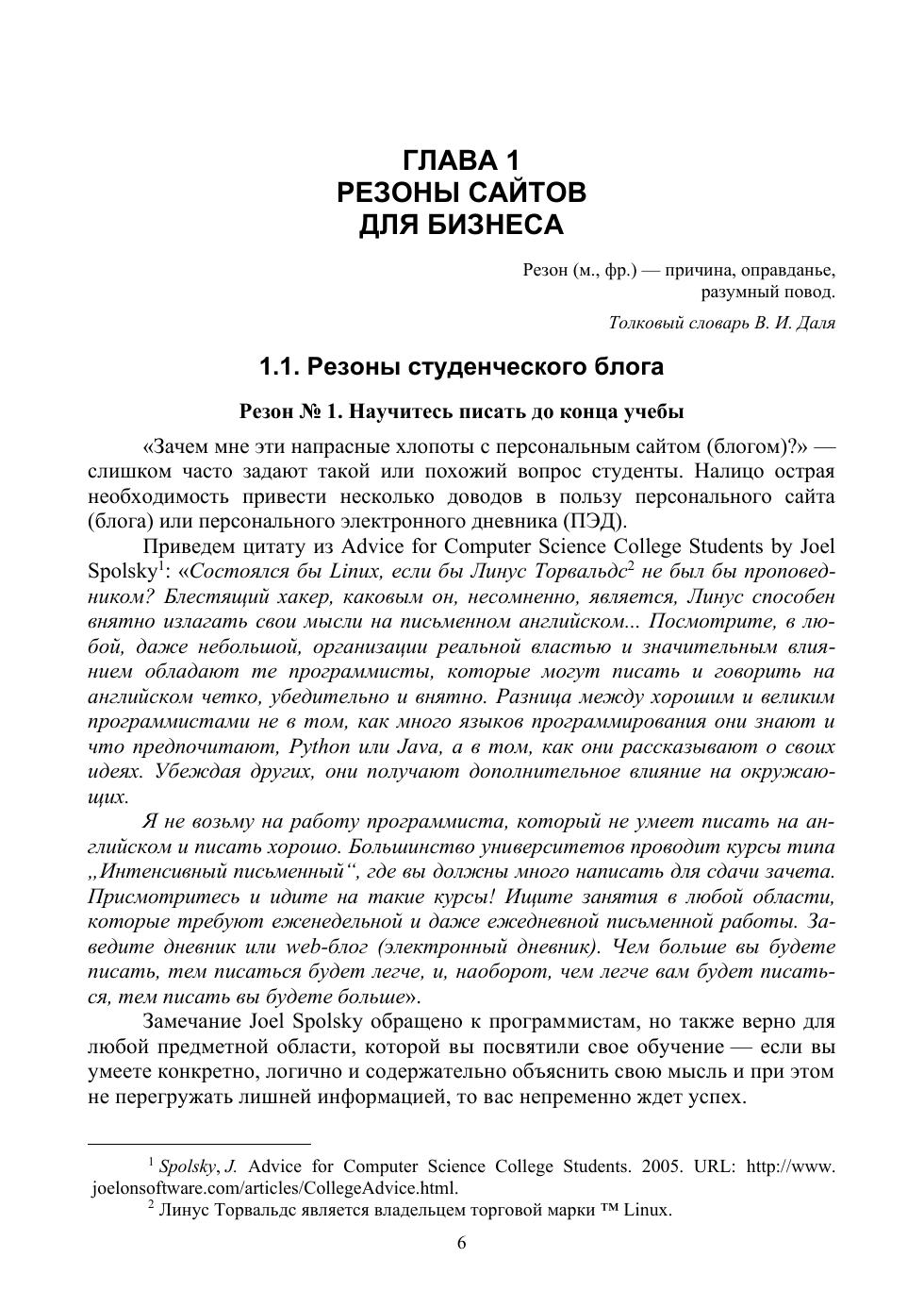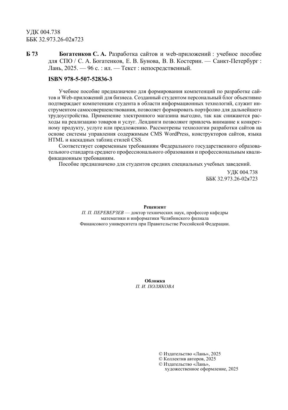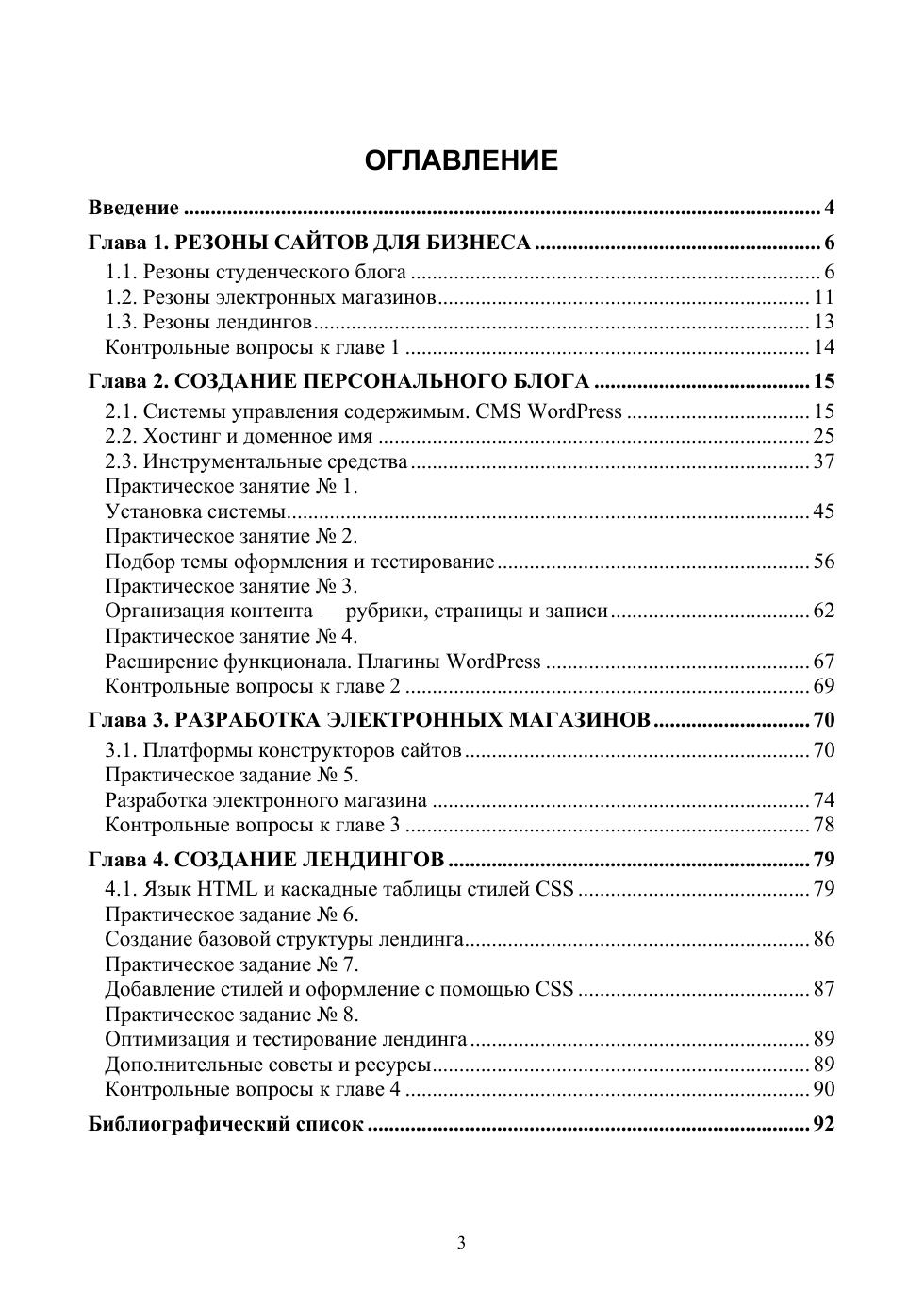Учебное пособие предназначено для формирования компетенций по разработке сайтов и Web-приложений для бизнеса. Созданный студентом персональный блог объективно подтверждает компетенции студента в области информационных технологий, служит инструментом самосовершенствования, позволяет формировать портфолио для дальнейшего трудоустройства. Применение электронного магазина выгодно, так как снижаются расходы на реализацию товаров и услуг. Лендинги позволяют привлечь внимание к конкретному продукту, услуге или предложению. Рассмотрены технологии разработки сайтов на основе системы управления содержимым CMS WordPress, конструкторов сайтов, языка HTML и каскадных таблиц стилей CSS. Соответствует современным требованиям Федерального государственного образовательного стандарта среднего профессионального образования и профессиональным квалификационным требованиям. Пособие предназначено для студентов средних специальных учебных заведений.