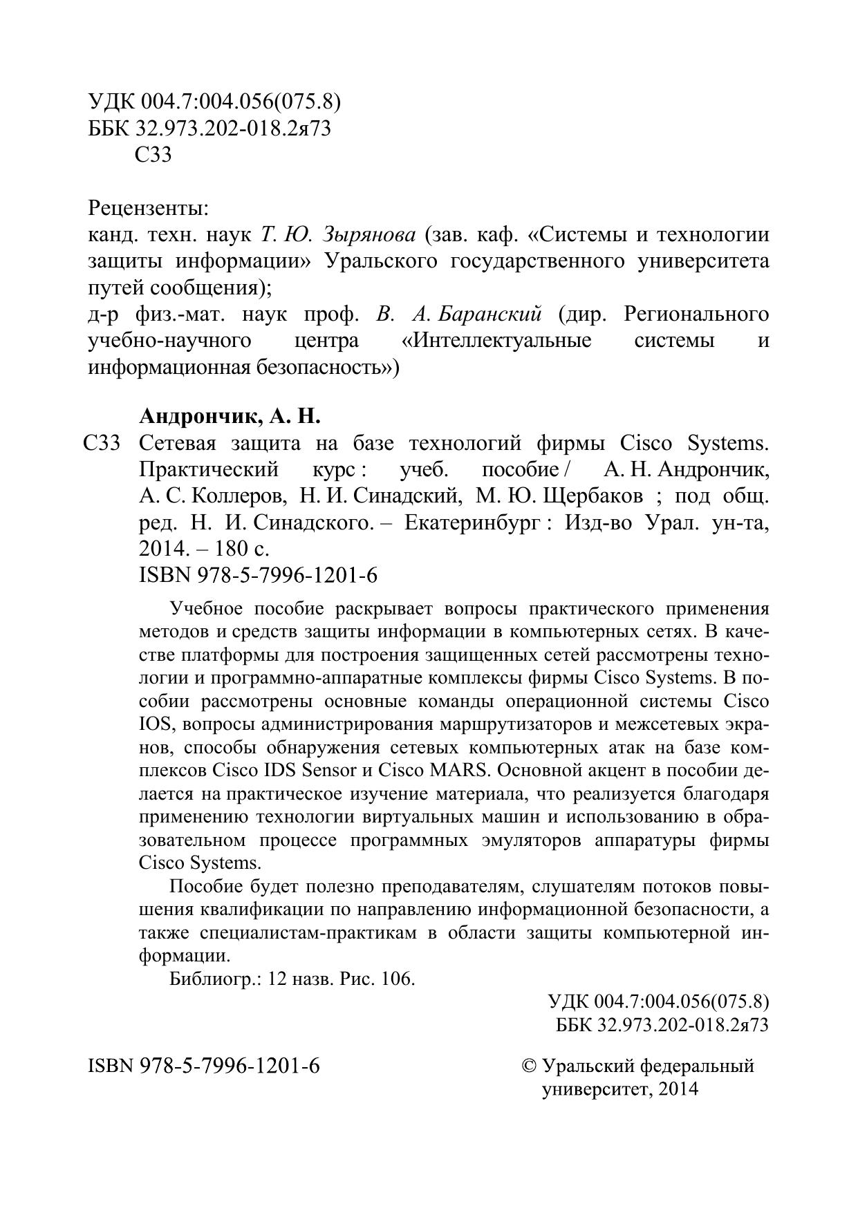 Учебное пособие раскрывает вопросы практического применения методов и средств защиты информации в компьютерных сетях. В качестве платформы для построения защищенных сетей рассмотрены технологии и программно-аппаратные комплексы фирмы Cisco Systems. В пособии рассмотрены основные команды операционной системы Cisco IOS, вопросы администрирования маршрутизаторов и межсетевых экранов, способы обнаружения сетевых компьютерных атак на базе комплексов Cisco IDS Sensor и Cisco MARS. Основной акцент в пособии делается на практическое изучение материала, что реализуется благодаря применению технологии виртуальных машин и использованию в образовательном процессе программных эмуляторов аппаратуры фирмы Cisco Systems. Пособие будет полезно преподавателям, слушателям потоков повышения квалификации по направлению информационной безопасности, а также специалистам-практикам в области защиты компьютерной информации.