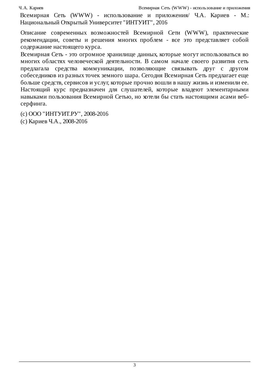 Описание современных возможностей Всемирной Сети (WWW), практические рекомендации, советы и решения многих проблем - все это представляет собой содержание настоящего курса.