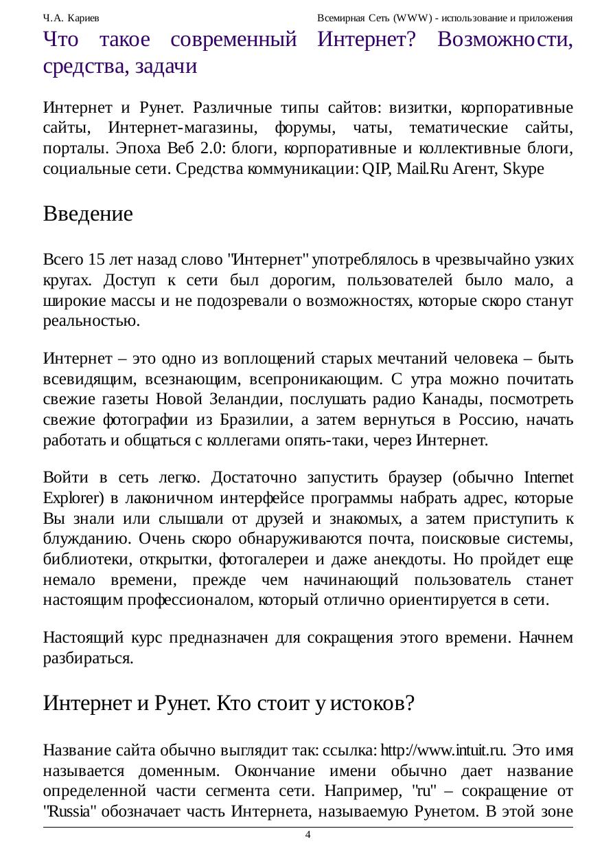 Всемирная Сеть - это огромное хранилище данных, которые могут использоваться во многих областях человеческой деятельности. В самом начале своего развития сеть предлагала средства коммуникации, позволяющие связывать друг с другом собеседников из разных точек земного шара. Сегодня Всемирная Сеть предлагает еще больше средств, сервисов и услуг, которые прочно вошли в нашу жизнь и изменили ее. Настоящий курс предназначен для слушателей, которые владеют элементарными навыками пользования Всемирной Сетью, но хотели бы стать настоящими асами веб-