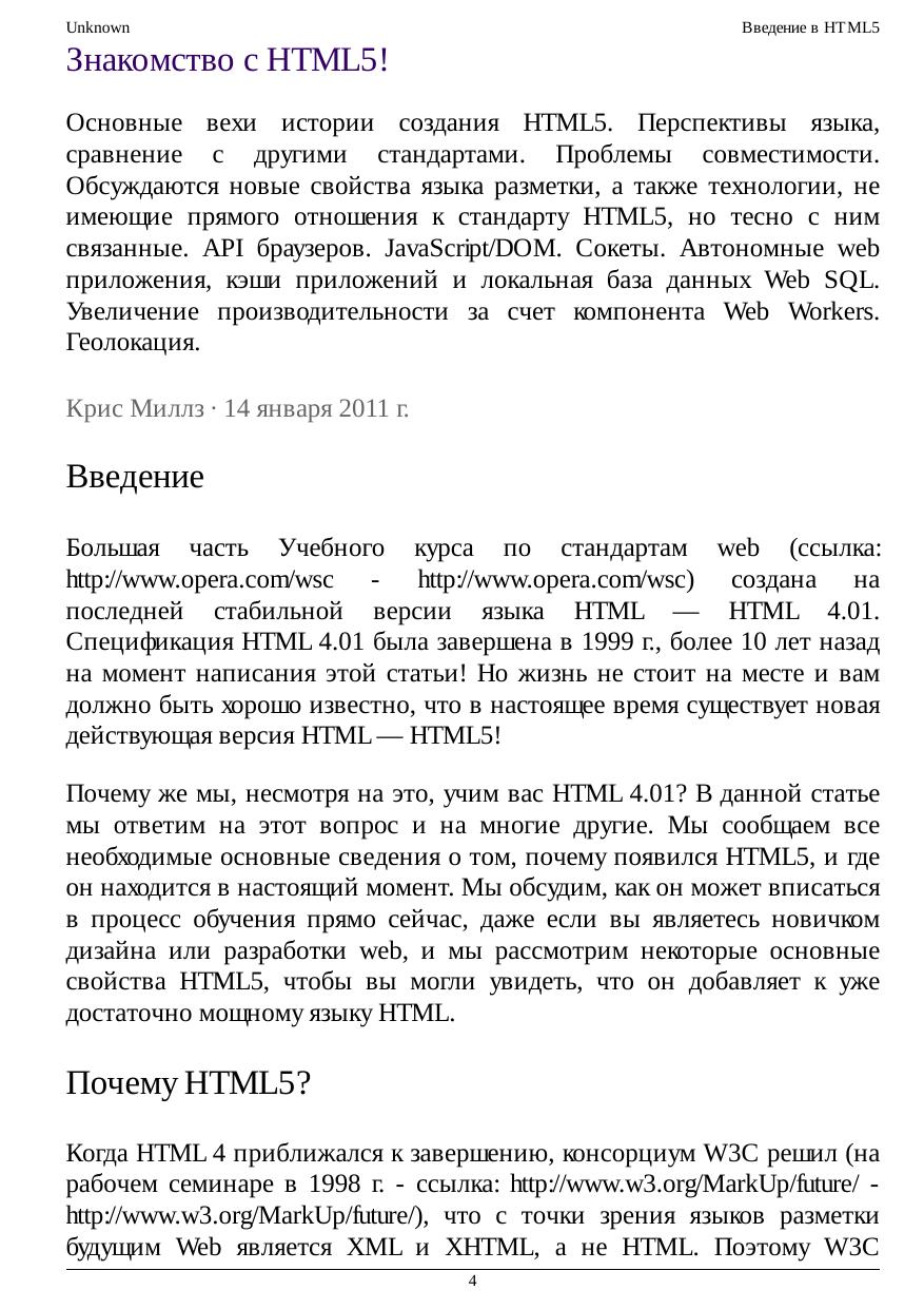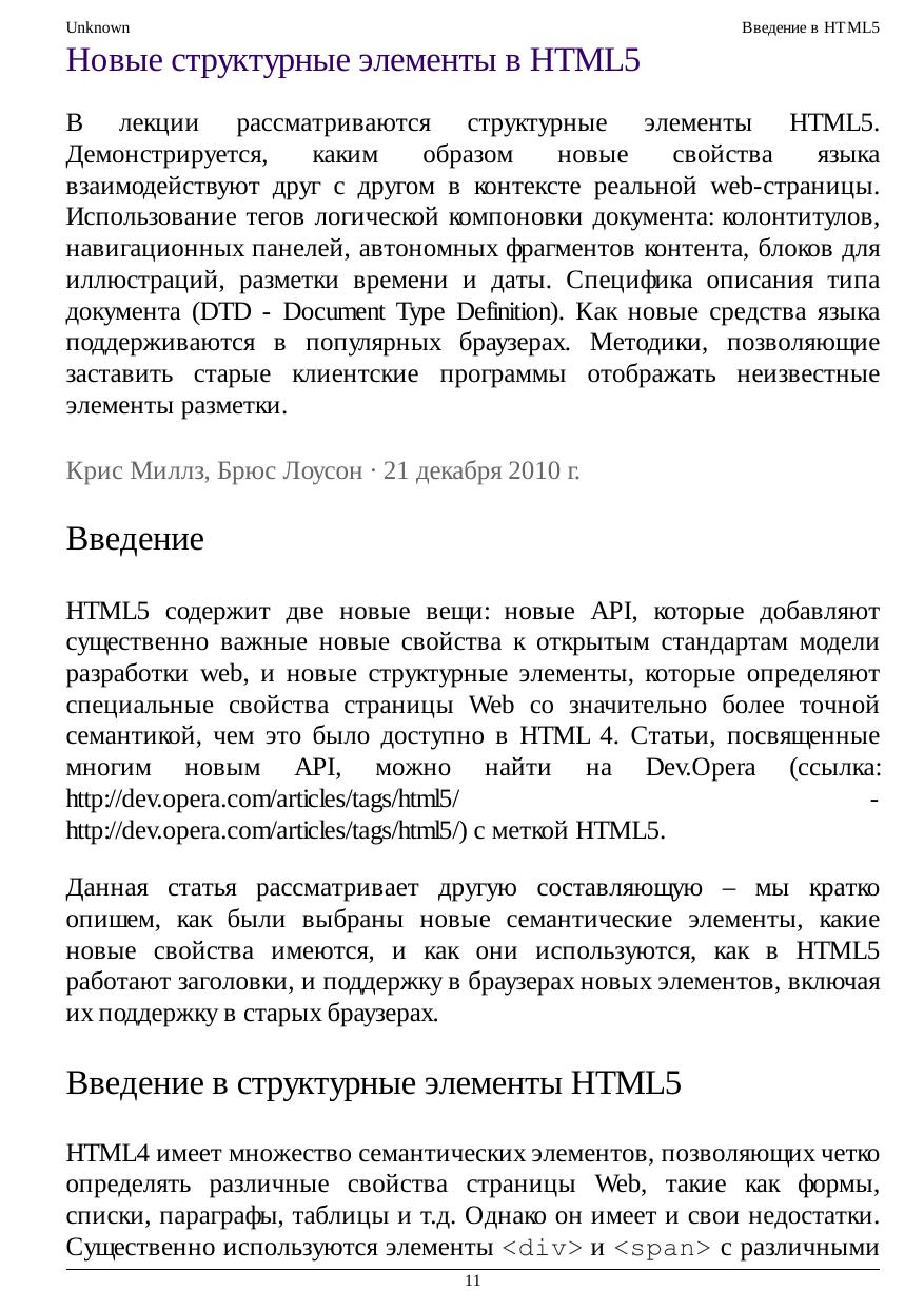 В курсе рассказывается об истории создания HTML5, возможностях, совместимости с другими стандартами, основных структурных элементах и их использовании в современных браузерах.