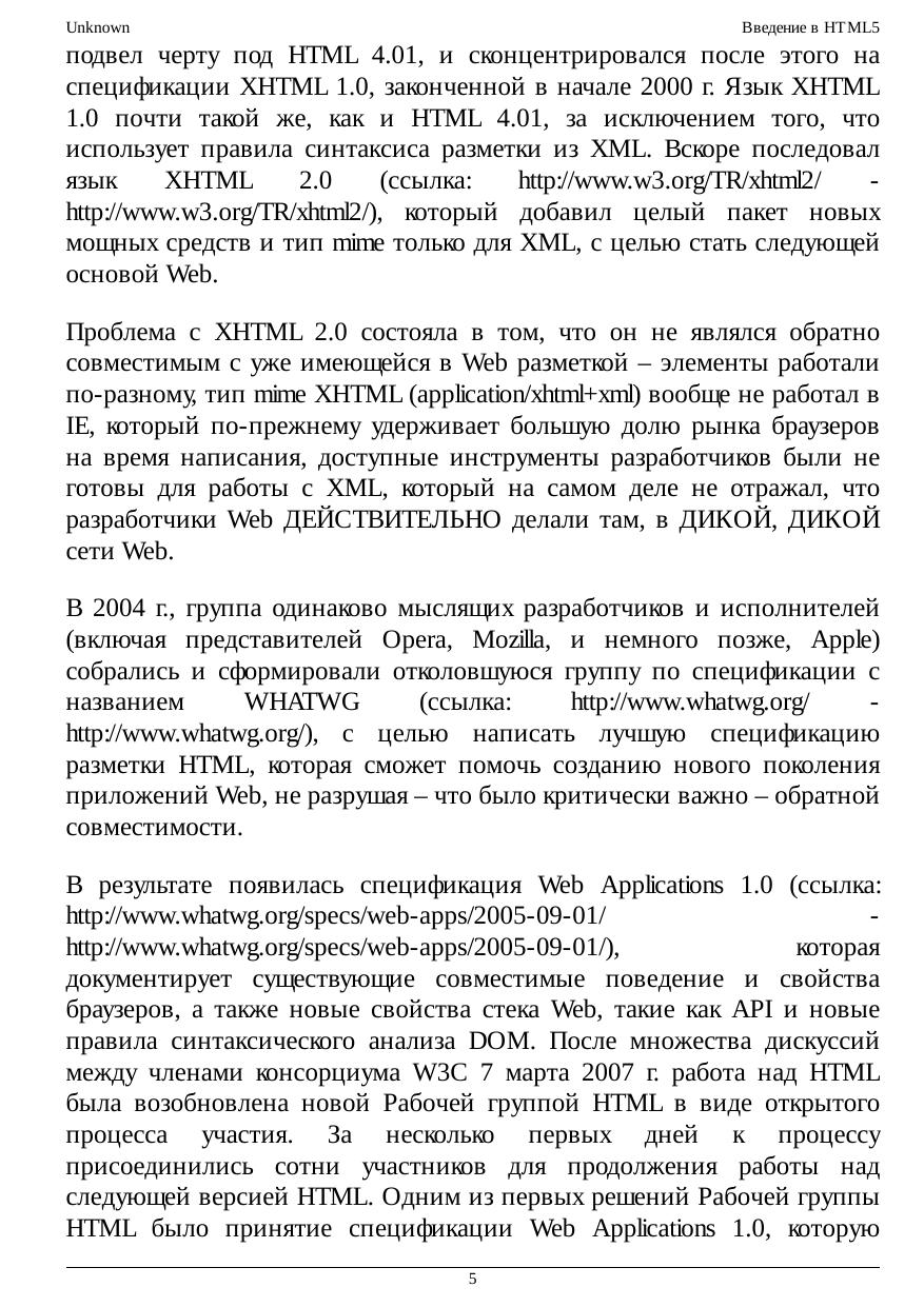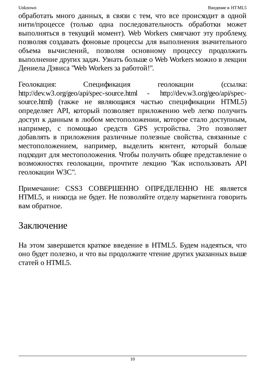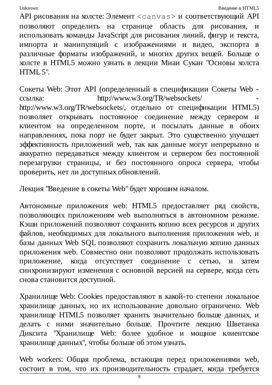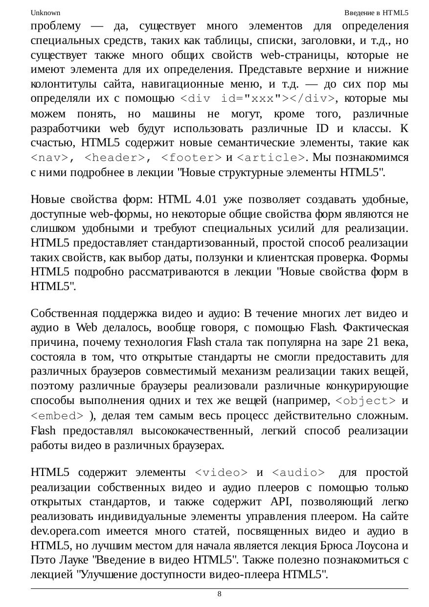 Демонстрируются новые элементы разметки и атрибуты, улучшающие формы, элемент video и создание индивидуального видеоплеера, "холст", API сокеты, кэширование приложение и хранилища данных на клиентских компьютерах. Дается введение в технологию многопоточного выполнения кода Web Workers и описываются основные возможности геолокации.