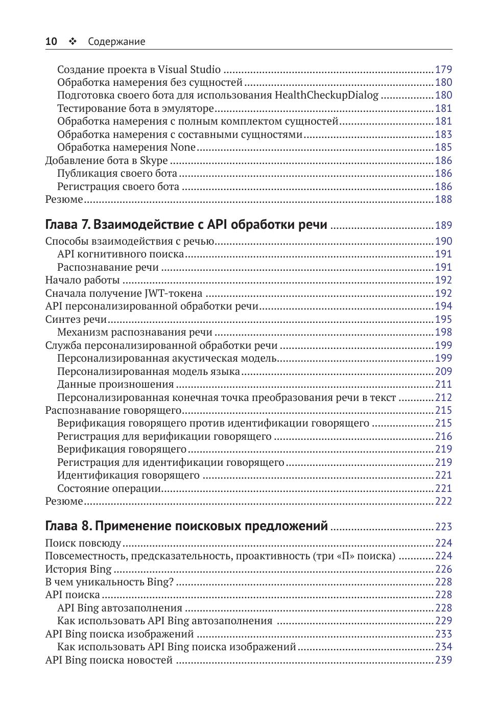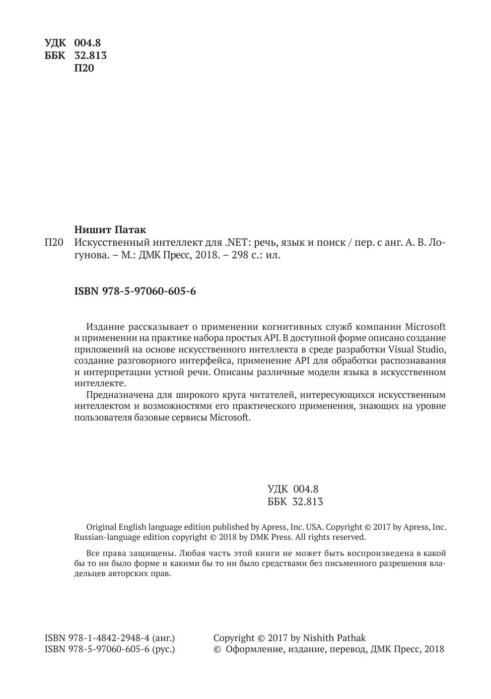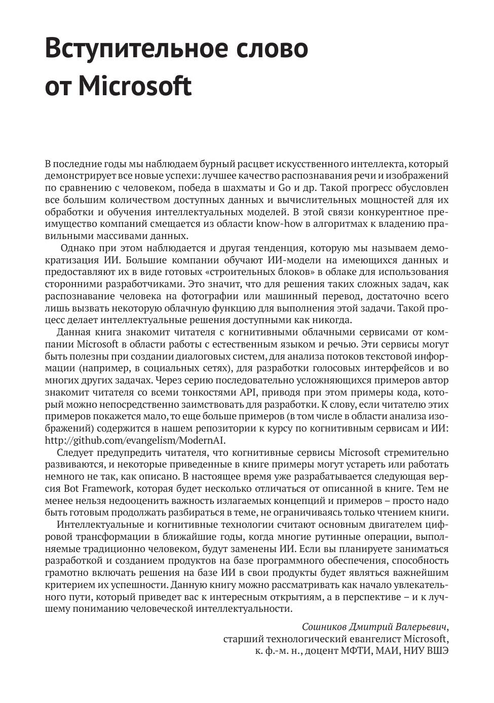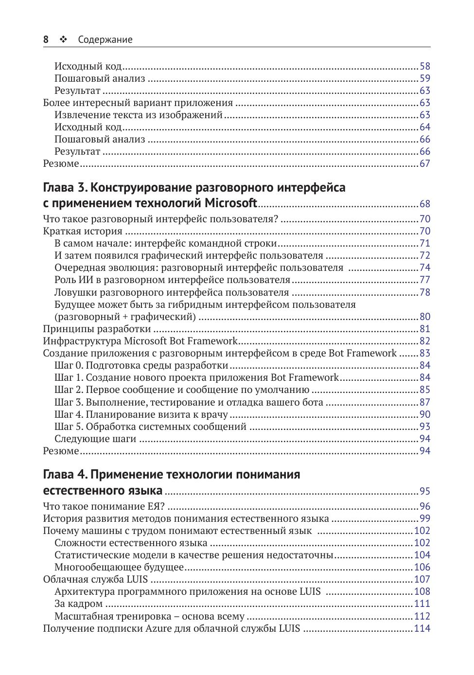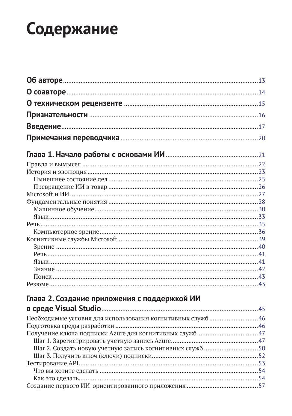 Издание рассказывает о применении когнитивных служб компании Microsoft и применении на практике набора простых API. В доступной форме описано создание приложений на основе искусственного интеллекта в среде разработки Visual Studio, создание разговорного интерфейса, применение API для обработки распознавания и интерпретации устной речи. Описаны различные модели языка в искусственном интеллекте. Предназначена для широкого круга читателей, интересующихся искусственным интеллектом и возможностями его практического применения, знающих на уровне пользователя базовые сервисы Microsoft.