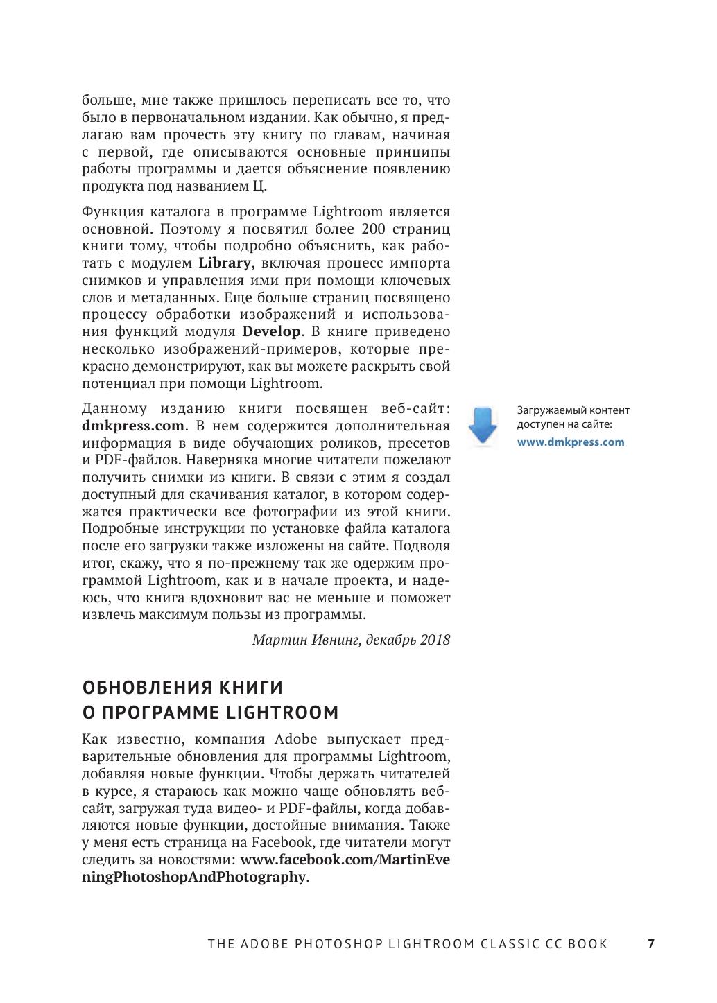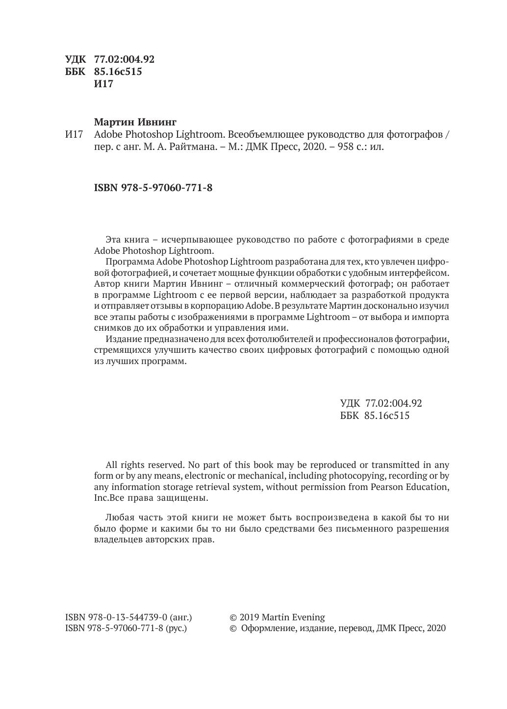 Программа Adobe Photoshop Lightroom разработана для тех, кто увлечен цифровой фотографией, и сочетает мощные функции обработки с удобным интерфейсом. Автор книги, Мартин Ивнинг, – отличный коммерческий фотограф; он работает в программе Lightroom с ее первой версии, наблюдает за разработкой продукта и отправляет отзывы в корпорацию Adobe. В результате Мартин досконально изучил все этапы работы с изображениями в программе Lightroom – от выбора и импорта снимков до их обработки и управления ими.