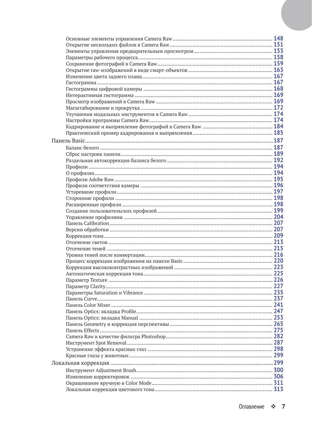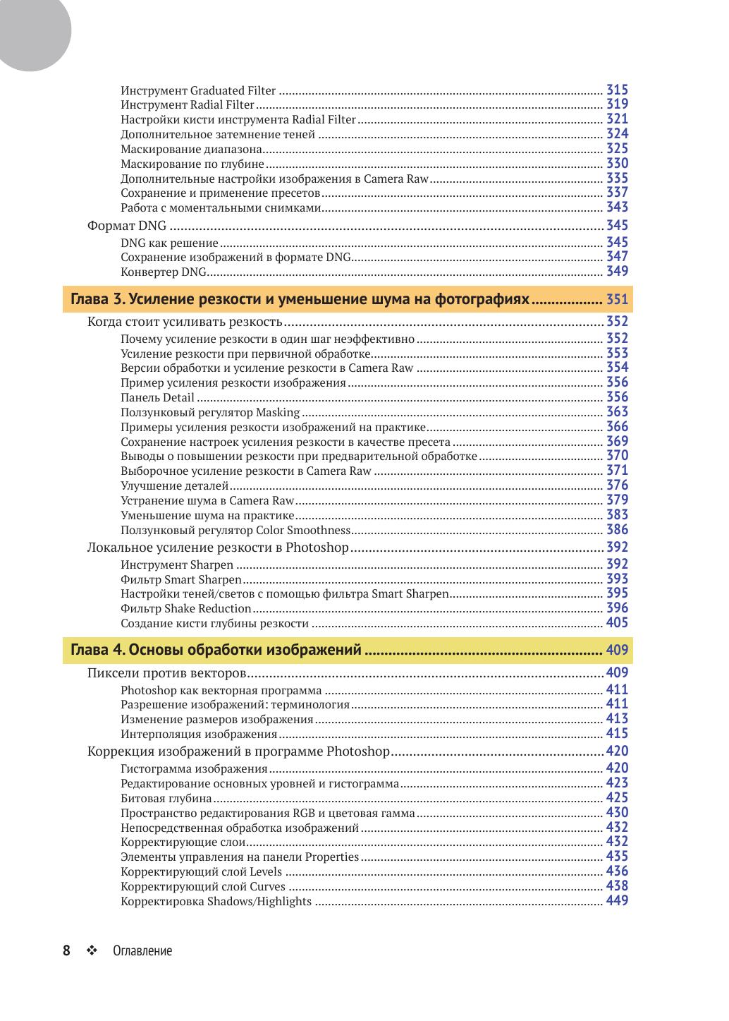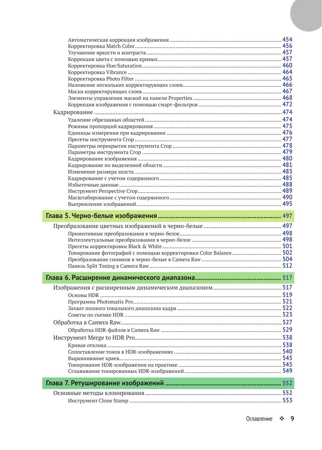 В первой главе приводится информация для читателей, приступающих к освоению программы или знающих ее в самых общих чертах: подробно рассмотрены основные элементы интерфейса, форматы файлов, а также средства рисования, черчения, редактирования изображений и др. Вторая глава посвящена обработке фотографий в формате RAW: на многочисленных примерах показано, как использовать кисти, фильтры, спецэффекты. В последующих главах рассказывается о том, как устранять дефекты фотосъемки, кадрировать фотографии, работать с черно-белыми изображениями, использовать технологию HDR (расширенный динамический диапазон). Особое внимание уделено слоям и маскам: они дают возможность обрабатывать разные фрагменты фотографий по отдельности, каждый раз акцентируя новые детали. Технологии, показанные в книге, основаны на личном опыте автора, полученном в сотрудничестве с командой разработчиков Adobe Photoshop.