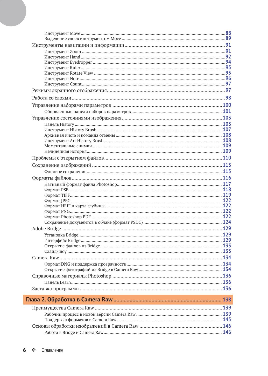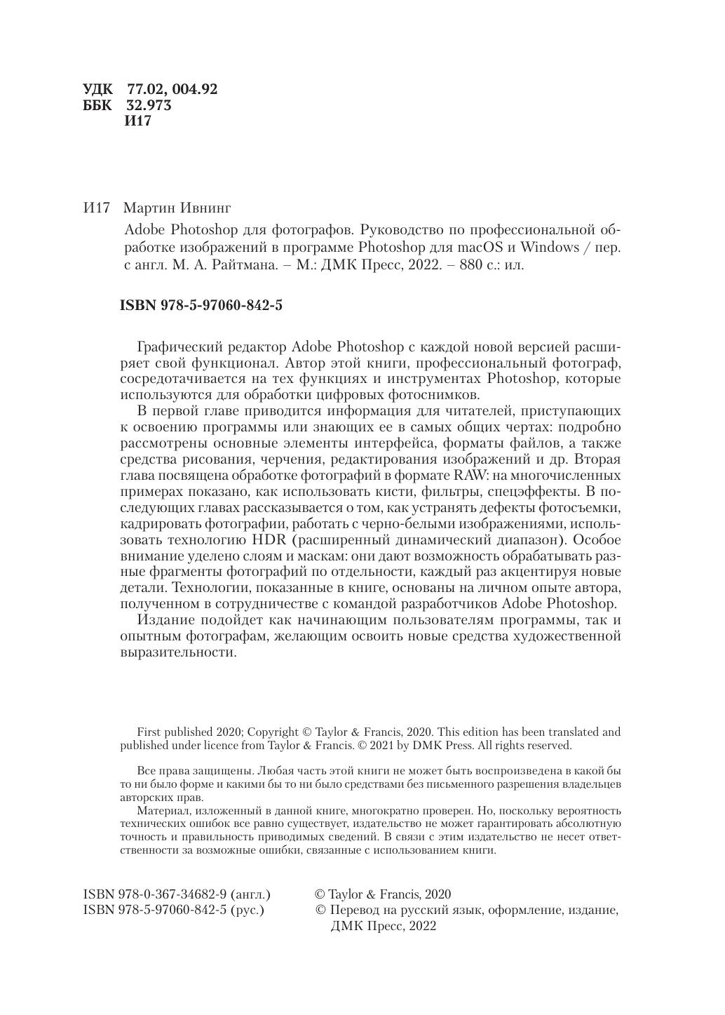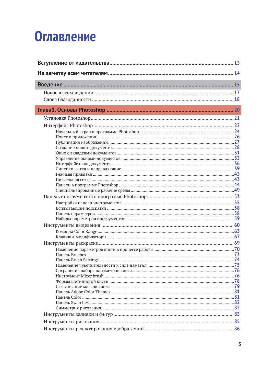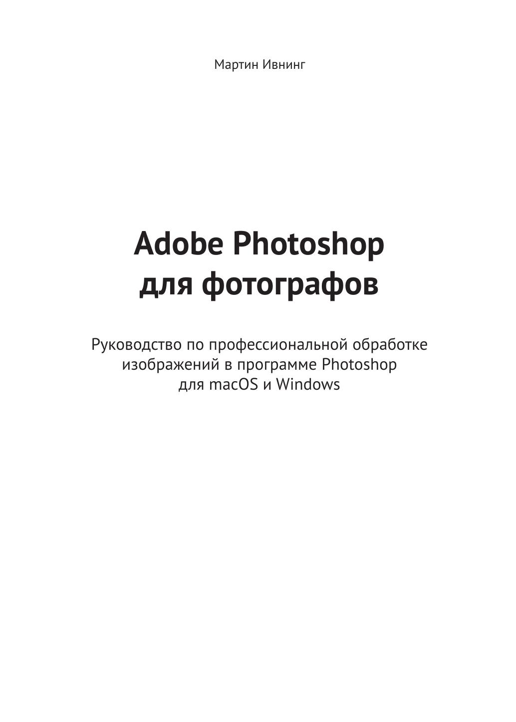 В первой главе приводится информация для читателей, приступающих к освоению программы или знающих ее в самых общих чертах: подробно рассмотрены основные элементы интерфейса, форматы файлов, а также средства рисования, черчения, редактирования изображений и др. Вторая глава посвящена обработке фотографий в формате RAW: на многочисленных примерах показано, как использовать кисти, фильтры, спецэффекты. В последующих главах рассказывается о том, как устранять дефекты фотосъемки, кадрировать фотографии, работать с черно-белыми изображениями, использовать технологию HDR (расширенный динамический диапазон). Особое внимание уделено слоям и маскам: они дают возможность обрабатывать разные фрагменты фотографий по отдельности, каждый раз акцентируя новые детали. Технологии, показанные в книге, основаны на личном опыте автора, полученном в сотрудничестве с командой разработчиков Adobe Photoshop.