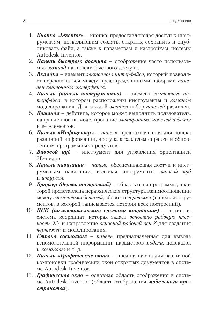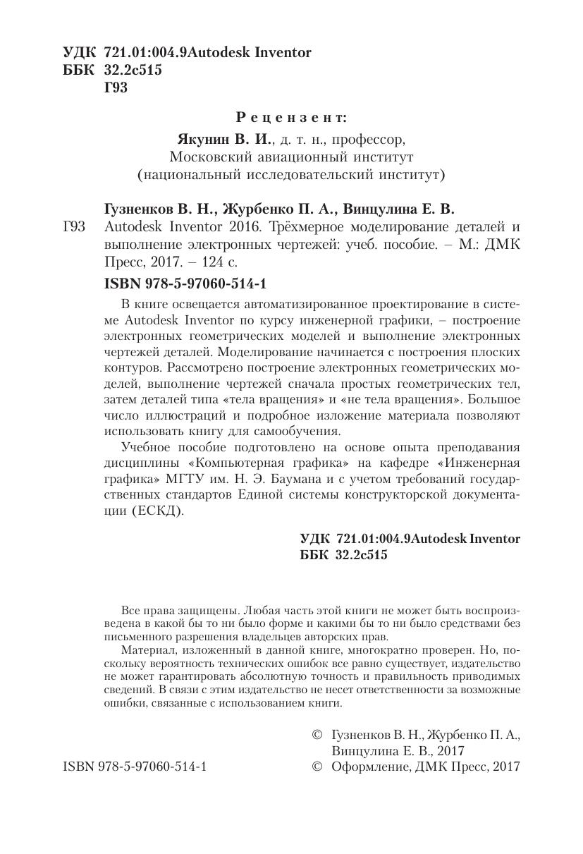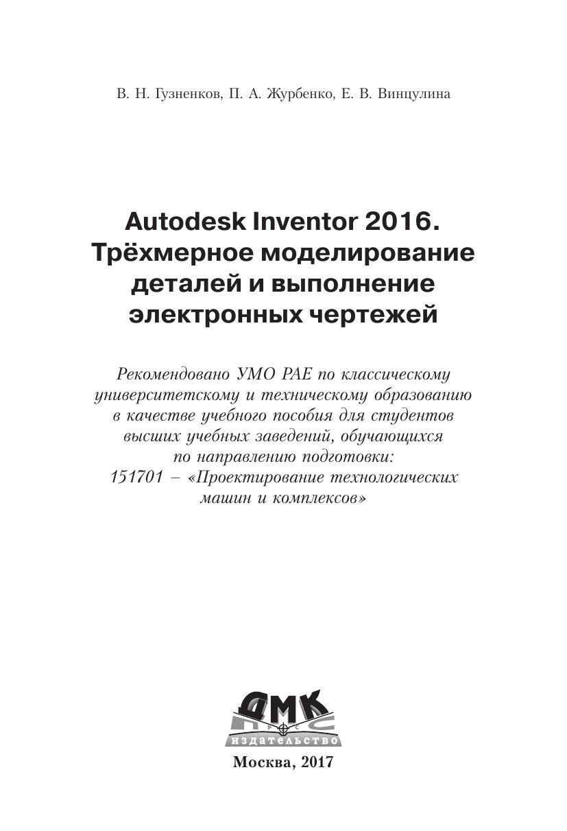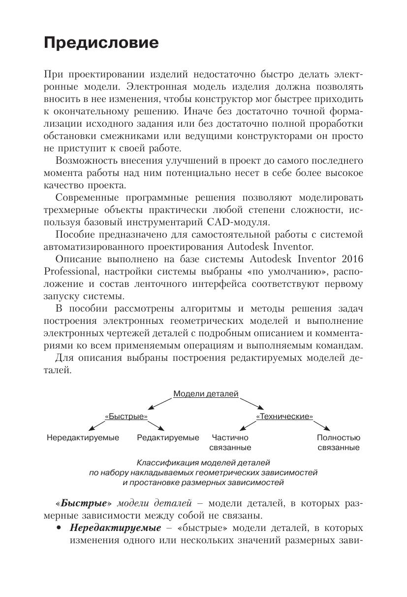В книге освещается автоматизированное проектирование в системе Autodesk Inventor по курсу инженерной графики, – построение электронных геометрических моделей и выполнение электронных чертежей деталей. Моделирование начинается с построения плоских контуров. Рассмотрено построение электронных геометрических моделей, выполнение чертежей сначала простых геометрических тел, затем деталей типа «тела вращения» и «не тела вращения». Большое число иллюстраций и подробное изложение материала позволяют использовать книгу для самообучения. Учебное пособие подготовлено на основе опыта преподавания дисциплины «Компьютерная графика» на кафедре «Инженерная графика» МГТУ им. Н. Э. Баумана и с учетом требований государственных стандартов Единой системы конструкторской документации (ЕСКД).