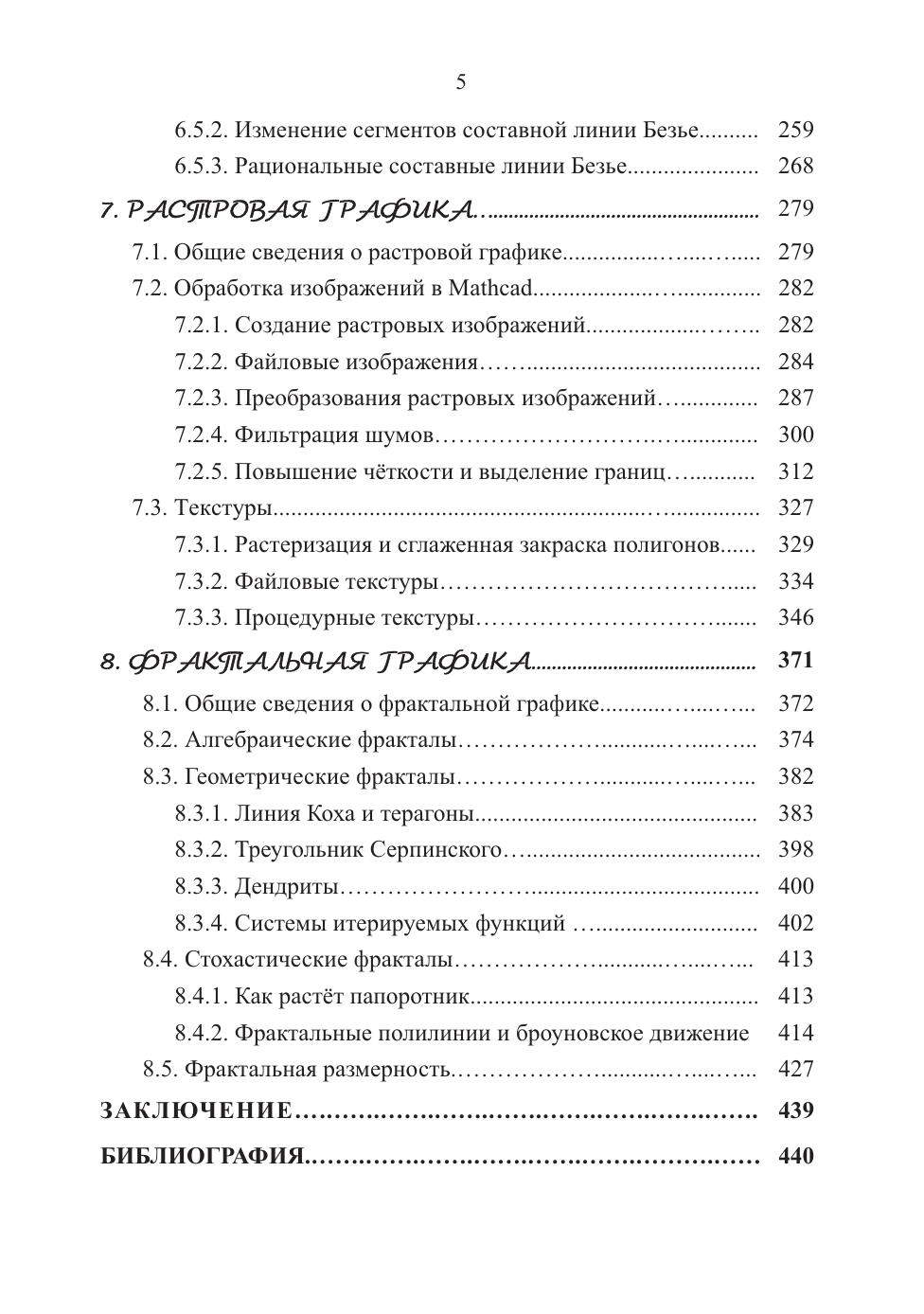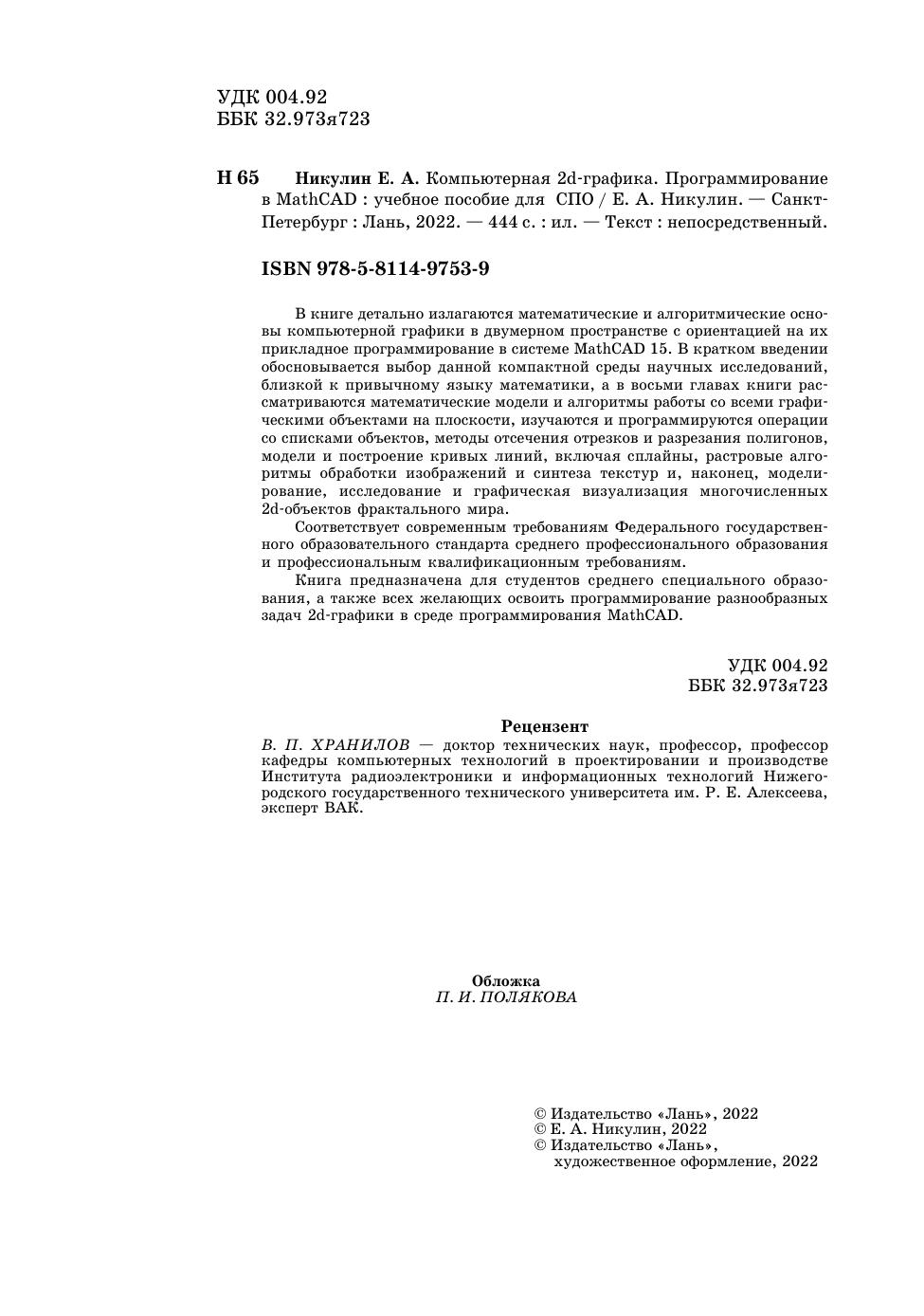 В книге детально излагаются математические и алгоритмические основы компьютерной графики в двумерном пространстве с ориентацией на их прикладное программирование в системе MathCAD 15. В кратком введении обосновывается выбор данной компактной среды научных исследований, близкой к привычному языку математики, а в восьми главах книги рассматриваются математические модели и алгоритмы работы со всеми графическими объектами на плоскости, изучаются и программируются операции со списками объектов, методы отсечения отрезков и разрезания полигонов, модели и построение кривых линий, включая сплайны, растровые алгоритмы обработки изображений и синтеза текстур и, наконец, моделирование, исследование и графическая визуализация многочисленных 2d-объектов фрактального мира. Книга предназначена студентам среднего специального образования, а также всем желающим освоить программирование разнообразных задач 2d-графики в среде программирования MathCAD.