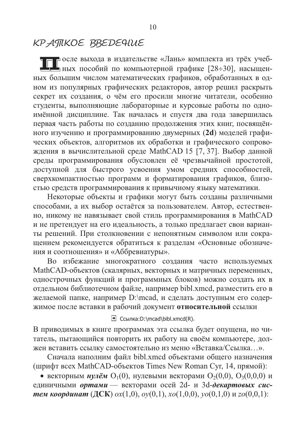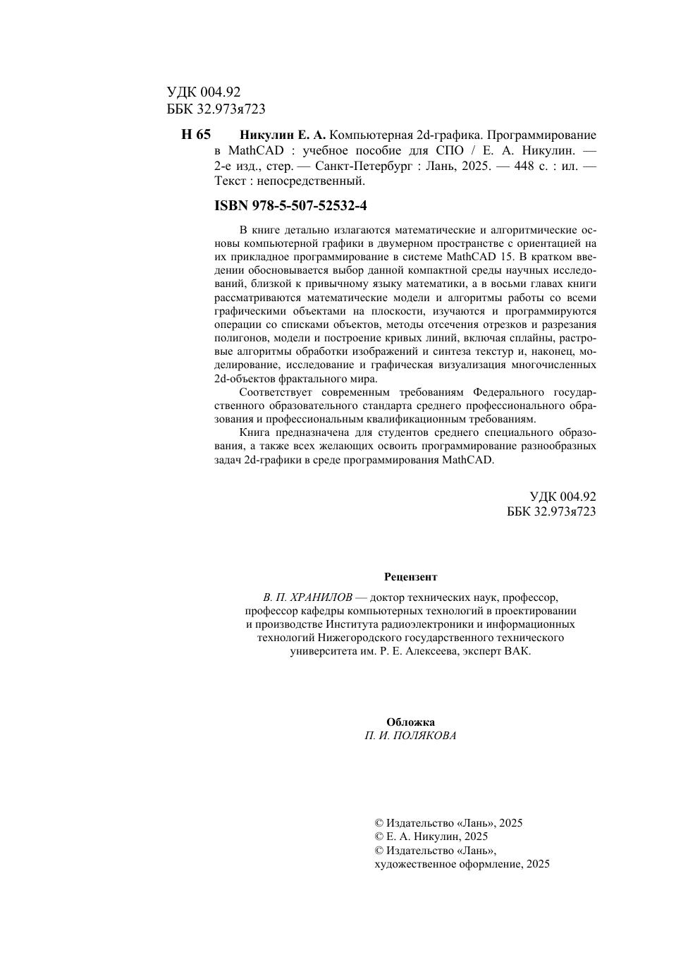 В книге детально излагаются математические и алгоритмические основы компьютерной графики в двумерном пространстве с ориентацией на их прикладное программирование в системе MathCAD 15. В кратком введении обосновывается выбор данной компактной среды научных исследований, близкой к привычному языку математики, а в восьми главах книги рассматриваются математические модели и алгоритмы работы со всеми графическими объектами на плоскости, изучаются и программируются операции со списками объектов, методы отсечения отрезков и разрезания полигонов, модели и построение кривых линий, включая сплайны, растровые алгоритмы обработки изображений и синтеза текстур и, наконец, моделирование, исследование и графическая визуализация многочисленных 2d-объектов фрактального мира. Книга предназначена студентам среднего специального образования, а также всем желающим освоить программирование разнообразных задач 2d-графики в среде программирования MathCAD. Соответствует современным требованиям Федерального государственного образовательного стандарта среднего профессионального образования и профессиональным квалификационным требованиям.