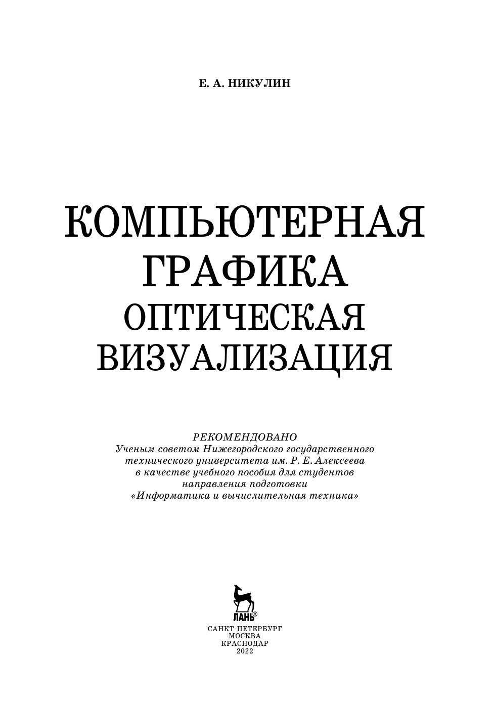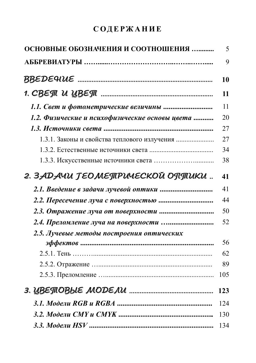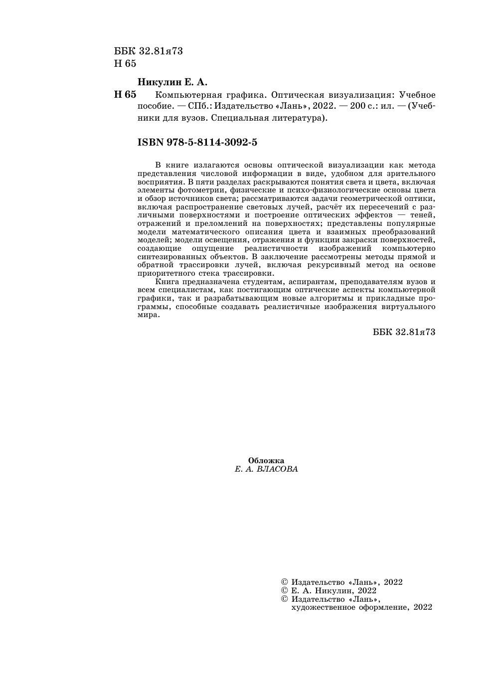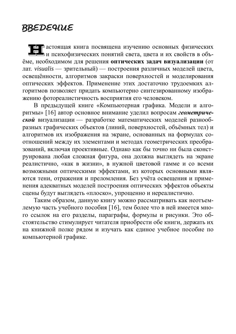 В книге излагаются основы оптической визуализации как метода представления числовой информации в виде, удобном для зрительного восприятия. В пяти разделах раскрываются понятия света и цвета, включая элементы фотометрии, физические и психо-физиологические основы цвета и обзор источников света, рассматриваются задачи геометрической оптики, включая распространение световых лучей, расчёт их пересечений с различными поверхностями и построение оптических эффектов — теней, отражений и преломлений на поверхностях, представлены популярные модели математического описания цвета и взаимных преобразований моделей, модели освещения, отражения и функции закраски поверхностей, создающие ощущение реалистичности изображений компьютерно синтезированных объектов. В заключение рассмотрены методы прямой и обратной трассировки лучей, включая рекурсивный метод на основе приоритетного стека трассировки. Книга предназначена студентам, аспирантам, преподавателям вузов и всем специалистам, как постигающим оптические аспекты компьютерной графики, так и разрабатывающим новые алгоритмы и прикладные программы, способные создавать реалистичные изображения виртуального мира.