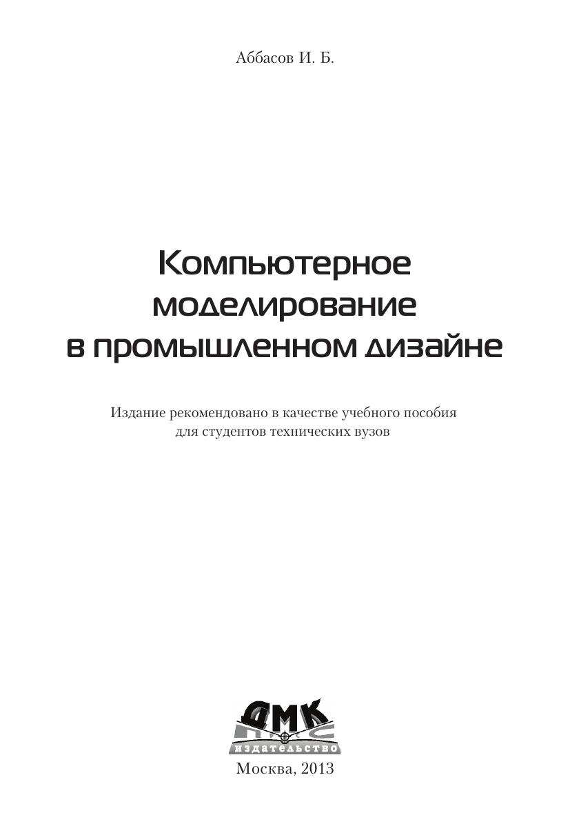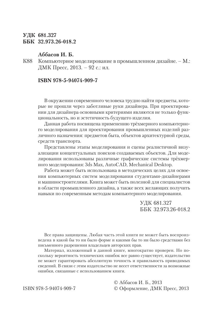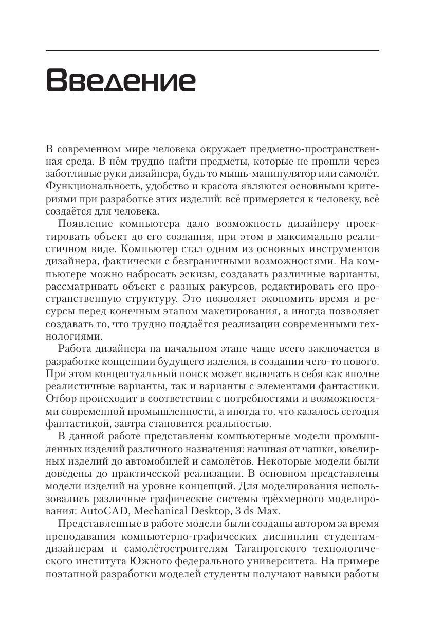 В окружении современного человека трудно найти предметы, которые не прошли через заботливые руки дизайнера. При проектировании для дизайнера основными критериями являются не только функциональность, но и эстетичность будущего изделия. Данная работа посвящена применению трёхмерного компьютерного моделирования для проектирования промышленных изделий различного назначения: предметов быта, объектов архитектурной среды, средств транспорта. Представлены этапы моделирования и сцены реалистичной визуализации концептуальных поисков создаваемых объектов. Для моделирования использованы различные графические системы трёхмерного моделирования: 3ds Max, AutoCAD, Mechanical Desktop. Работа может быть использована в методических целях для освоения компьютерных систем моделирования студентами-дизайнерами и машиностроителями. Книга может быть полезной для специалистов в области промышленного дизайна, а также всех желающих получить навыки по современным методам компьютерного моделирования.