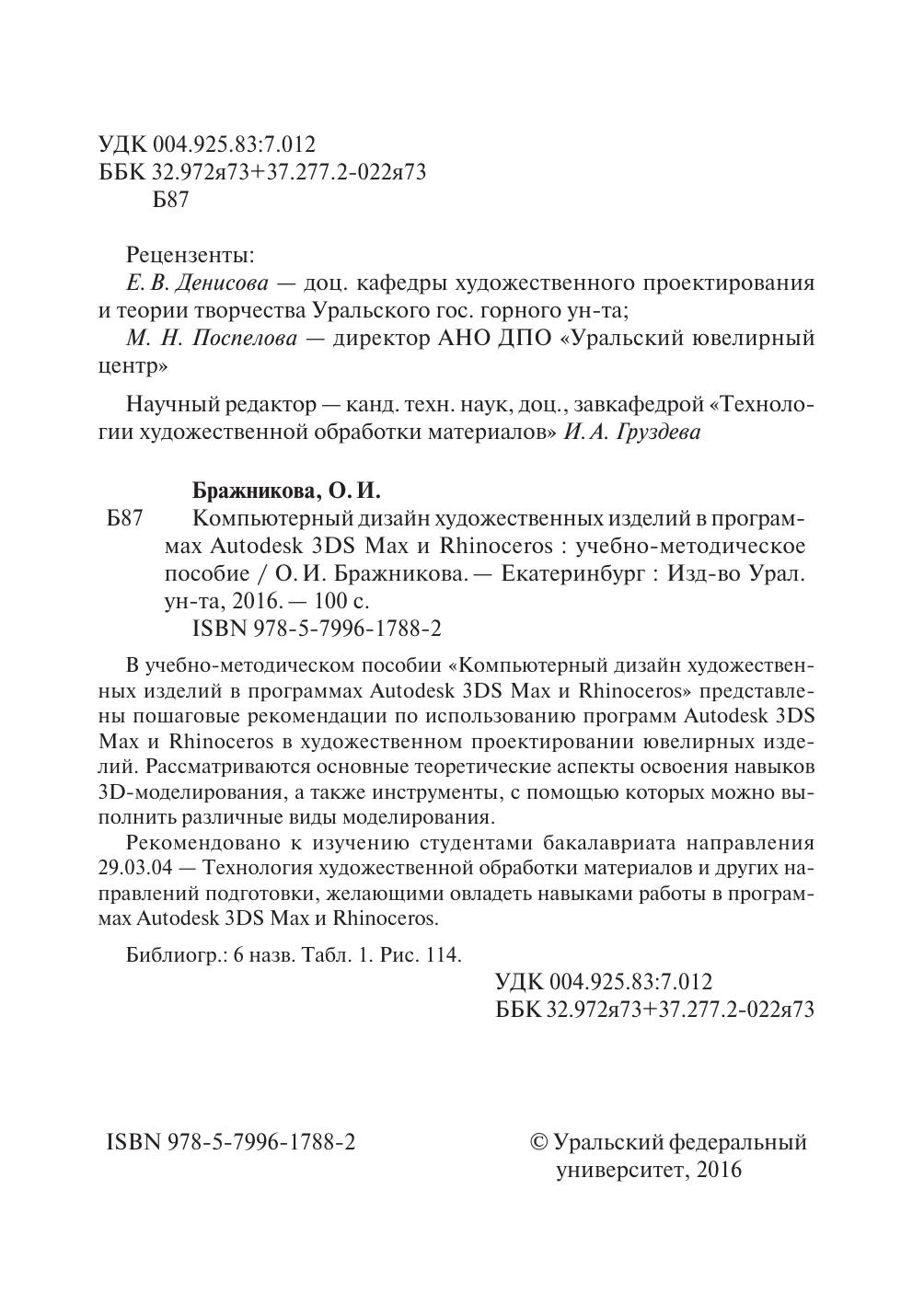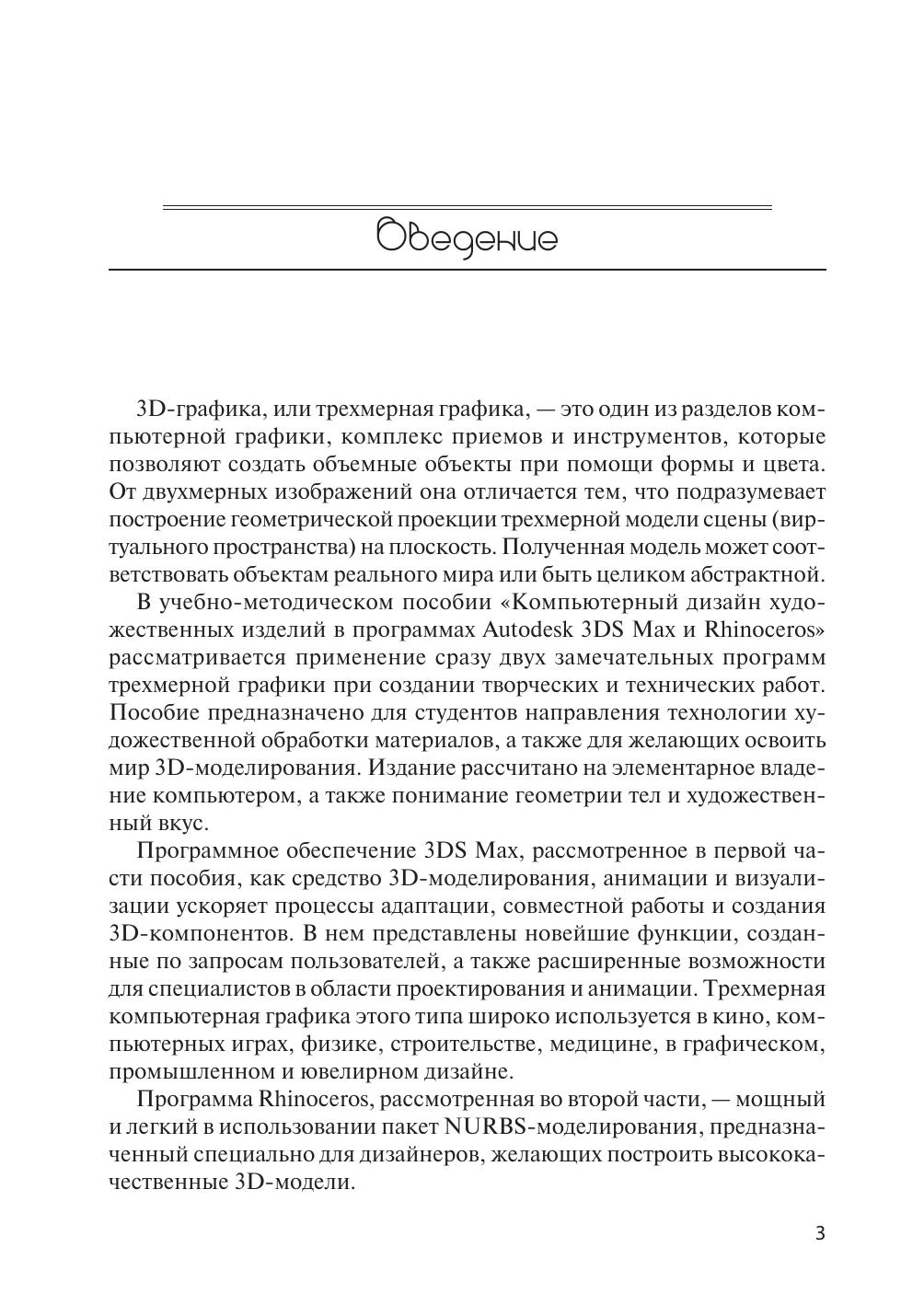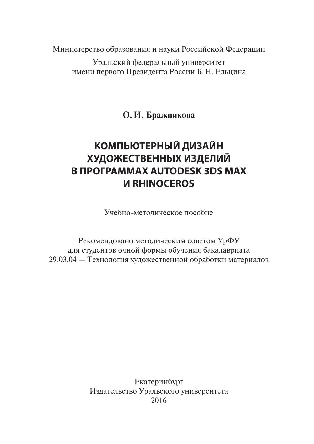 В учебно-методическом пособии «Компьютерный дизайн художественных изделий в программах Autodesk 3DS Max и Rhinoceros» представлены пошаговые рекомендации по использованию программ Autodesk 3DS Max и Rhinoceros в художественном проектировании ювелирных изделий. Рассматриваются основные теоретические аспекты освоения навыков 3D-моделирования, а также инструменты, с помощью которых можно выполнить различные виды моделирования. Рекомендовано к изучению студентами бакалавриата направления 29.03.04 — Технология художественной обработки материалов и других направлений подготовки, желающими овладеть навыками работы в программах Autodesk 3DS Max и Rhinoceros.