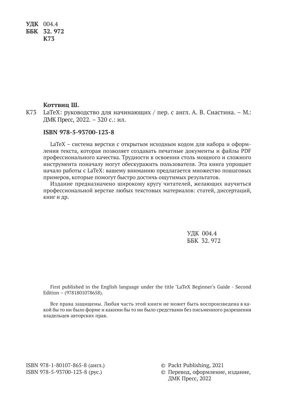 LaTeX – система верстки с открытым исходным кодом для набора и оформления текста, которая позволяет создавать печатные документы и файлы PDF профессионального качества. Трудности в освоении столь мощного и сложного инструмента поначалу могут обескуражить пользователя. Эта книга упрощает начало работы с LaTeX: вашему вниманию предлагается множество пошаговых примеров, которые помогут быстро достичь ощутимых результатов.