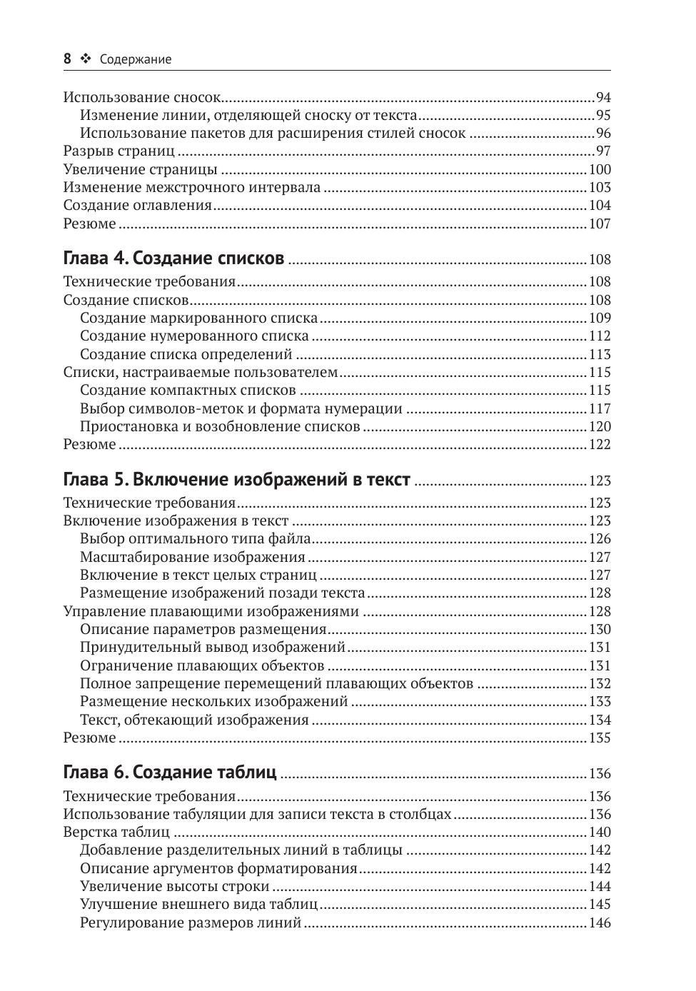 Вы узнаете, как создавать превосходно отформатированные тексты и макеты страниц, профессионально выглядящие таблицы, внедрять в документ изображения, записывать громоздкие математические формулы, управлять документами со сложной структурой. Вы также научитесь в полной мере использовать макросы и стили, чтобы не выполнять лишнюю работу по набору и оформлению текста.