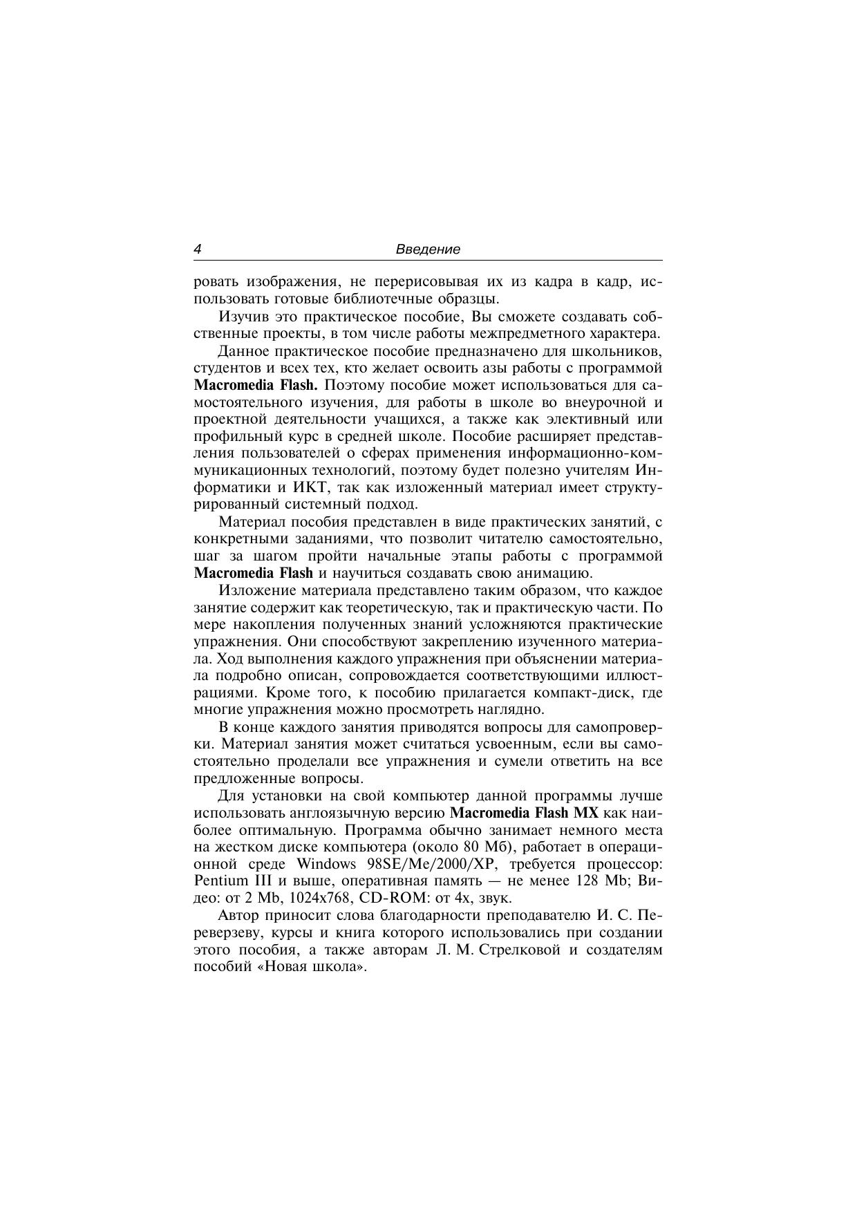 Данное практическое пособие предназначено для школьников, студентов и всех тех, кто желает освоить азы работы с программой Macromedia Flash. Поэтому пособие может использоваться для самостоятельного изучения, для работы в школе во внеурочной и проектной деятельности учащихся, а также как элективный или профильный курс в средней школе. Пособие расширяет представления пользователей о сферах применения информационно-коммуникационных технологий, поэтому будет полезно учителям Информатики и ИКТ, так как изложенный материал имеет структурированный системный подход. Серия презентаций, которая размещена в сети Интернет, поможет сделать изучение курса более наглядным и привлекательным. Упражнения по предложенным темам могут быть адаптированы под то количество часов, которое по факту будет выделено на изучение каждой темы.Автор пособия надеется, что курс будет полезен учителям и школьникам, и с благодарностью примет все замечания и пожелания.