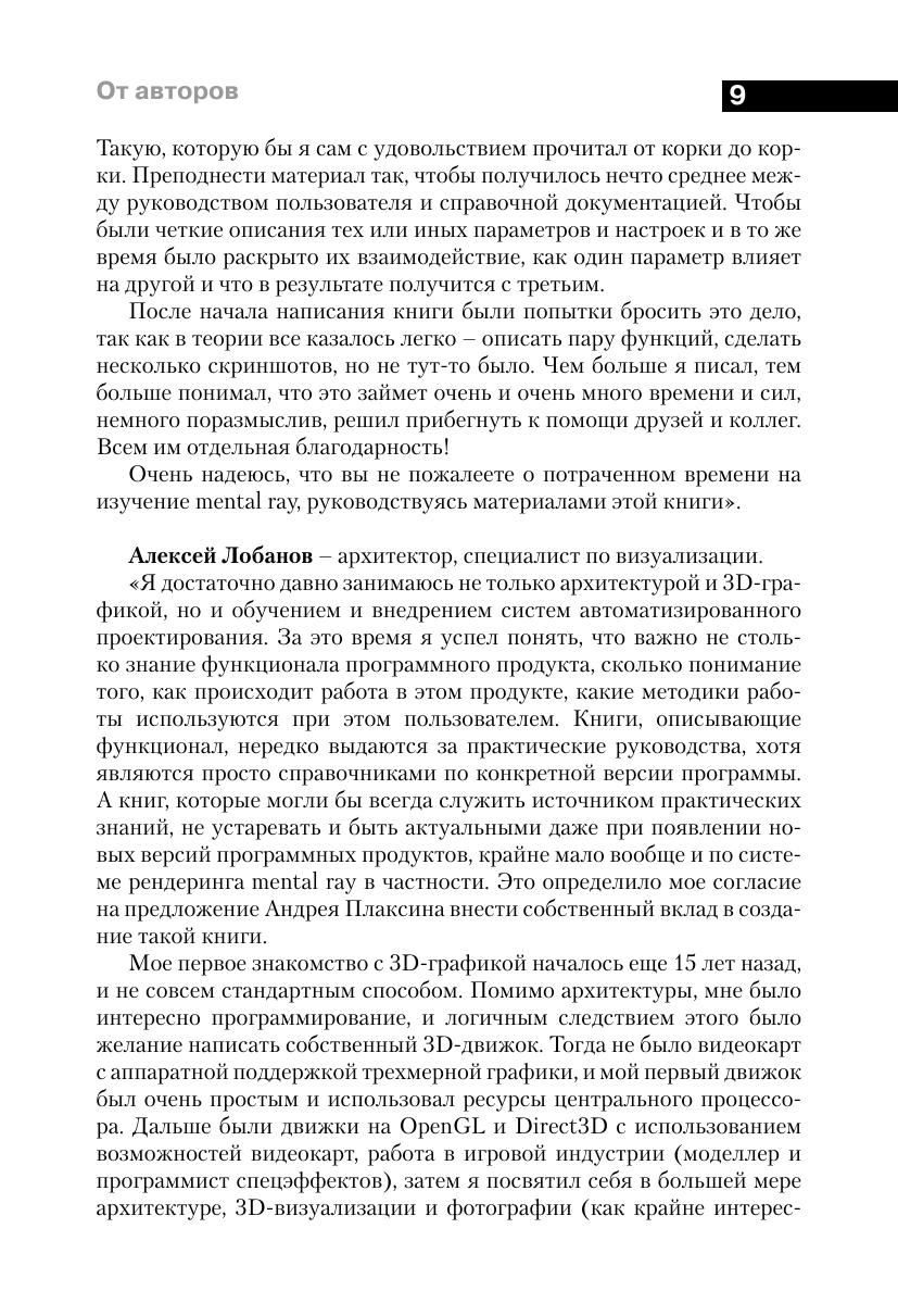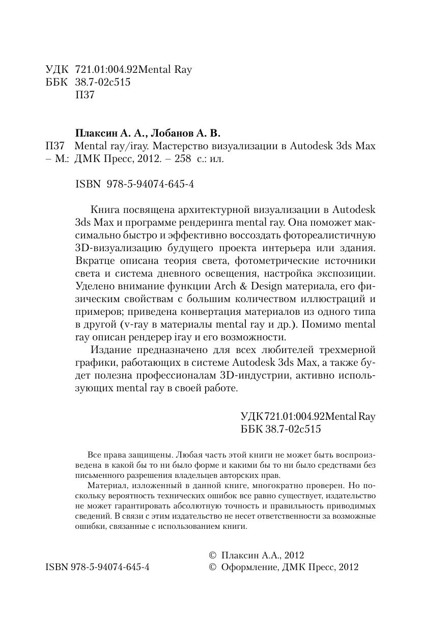 Книга посвящена архитектурной визуализации в Autodesk 3ds Max и программе рендеринга mental ray. Она поможет максимально быстро и эффективно воссоздать фотореалистичную 3D-визуализацию будущего проекта интерьера или здания. Вкратце описана теория света, фотометрические источники света и система дневного освещения, настройка экспозиции. Уделено внимание функции Arch & Design материала, его физическим свойствам с большим количеством иллюстраций и примеров, приведена конвертация материалов из одного типа в другой (v-ray в материалы mental ray и др.). Помимо mental ray описан рендерер iray и его возможности. Издание предназначено для всех любителей трехмерной графики, работающих в системе Autodesk 3ds Max, а также будет полезна профессионалам 3D-индустрии, активно использующих mental ray в своей работе.