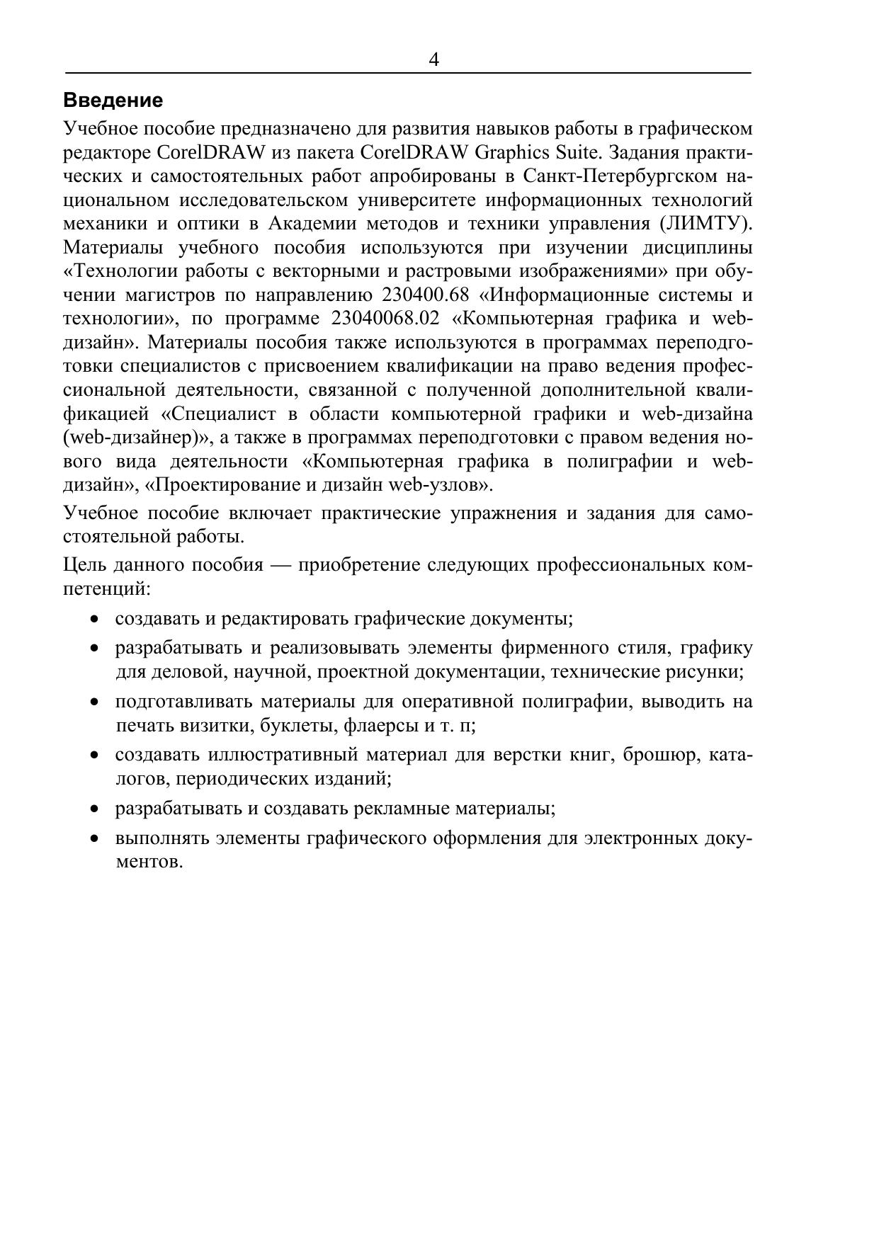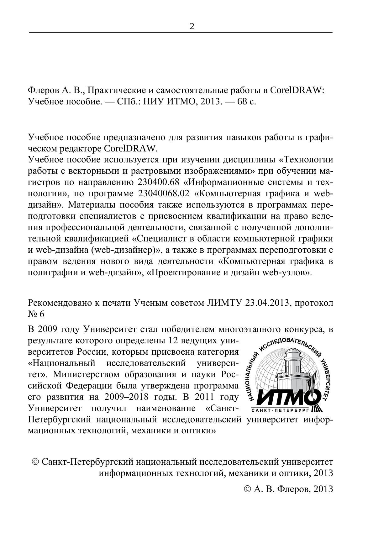 Учебное пособие предназначено для развития навыков работы в графическом редакторе CorelDRAW. Учебное пособие используется при изучении дисциплины «Технологии работы с векторными и растровыми изображениями» при обучении магистров по направлению 230400.68 «Информационные системы и технологии», по программе 23040068.02 «Компьютерная графика и web-дизайн». Материалы пособия также используются в программах переподготовки специалистов с присвоением квалификации на право ведения профессиональной деятельности, связанной с полученной дополнительной квалификацией «Специалист в области компьютерной графики и web-дизайна (web-дизайнер)», а также в программах переподготовки справом ведения нового вида деятельности «Компьютерная графика в полиграфии и web-дизайн», «Проектирование и дизайн web-узлов».