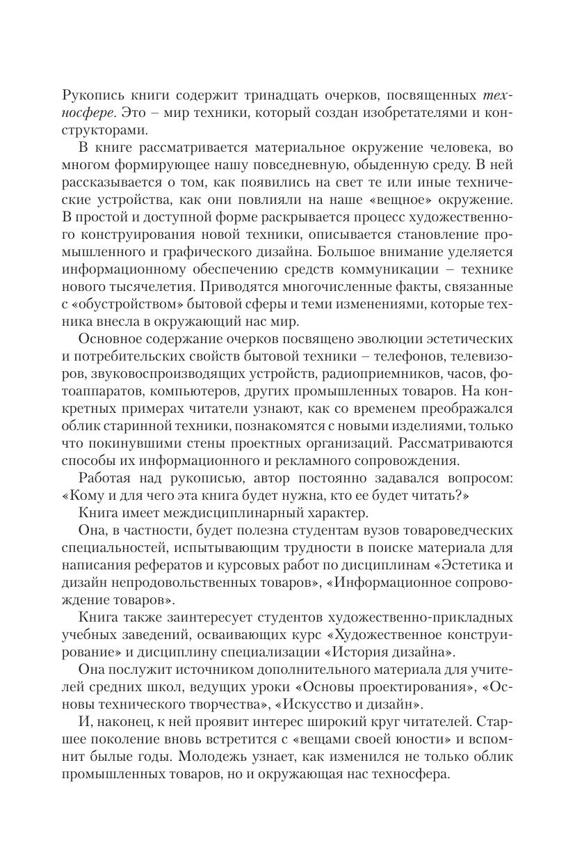 В книге рассматривается материальное окружение человека, во многом формирующее нашу повседневную, обыденную среду. В ней рассказывается о том, как появились на свет те или иные технические устройства, как они повлияли на наше «вещное» окружение. В простой и доступной форме раскрывается процесс художественного конструирования новой техники, описывается становление промышленного и графического дизайна. Большое внимание уделяется информационному обеспечению средств коммуникации – технике нового тысячелетия. Приводятся многочисленные факты, связанные с «обустройством» бытовой сферы и теми изменениями, которые техника внесла в окружающий нас мир.