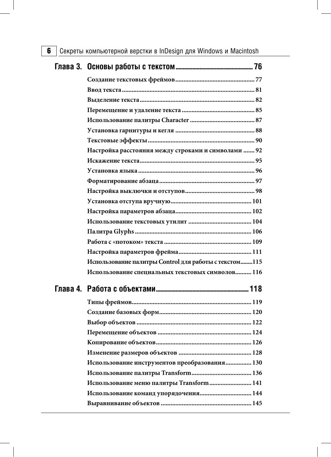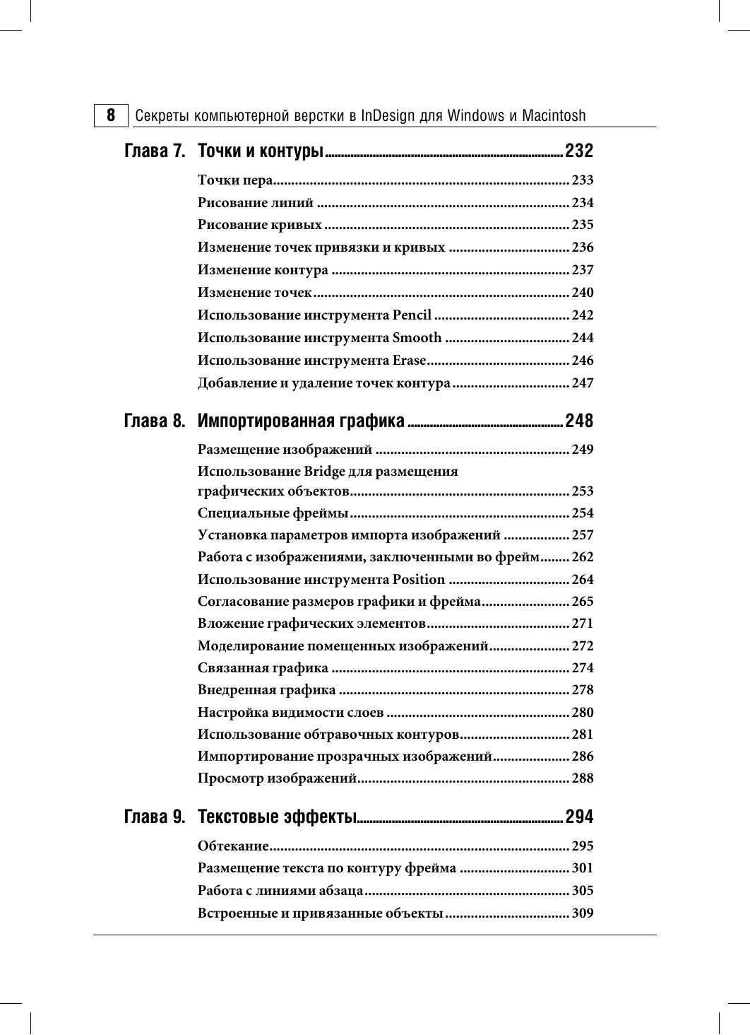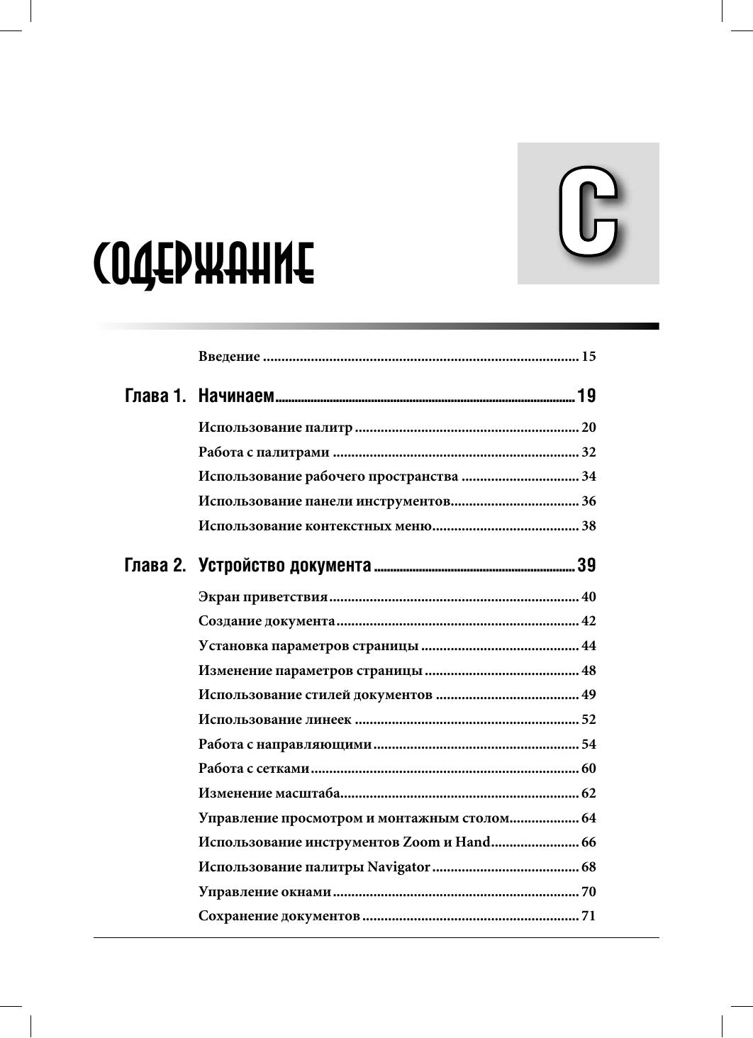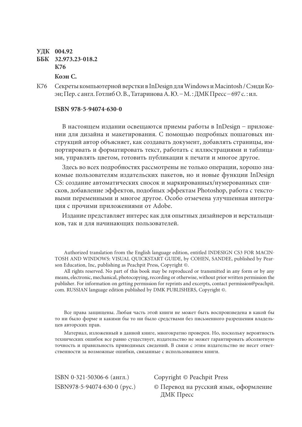 В настоящем издании освещаются приемы работы в InDesign – приложении для дизайна и макетирования. С помощью подробных пошаговых инструкций автор объясняет, как создавать документ, добавлять страницы, импортировать и форматировать текст, работать с иллюстрациями и таблицами, управлять цветом, готовить публикации к печати и многое другое. Здесь во всех подробностях рассмотрены не только операции, хорошо знакомые пользователям издательских пакетов, но и новые функции InDesign CS: создание автоматических cносок и маркированных/нумерованных списков, добавление эффектов, подобных эффектам Photoshop, работа с текстовыми переменными и многое другое. Особо отмечена улучшенная интеграция с прочими приложениями от Adobe. Издание представляет интерес как для опытных дизайнеров и верстальщиков, так и для начинающих пользователей.