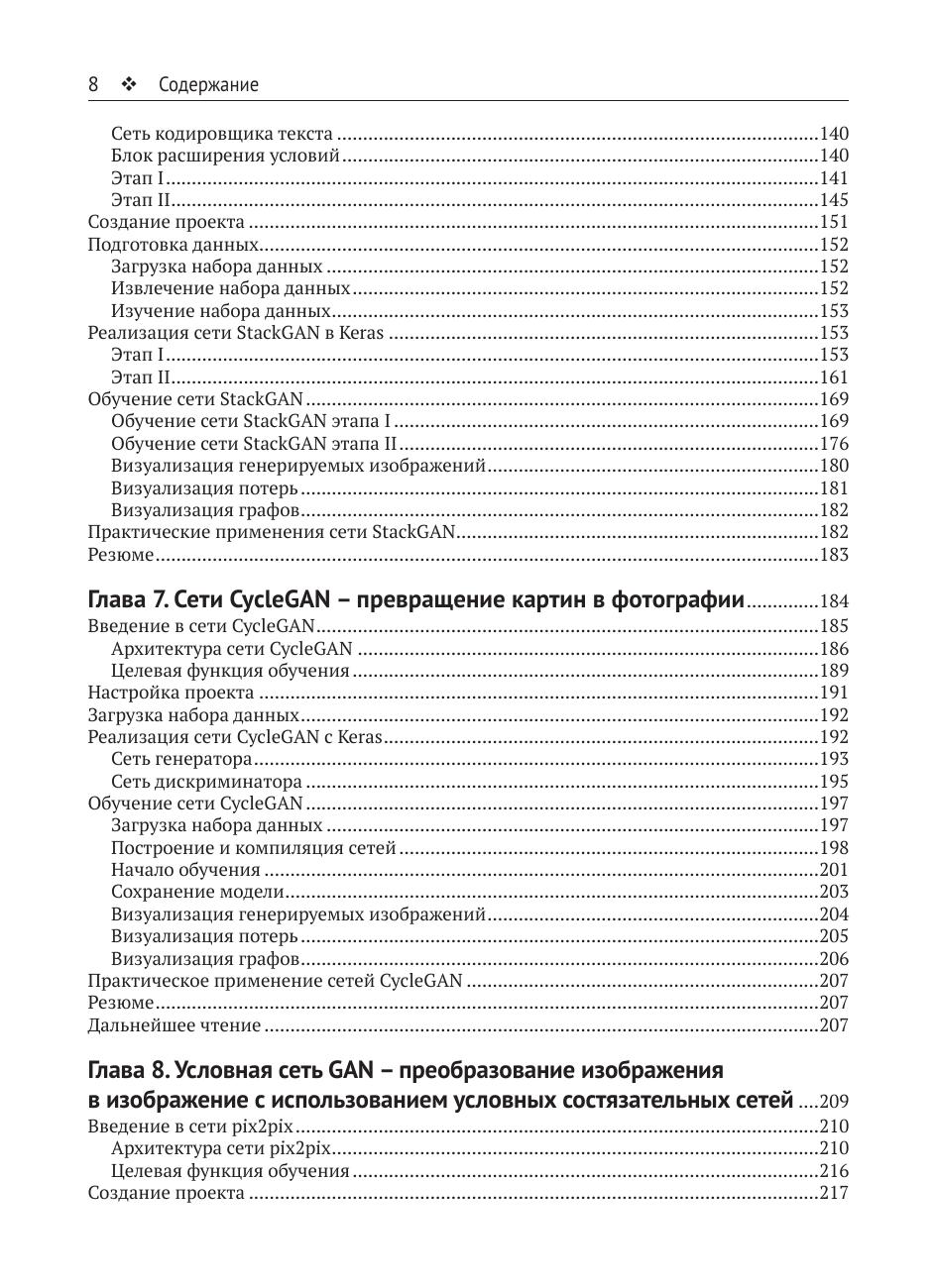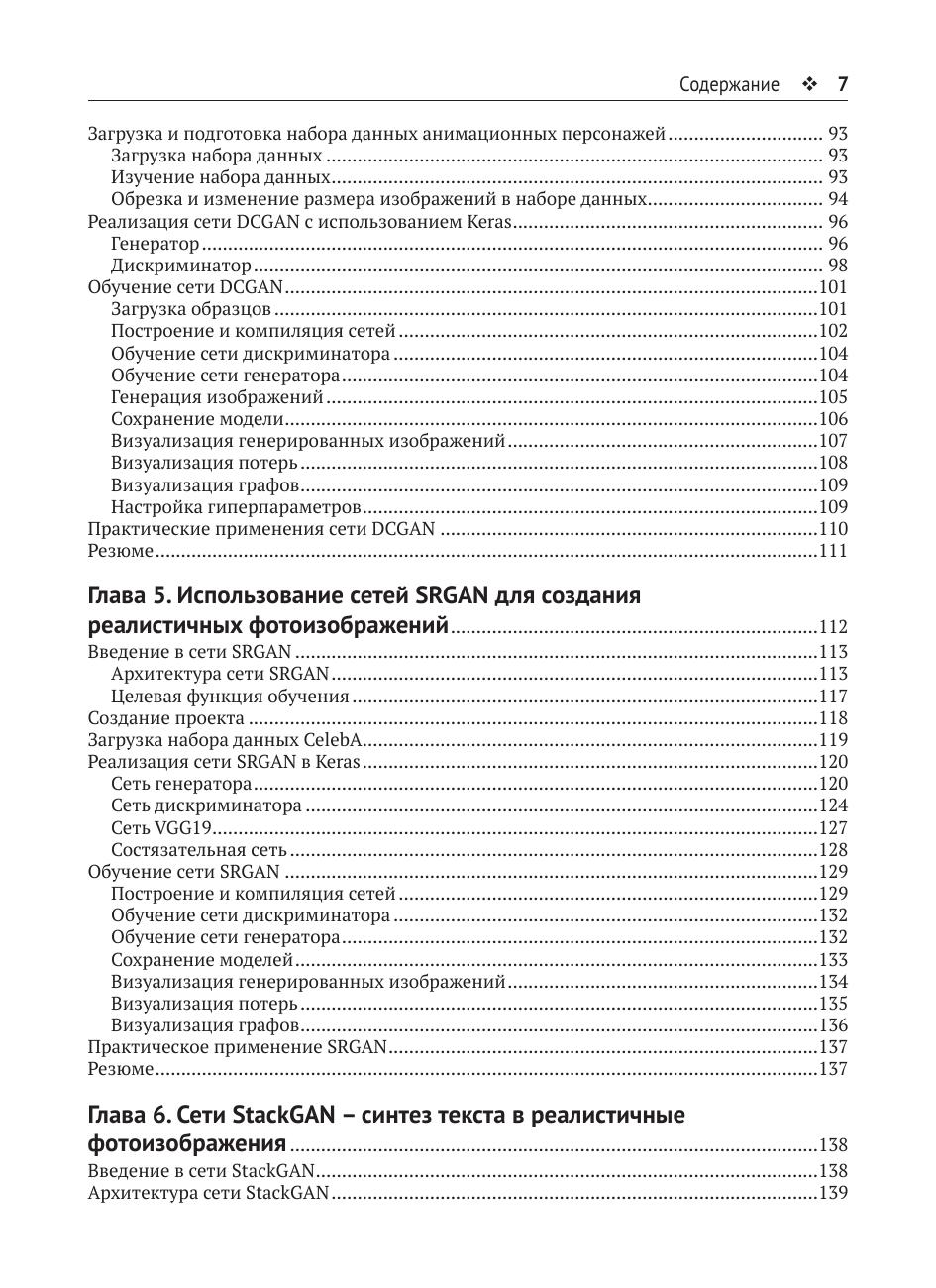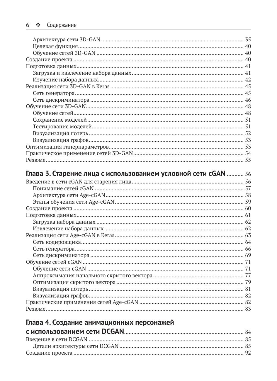 Структура книги предусматривает повышение уровня сложности от главы к главе. Читатель узнает о том, что такое состязательные сети и как они обучаются генерировать 3D-формы, создавать анимационных персонажей и реалистичные фотоизображения, превращать картины в фотографии и делать многое другое.