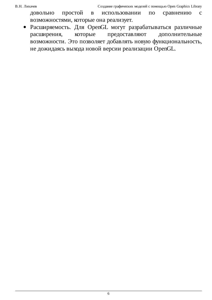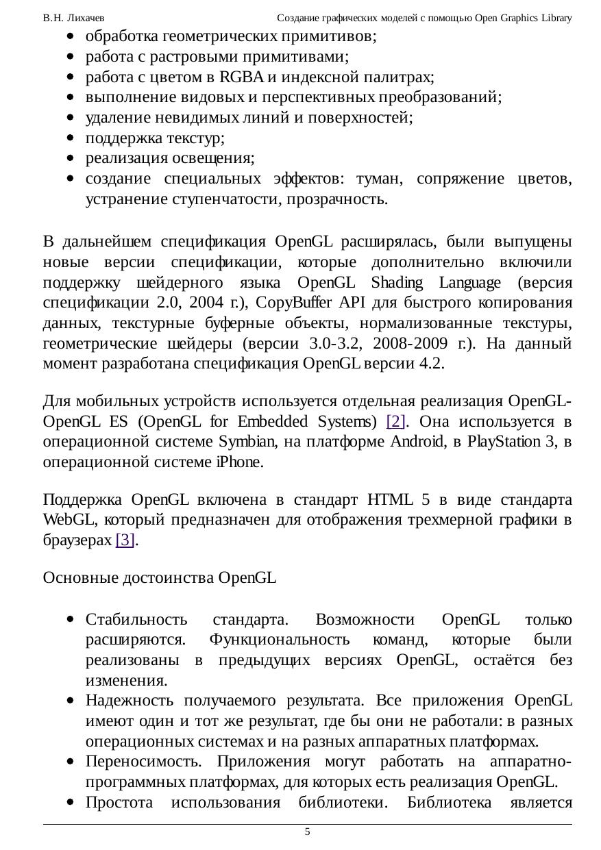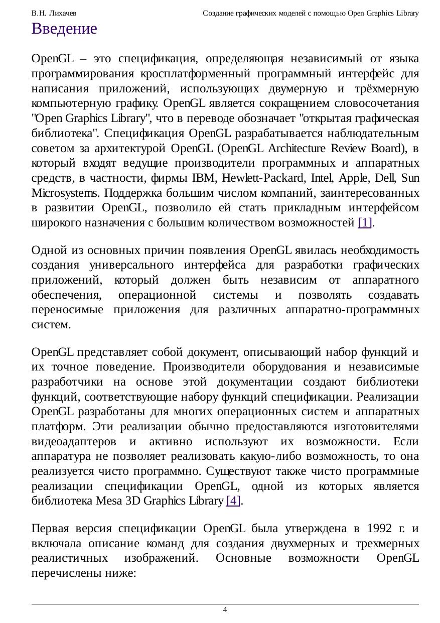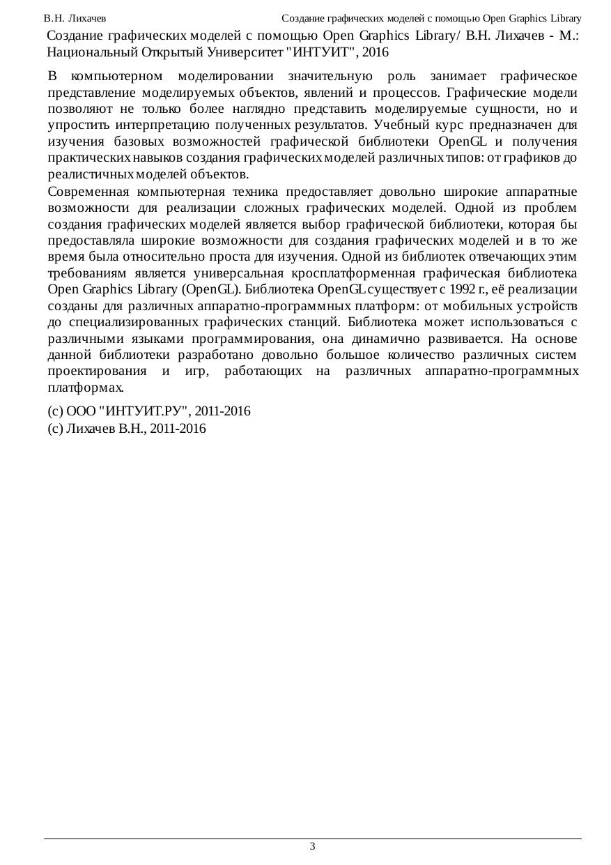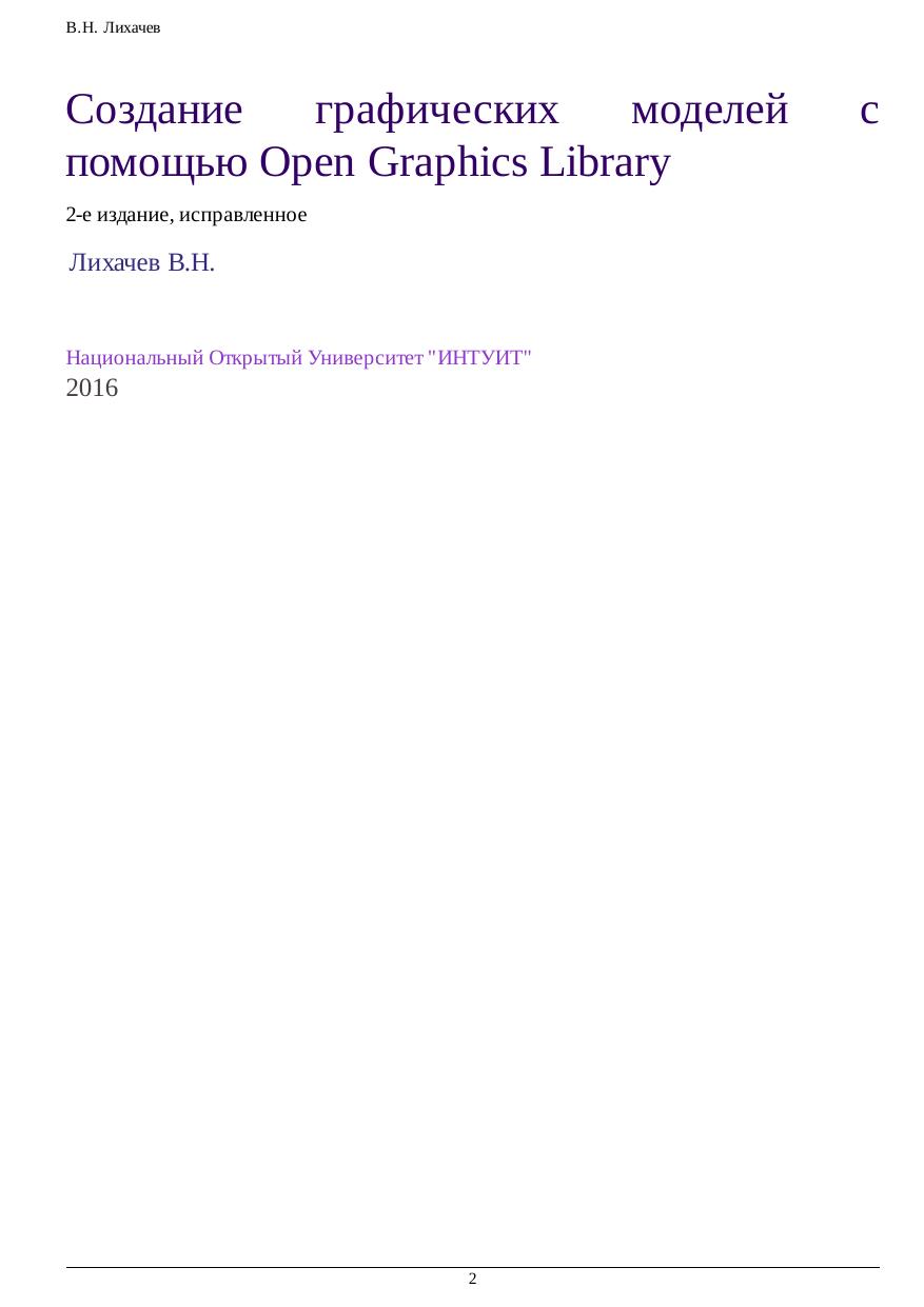 упростить интерпретацию полученных результатов. Учебный курс предназначен для изучения базовых возможностей графической библиотеки OpenGL и получения практических навыков создания графических моделей различных типов: от графиков до реалистичных моделей объектов. Современная компьютерная техника предоставляет довольно широкие аппаратные возможности для реализации сложных графических моделей. Одной из проблем создания графических моделей является выбор графической библиотеки, которая бы предоставляла широкие возможности для создания графических моделей и в то же время была относительно проста для изучения. Одной из библиотек отвечающих этим требованиям является универсальная кросплатформенная графическая библиотека Open Graphics Library (OpenGL). Библиотека OpenGL существует с 1992 г., её реализации созданы для различных аппаратно-программных платформ: от мобильных устройств до специализированных графических станций. Библиотека может использоваться с различными языками программирования, она динамично развивается. На основе данной библиотеки разработано довольно большое количество различных систем проектирования и игр, работающих на различных аппаратно-программных платформах.
