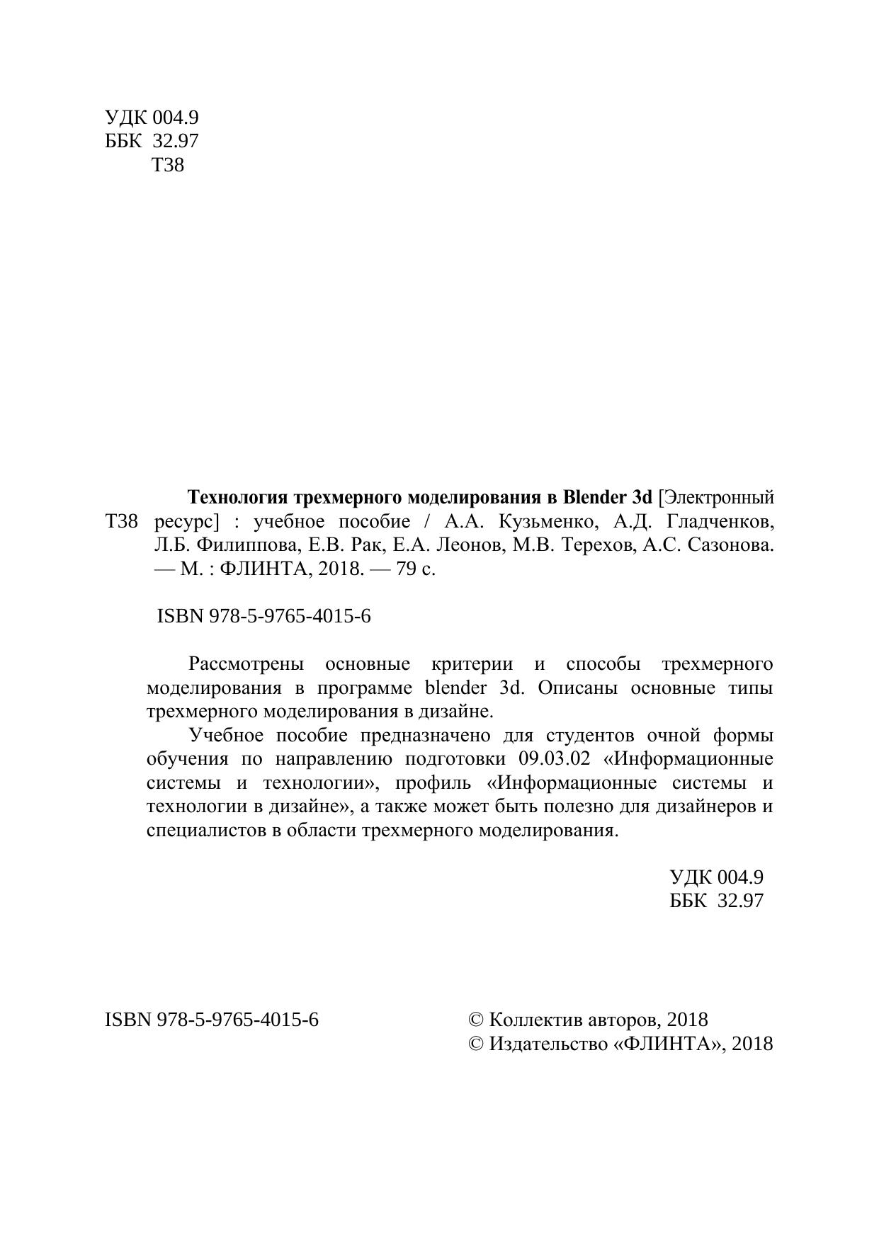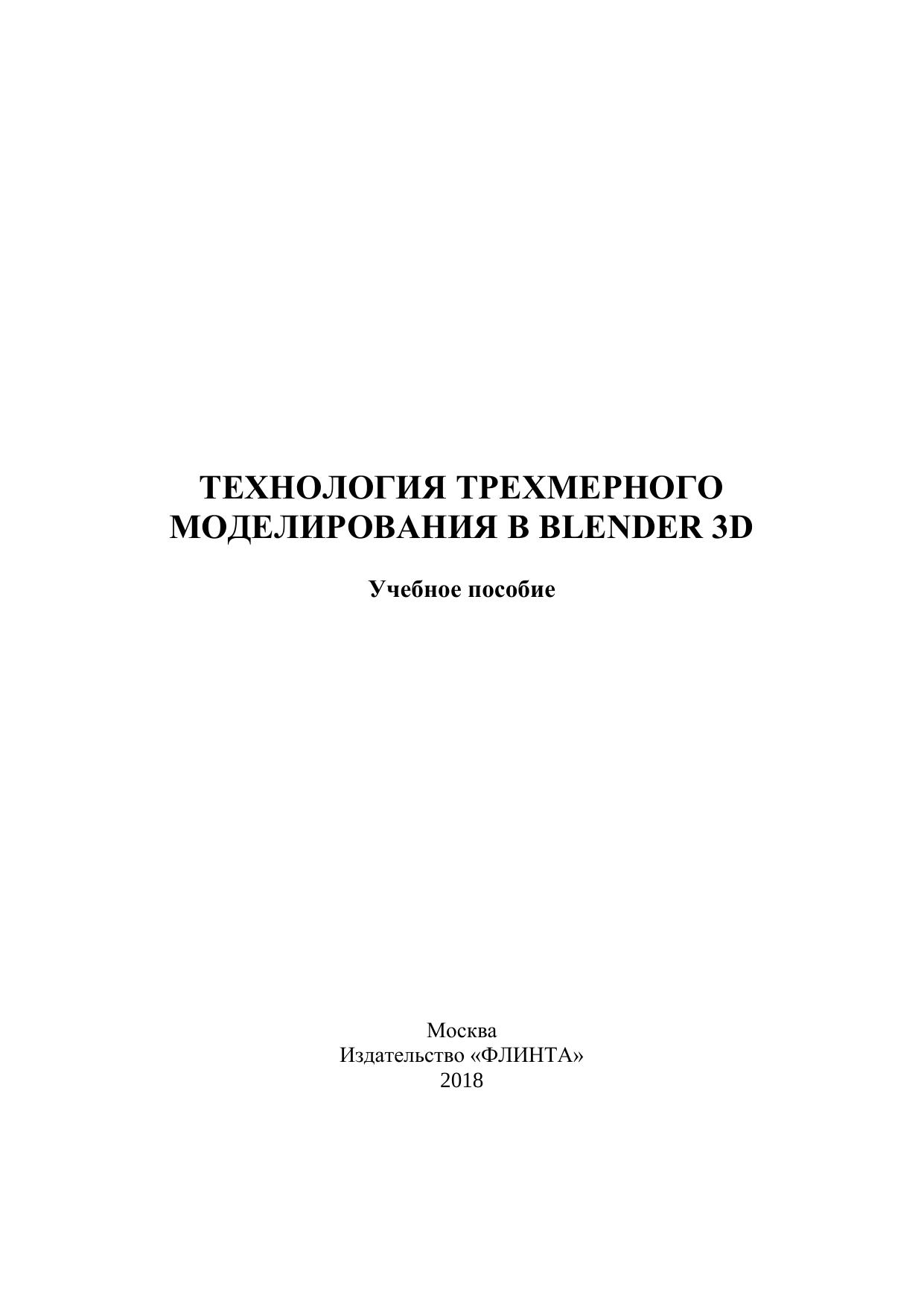 Рассмотрены основные критерии и способы трехмерного моделирования в программе blender 3d. Описаны основные типы трехмерного моделирования в дизайне. Учебное пособие предназначено для студентов очной формы обучения по направлению подготовки 09.03.02 «Информационные системы и технологии», профиль «Информационные системы и технологии в дизайне», а также может быть полезно для дизайнеров и специалистов в области трехмерного моделирования.
