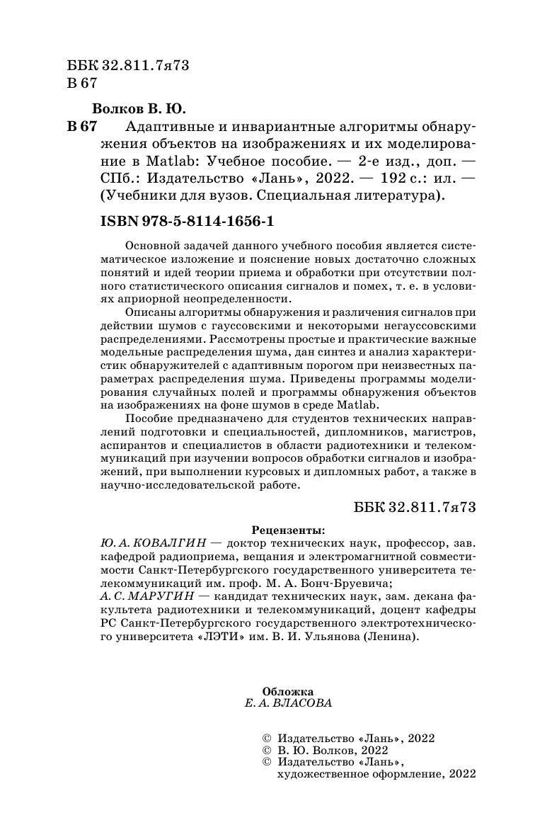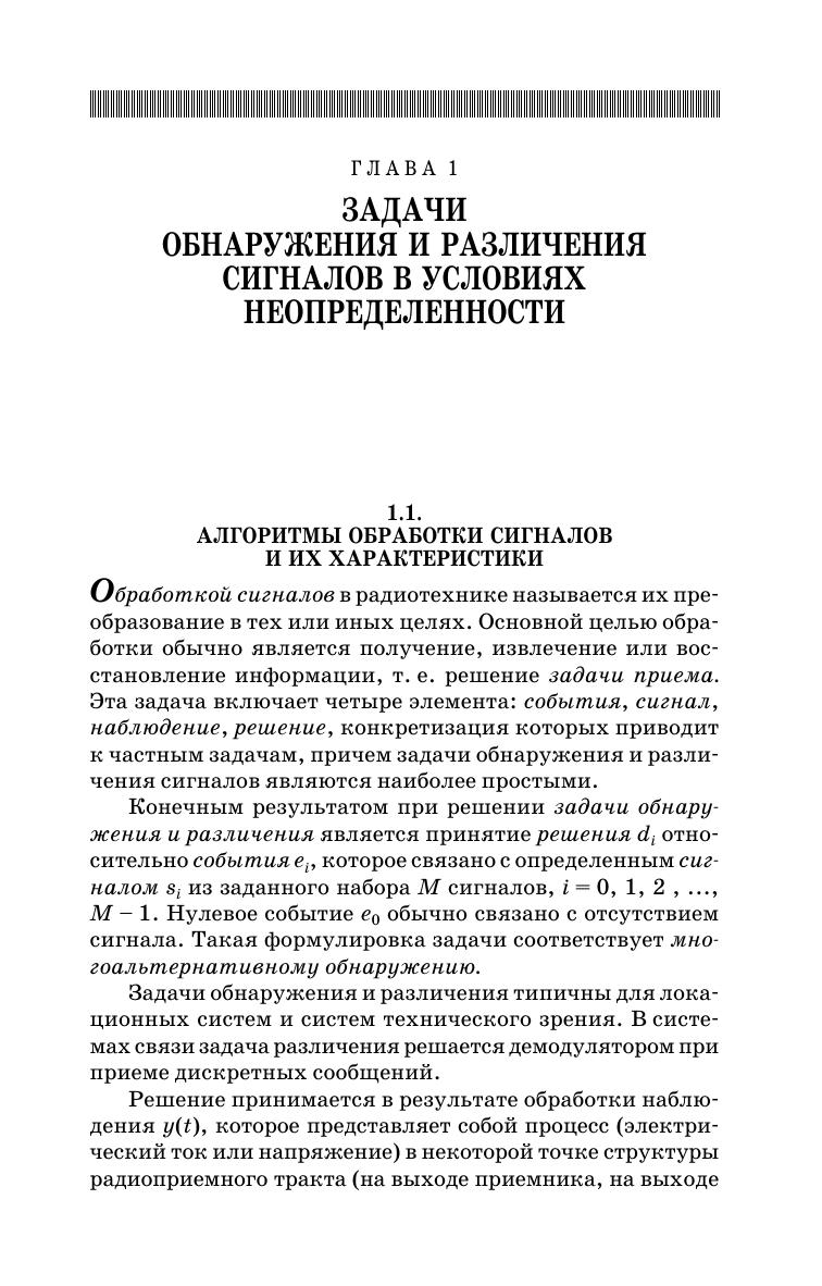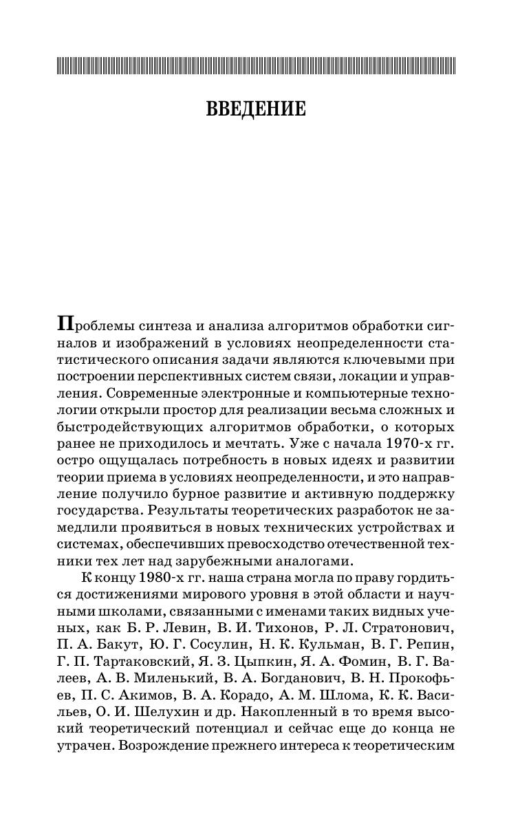 Основной задачей данного учебного пособия является систематическое изложение и пояснение новых достаточно сложных понятий и идей теории приема и обработки при отсутствии полного статистического описания сигналов и помех, т. е. в условиях априорной неопределенности. Описаны алгоритмы обнаружения и различения сигналов при действии шумов с гауссовскими и некоторыми негауссовскими распределениями. Рассмотрены простые и практические важные модельные распределения шума, дан синтез и анализ характеристик обнаружителей с адаптивным порогом при неизвестных параметрах распределения шума. Приведены программы моделирования случайных полей и программы обнаружения объектов на изображениях на фоне шумов в среде Matlab. Пособие предназначено для студентов технических направлений подготовки и специальностей, дипломников, магистров, аспирантов и специалистов в области радиотехники и телекоммуникаций при изучении вопросов обработки сигналов и изображений, при выполнении курсовых и дипломных работ, а также в научно-исследовательской работе.