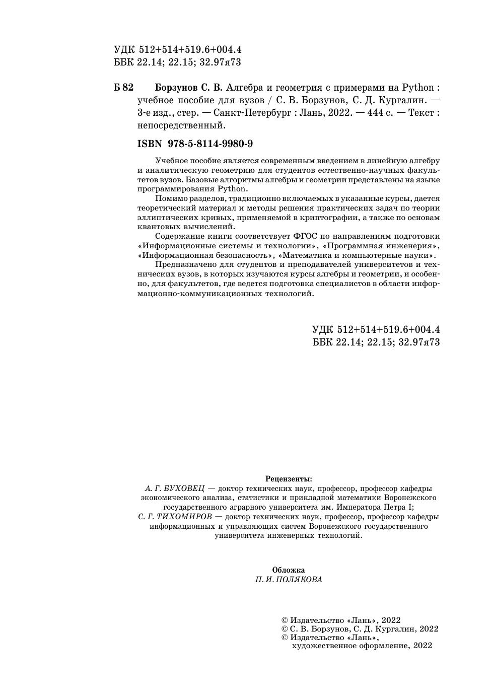 Учебное пособие является современным введением в линейную алгебру и аналитическую геометрию для студентов естественно-научных факультетов вузов. Базовые алгоритмы алгебры и геометрии представлены на языке программирования Python.Помимо разделов, традиционно включаемых в указанные курсы, дается теоретический материал и методы решения практических задач по теории эллиптических кривых, применяемой в криптографии, а также по основам квантовых вычислений.Содержание книги соответствует ФГОС по направлениям подготовки Информационные системы и технологии, Программная инженерия, Информационная безопасность, Математика и компьютерные науки.Предназначено для студентов и преподавателей университетов и технических вузов, в которых изучаются курсы алгебры и геометрии, и особенно, для факультетов, где ведется подготовка специалистов в области информационно-коммуникационных технологий.