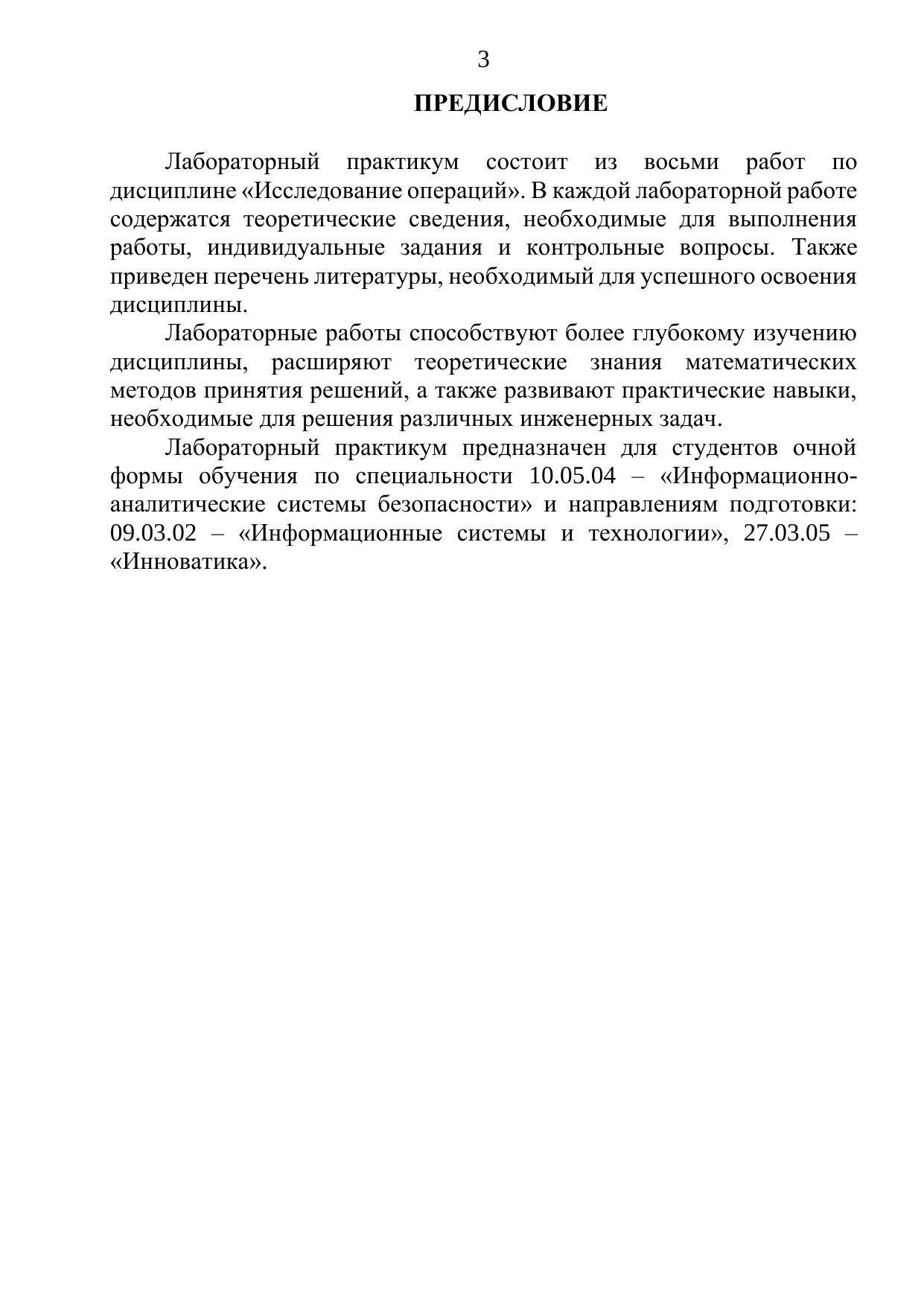 Содержатся восемь лабораторных работ по дисциплине «Исследование операций». Лабораторный практикум предназначен для студентов очной формы обучения по специальности 10.05.04 – «Информационно- аналитические системы безопасности» и направлениям подготовки: 09.03.02 – «Информационные системы и технологии», 27.03.05 – «Инноватика».