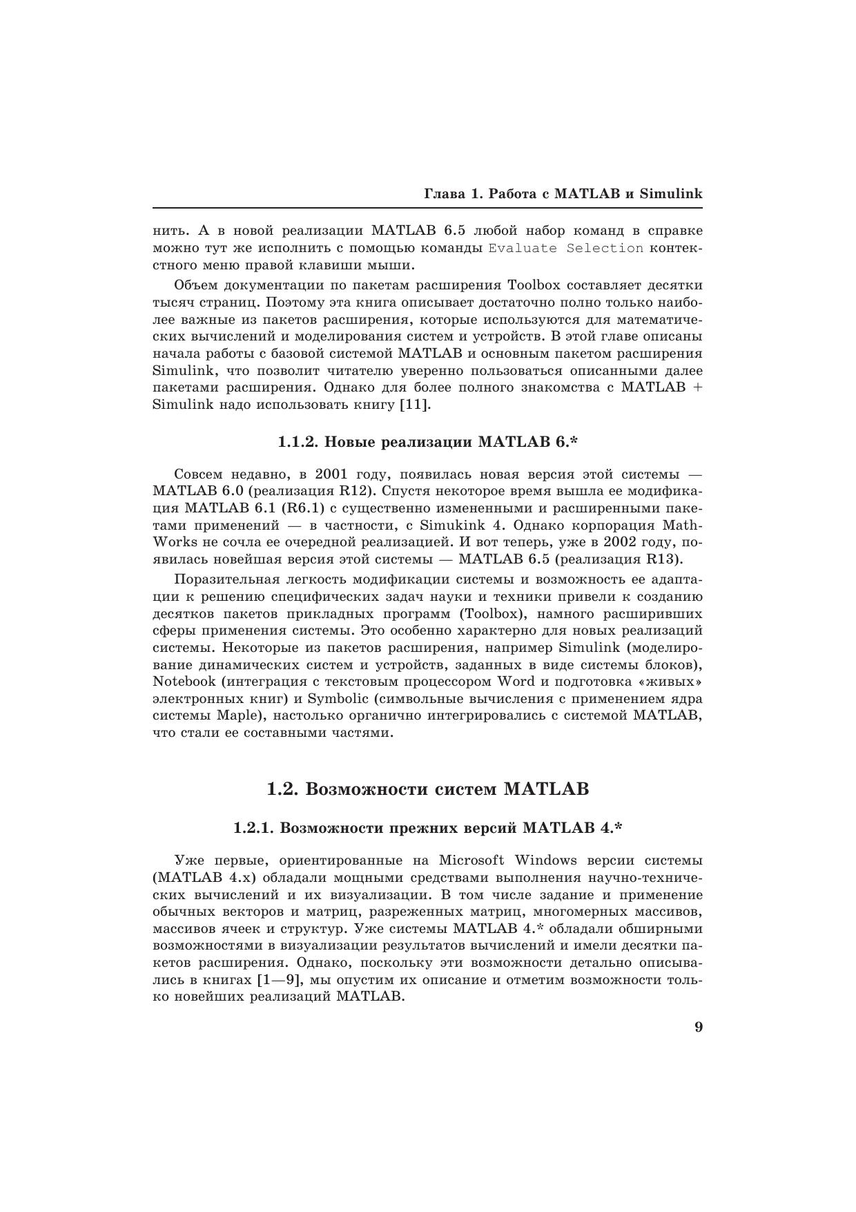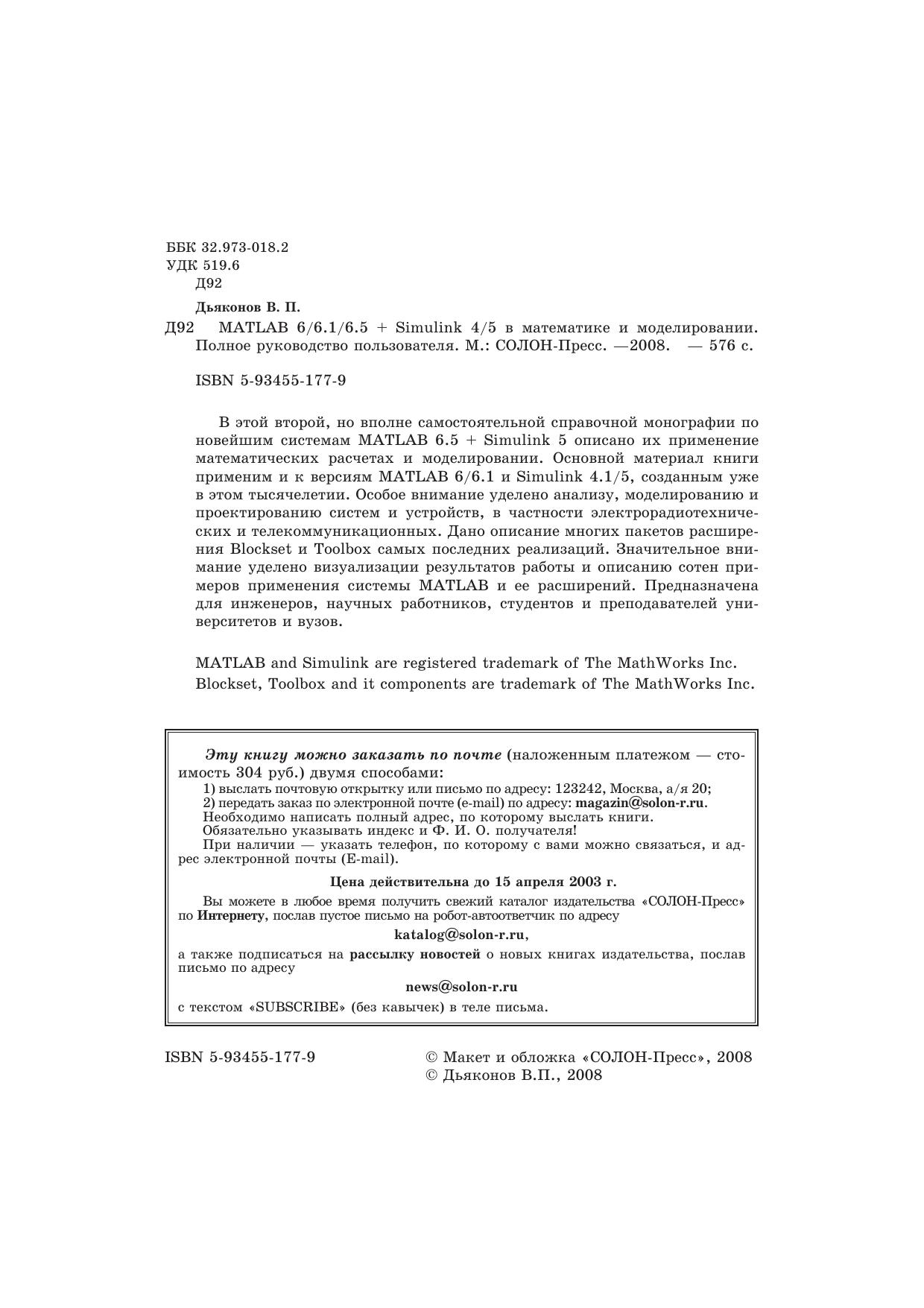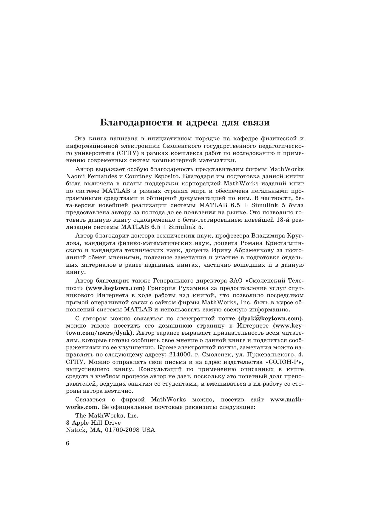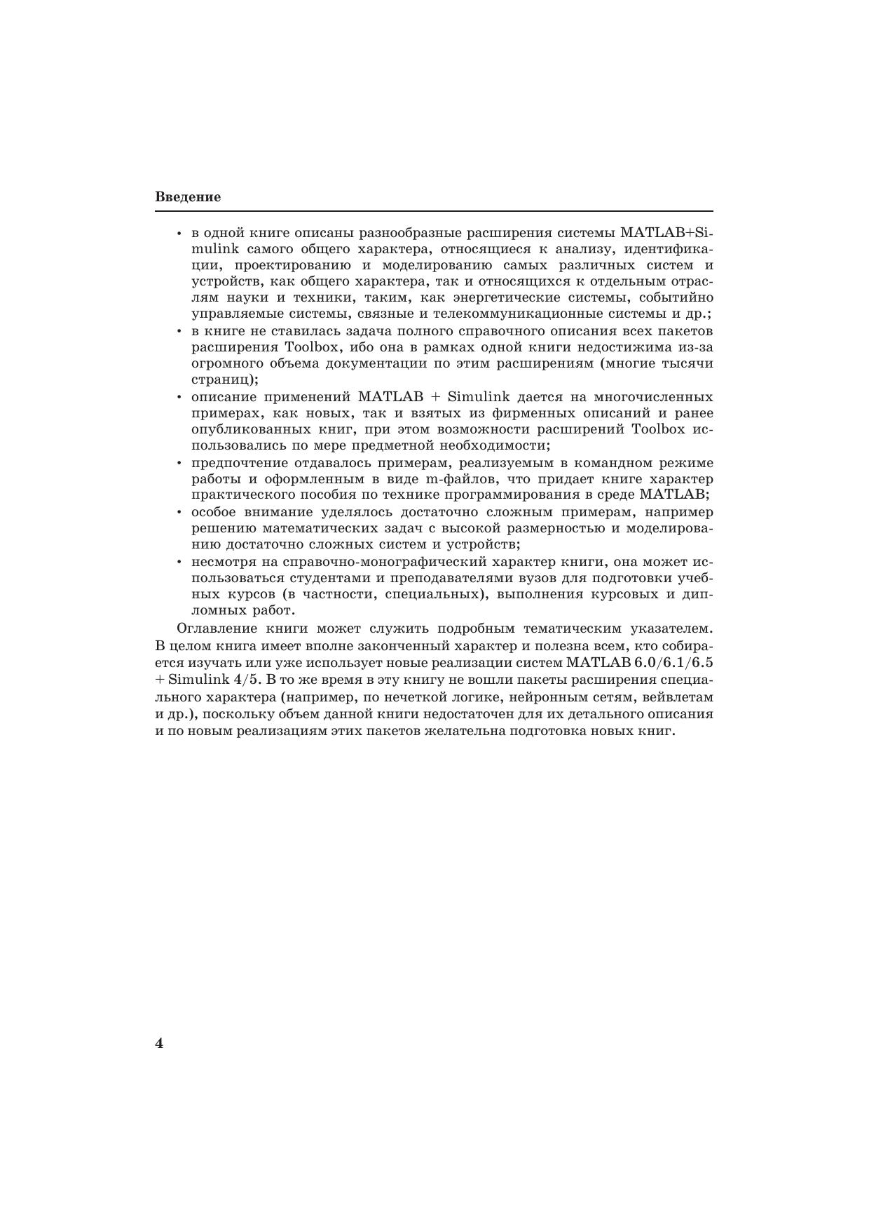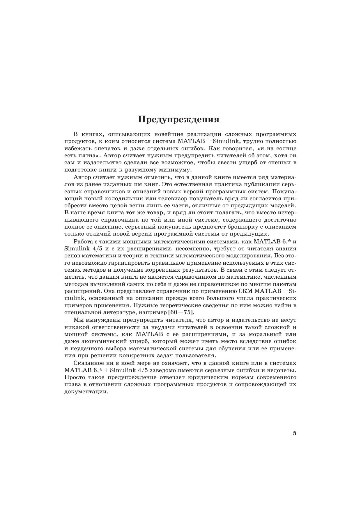 В этой второй, но вполне самостоятельной справочной монографии по новейшим системам MATLAB 6.5 + Simulink 5 описано их применение математических расчетах и моделировании. Основной материал книги применим и к версиям MATLAB 6/6.1 и Simulink 4.1/5, созданным уже в этом тысячелетии. Особое внимание уделено анализу, моделированию и проектированию систем и устройств, в частности электрорадиотехнических и телекоммуникационных. Дано описание многих пакетов расширения Blockset и Toolbox самых последних реализаций. Значительное внимание уделено визуализации результатов работы и описанию сотен примеров применения системы MATLAB и ее расширений. Предназначена для инженеров, научных работников, студентов и преподавателей университетов и вузов.