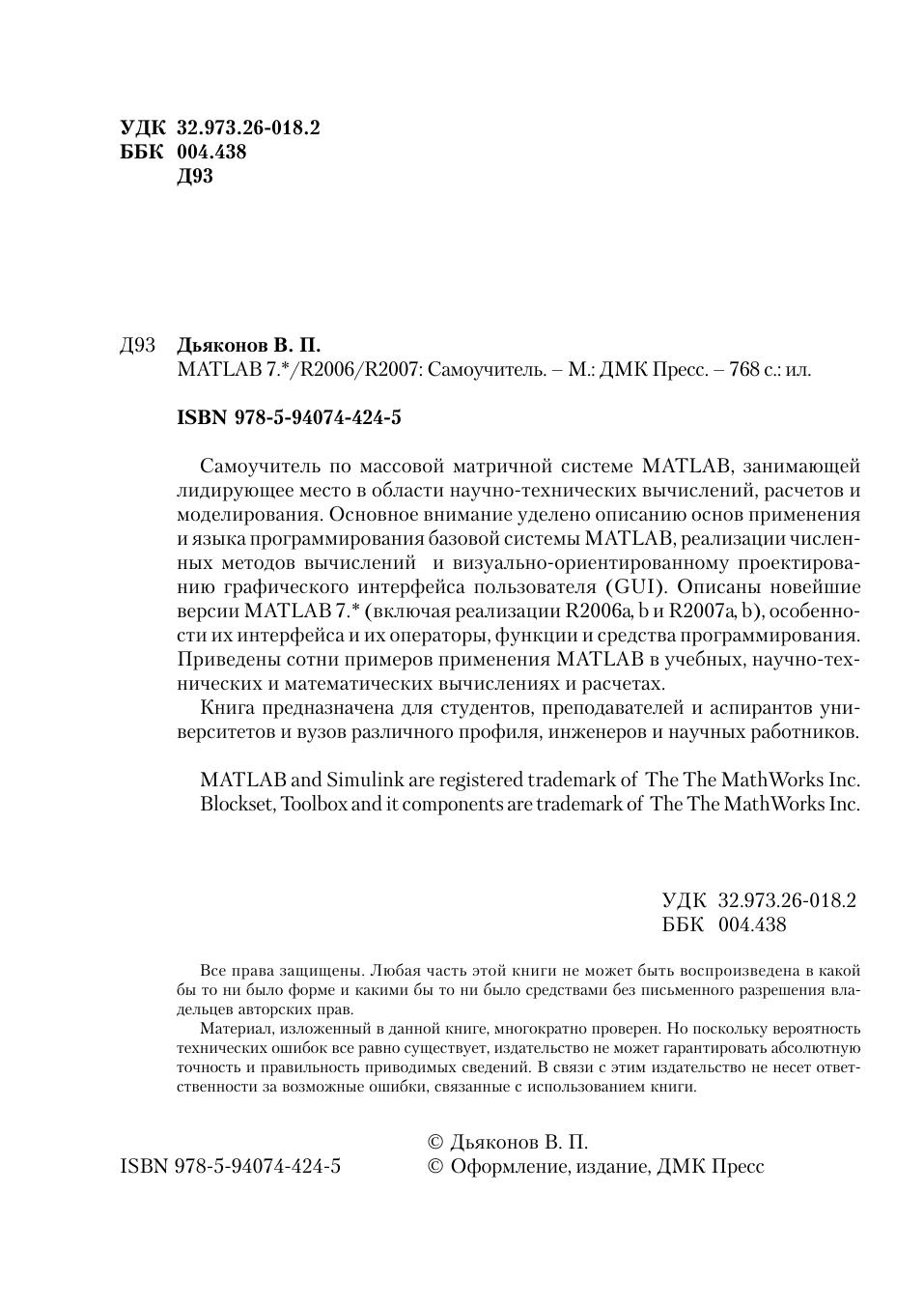 Самоучитель по массовой матричной системе MATLAB, занимающей лидирующее место в области научно-технических вычислений, расчетов и моделирования. Основное внимание уделено описанию основ применения и языка программирования базовой системы MATLAB, реализации численных методов вычислений и визуально- ориентированному проектированию графического интерфейса пользователя (GUI). Описаны новейшие версии MATLAB 7.* (включая реализации R2006a, b и R2007a, b), особенности их интерфейса и их операторы, функции и средства программирования. Приведены сотни примеров применения MATLAB в учебных, научно-технических и математических вычислениях и расчетах. Книга предназначена для студентов, преподавателей и аспирантов университетов и вузов различного профиля, инженеров и научных работников.