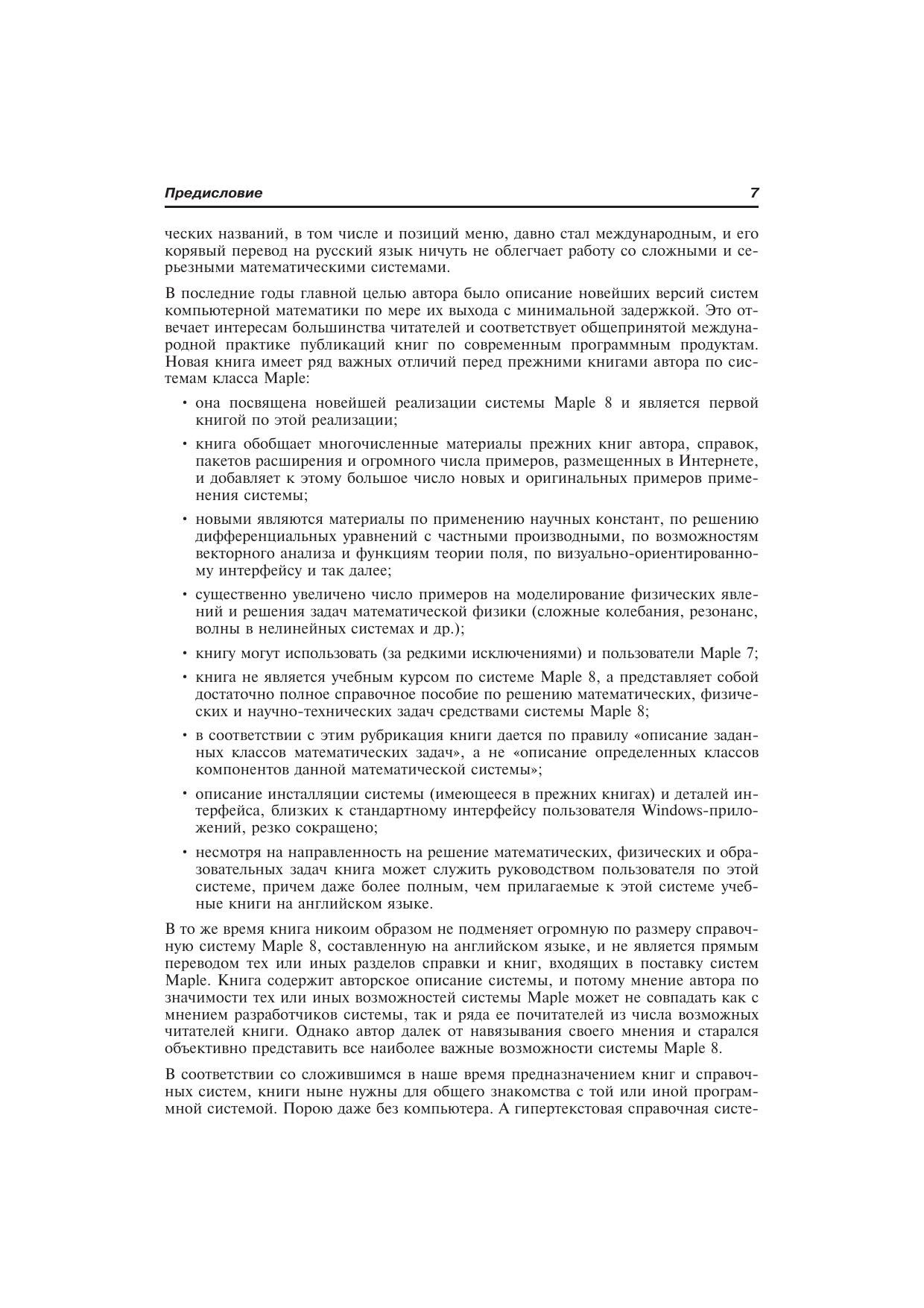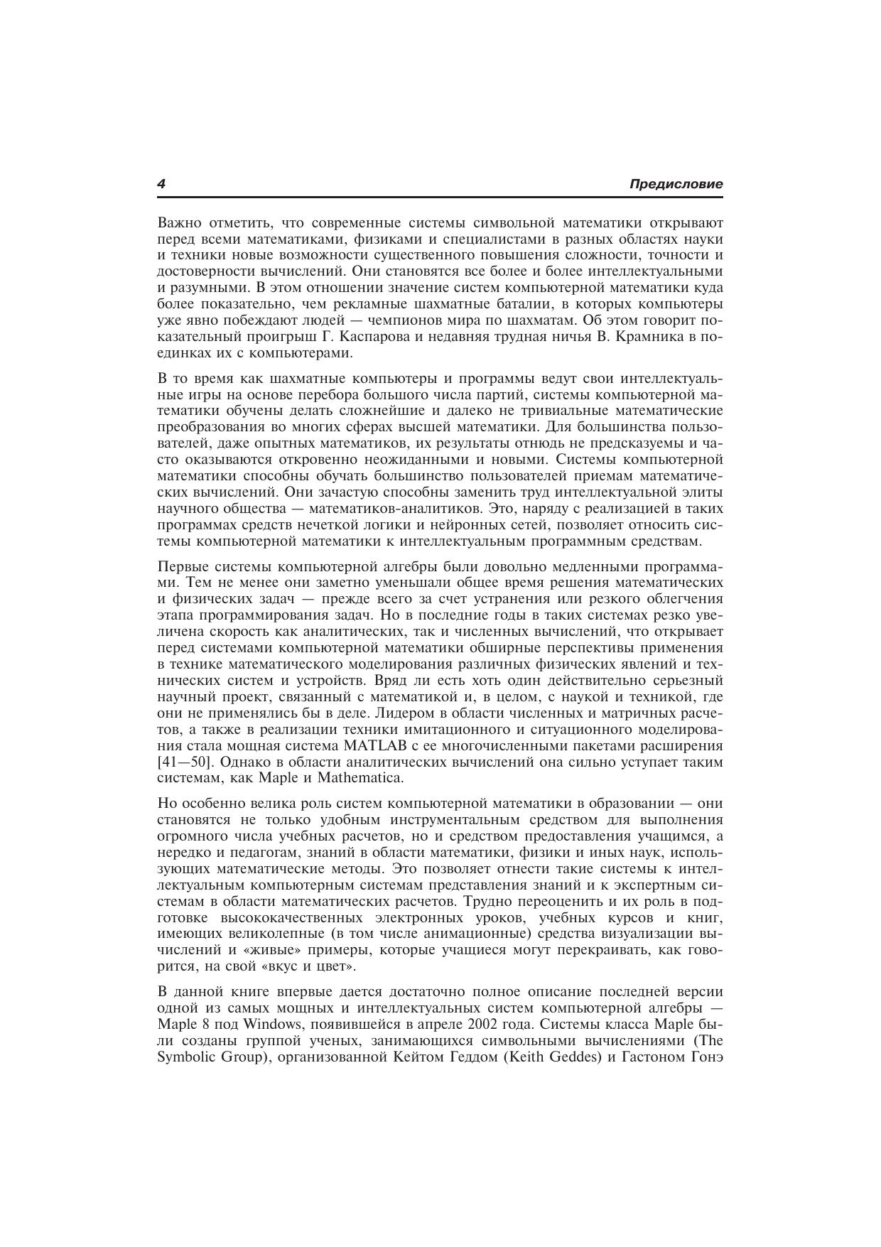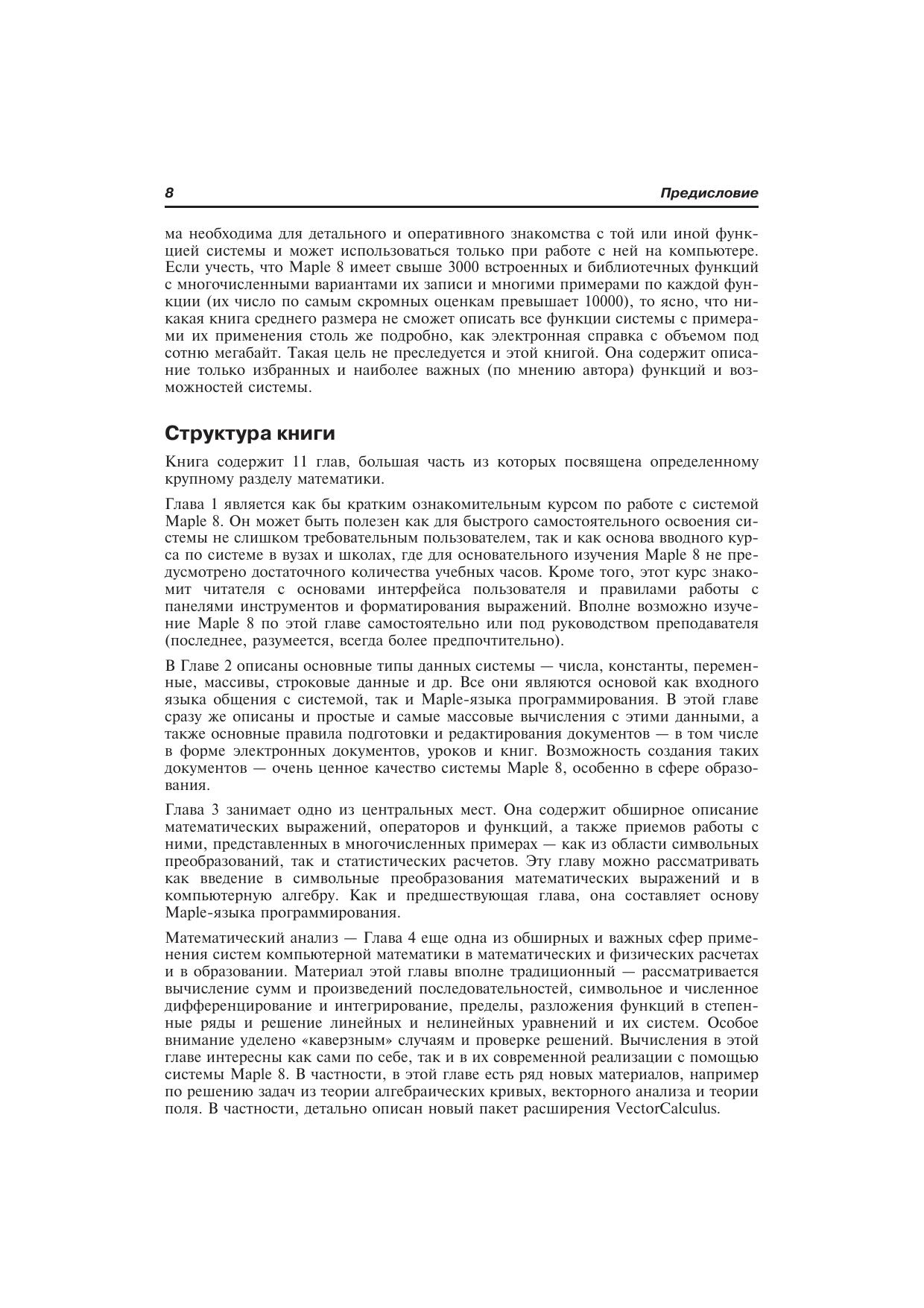 Книга является справочной монографией и руководством пользователя по новейшей системе символьной (аналитической) математики — Maple 8. Эта система — признанный мировой лидер в области символьных (аналитических) вычислений. Она в максимальной степени прошла сертификацию в этой области. Кратко описан интерфейс системы и подробно — ее обширные возможности в математике, физике и образовании. Особое внимание уделено технике практических вычислений и визуализации их результатов. Подробно и на большом числе практических примеров, в том числе ранее не публиковавшихся, описаны средства символьных и численных вычислений, графические и программные возможности системы, пакеты ее расширения. Для всех научно-технических работников, студентов и преподавателей университетов и вузов.