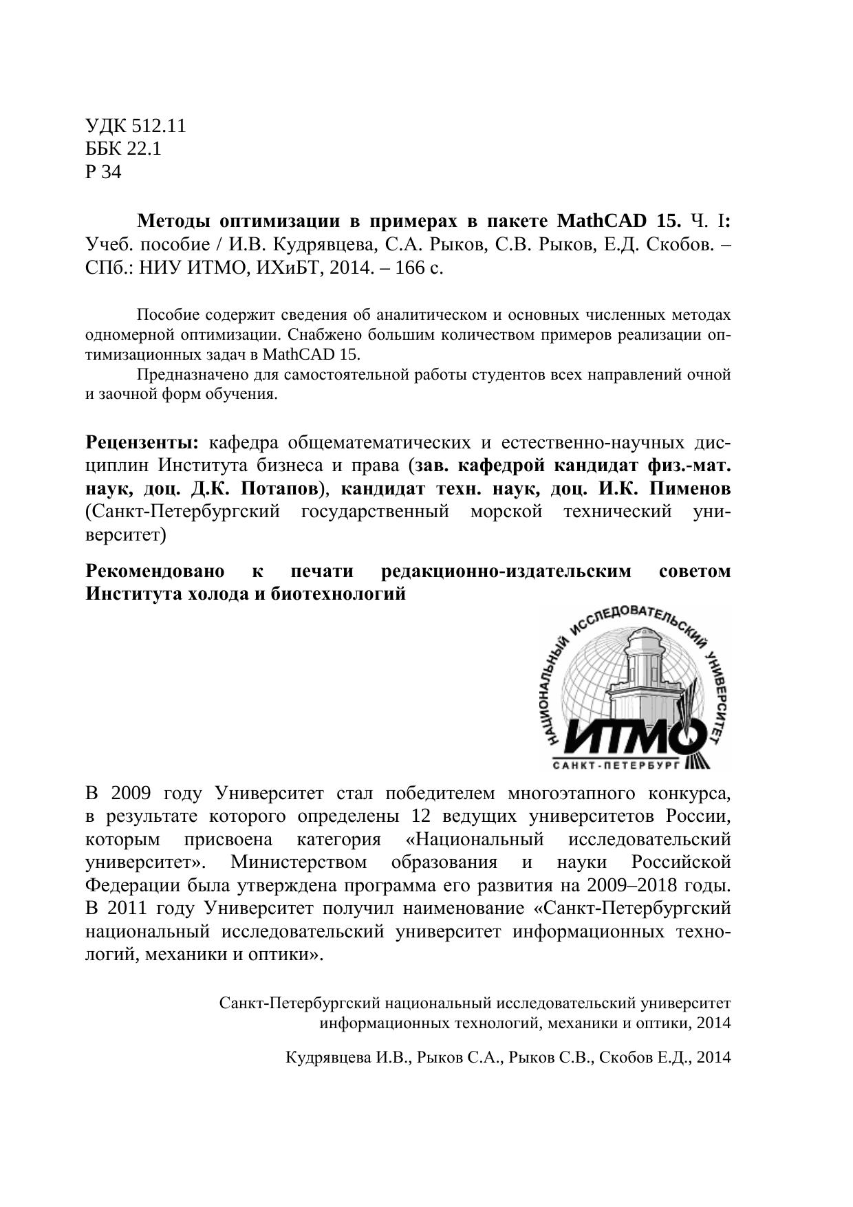 Методы оптимизации в примерах в пакете MathCAD 15. Ч. I