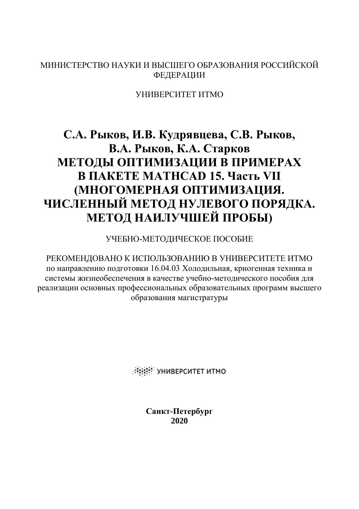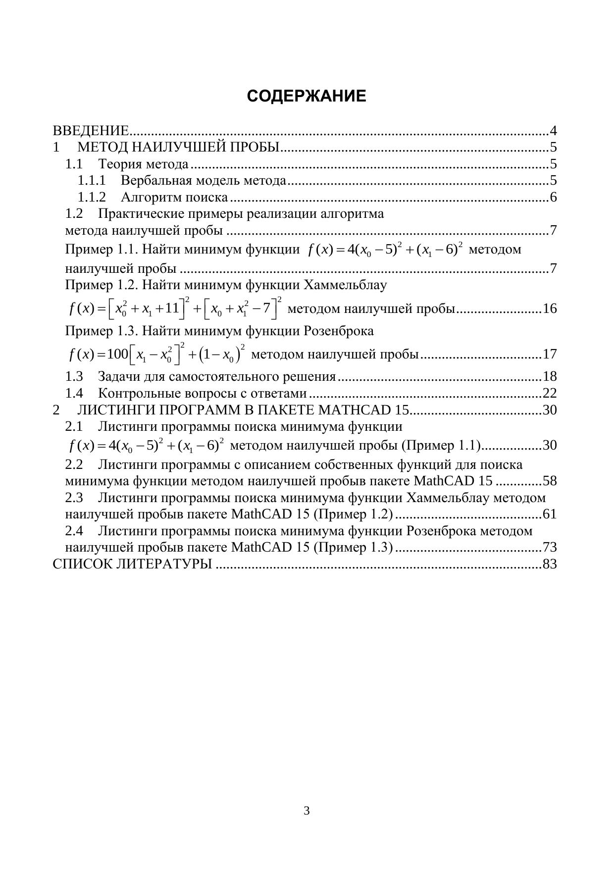 Пособие содержит сведения о численном методе многомерной безусловной оптимизации нулевого порядка – методе наилучшей пробы. Снабжено большим количеством примеров реализации оптимизационных задач, рассмотренных как численно при пошаговой реализации и с помощью функции написанной пользователем, так и с использованием функций пакета MathCAD 15. В пособии приведены задачи для самостоятельного решения и тестовые вопросы с подробными пояснениями по изучаемому методу. Предназначено для самостоятельной работы студентов и аспирантов вузов очной и заочной форм обучения.