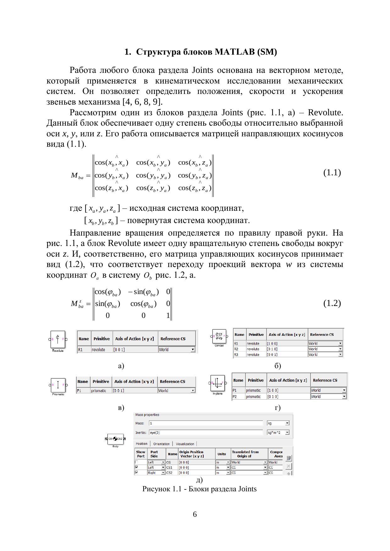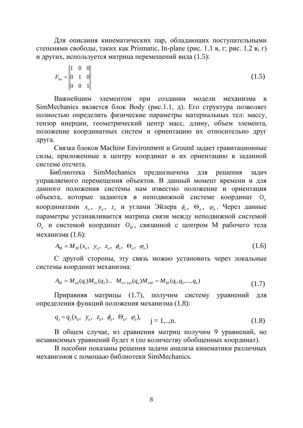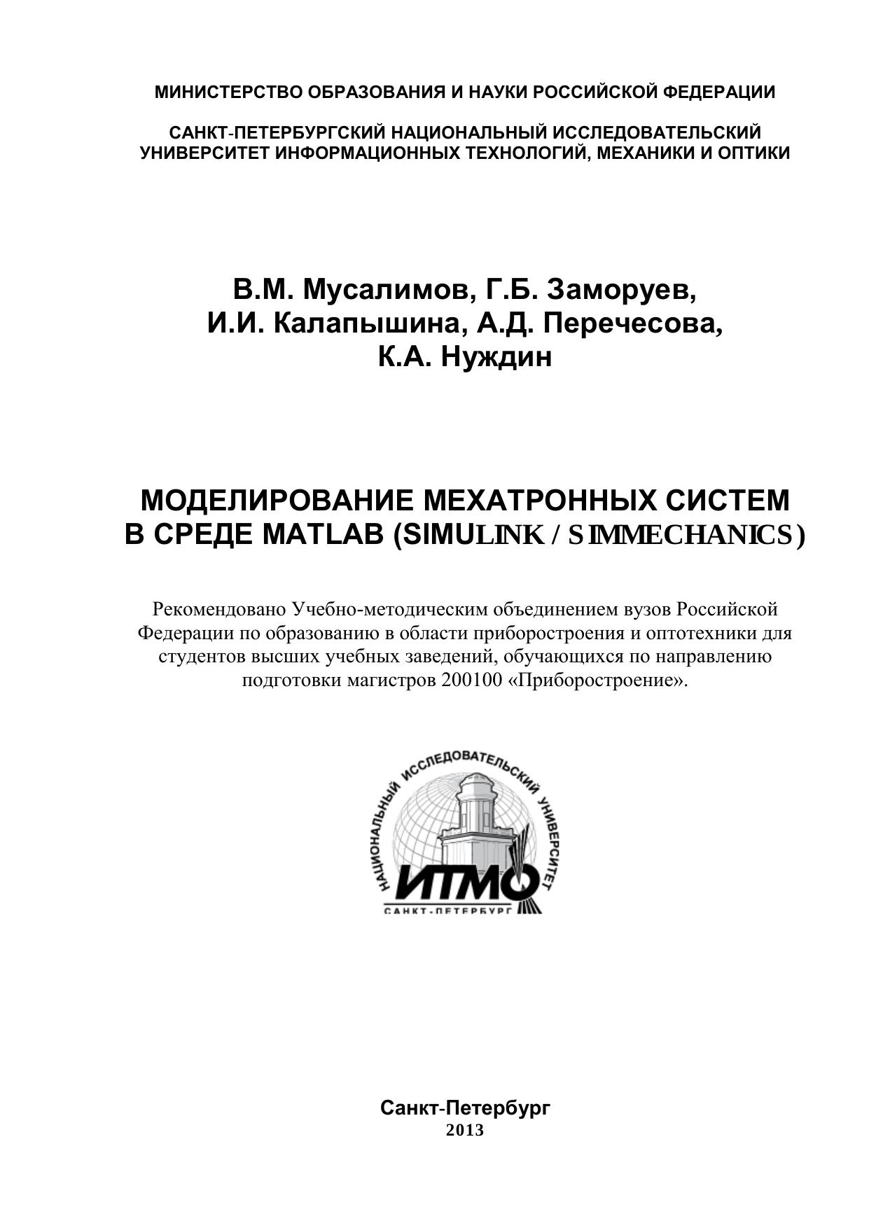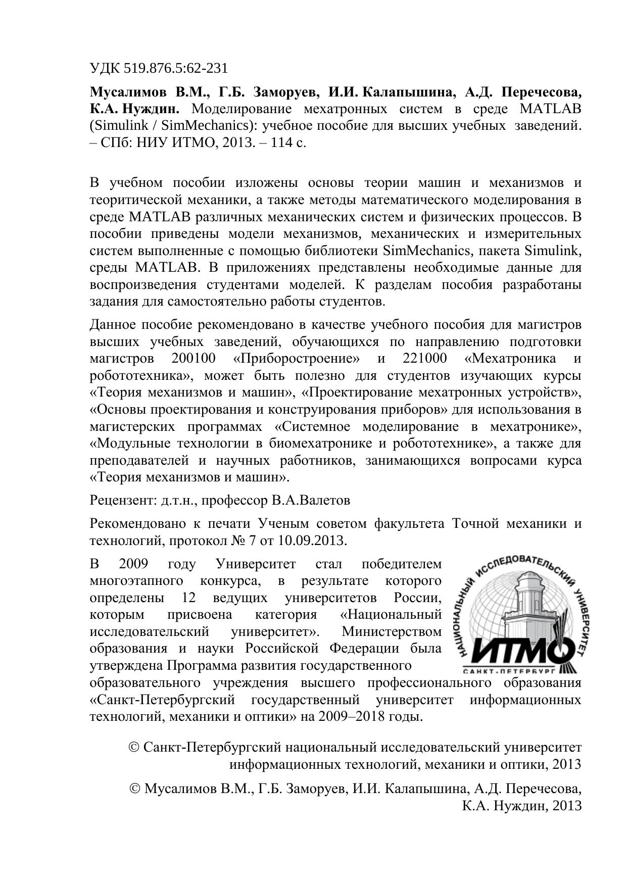 В учебном пособии изложены основы теории машин и механизмов и теоритической механики, а также методы математического моделирования в среде MATLAB различных механических систем и физических процессов. В пособии приведены модели механизмов, механических и измерительных систем выполненные с помощью библиотеки SimMechanics, пакета Simulink, среды MATLAB. В приложениях представлены необходимые данные для воспроизведения студентами моделей. К разделам пособия разработаны задания для самостоятельно работы студентов. Данное пособие рекомендовано в качестве учебного пособия для магистров высших учебных заведений, обучающихся по направлению подготовки магистров 200100 «Приборостроение» и 221000 «Мехатроника и робототехника», может быть полезно для студентов изучающих курсы «Теория механизмов и машин», «Проектирование мехатронных устройств», «Основы проектирования и конструирования приборов» для использования в магистерских программах «Системное моделирование в мехатронике», «Модульные технологии в биомехатронике и робототехнике», а также для преподавателей и научных работников, занимающихся вопросами курса «Теория механизмов и машин».