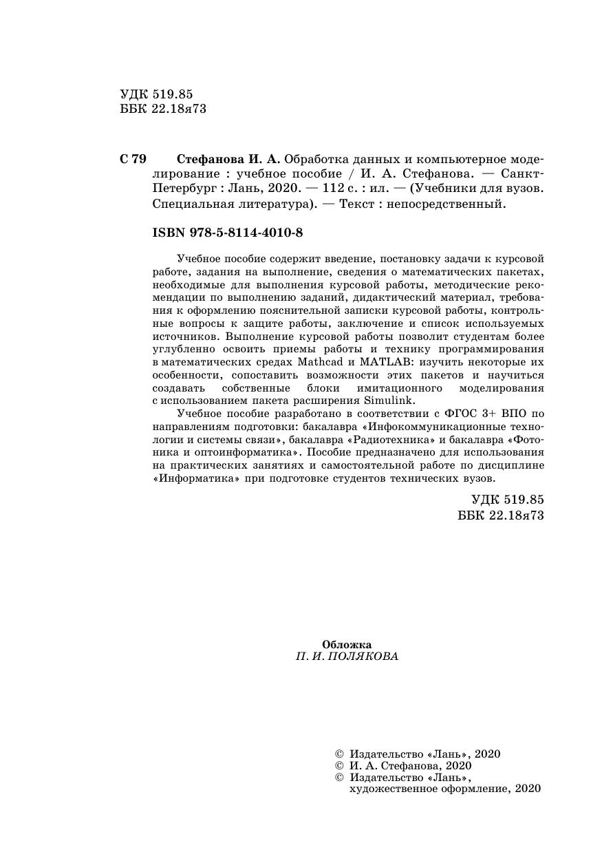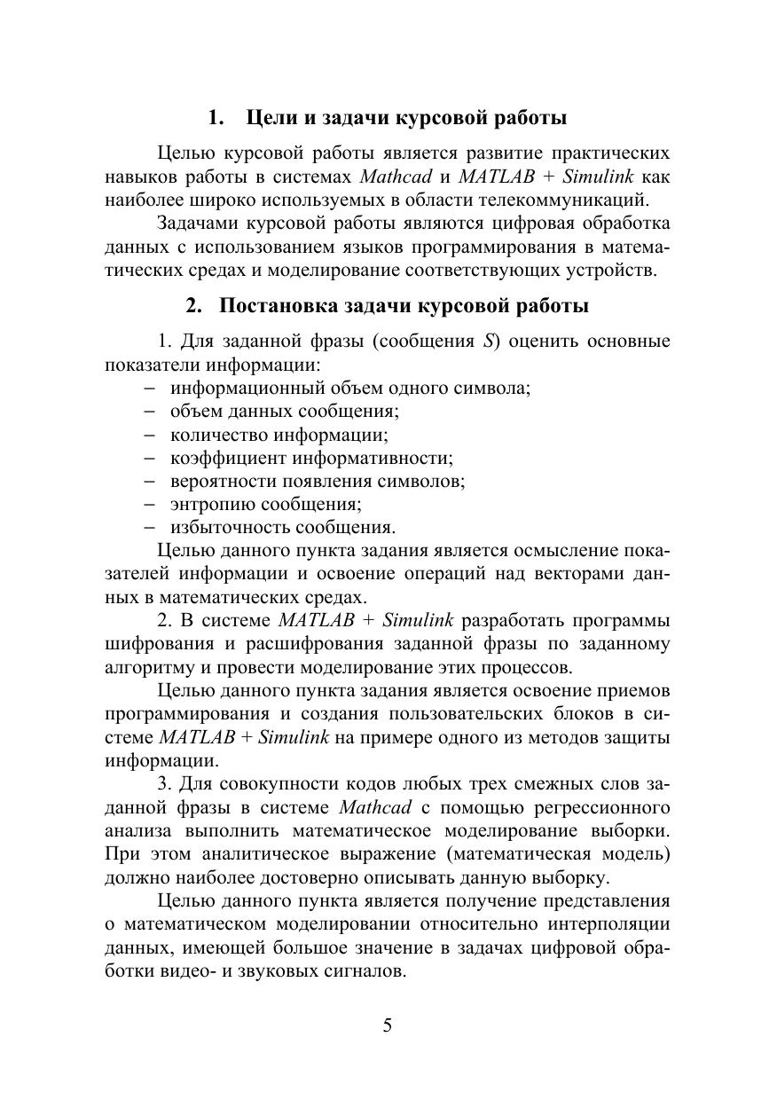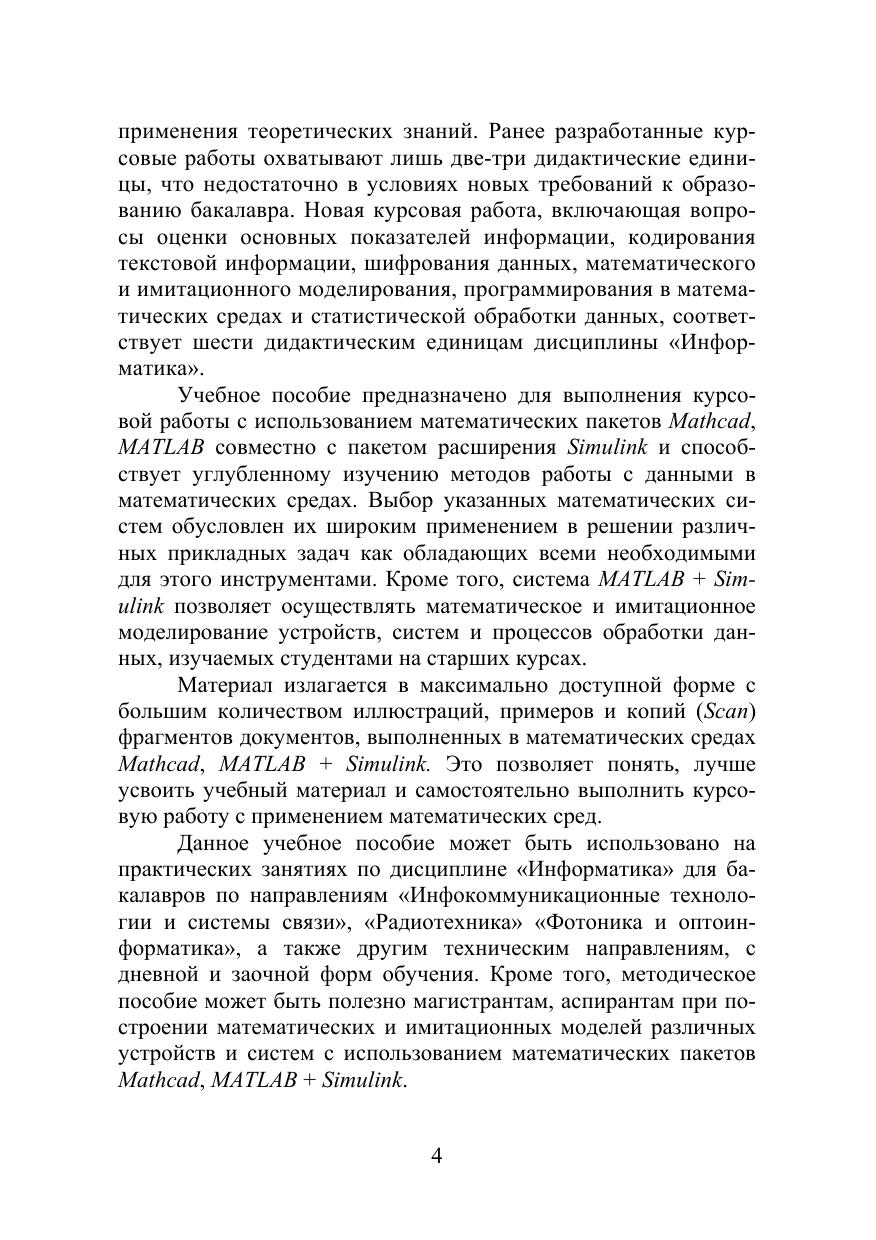 Учебное пособие содержит введение, постановку задачи к курсовой работе, задания на выполнение, сведения о математических пакетах, необходимые для выполнения курсовой работы, методические рекомендации по выполнению заданий, дидактический материал, требова-ния к оформлению пояснительной записки курсовой работы, контрольные вопросы к защите работы, заключение и список используемых источников. Выполнение курсовой работы позволит студентам более углубленно освоить приемы работы и технику программирования в математических средах Mathcad и MATLAB: изучить некоторые их особенности, сопоставить возможности этих пакетов и научиться создавать собственные блоки имитационного моделирования с использованием пакета расширения Simulink.